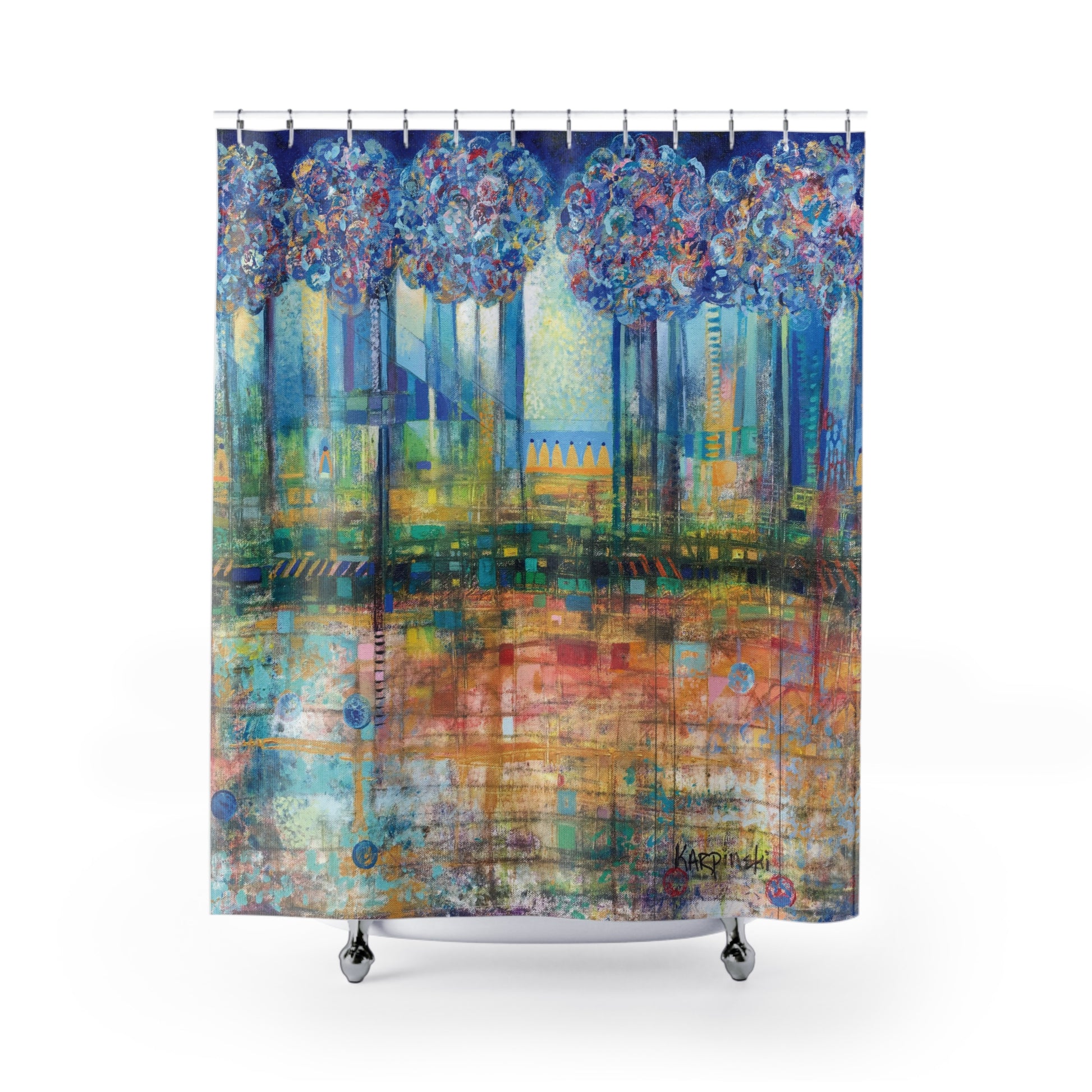Rise up to the Gates of Glory is an original painting by Leslie Karpinski now available printed on a 100% polyester shower curtain. The shower curtain is printed in North Carolina on an imported blank. A plastic liner is recommended.