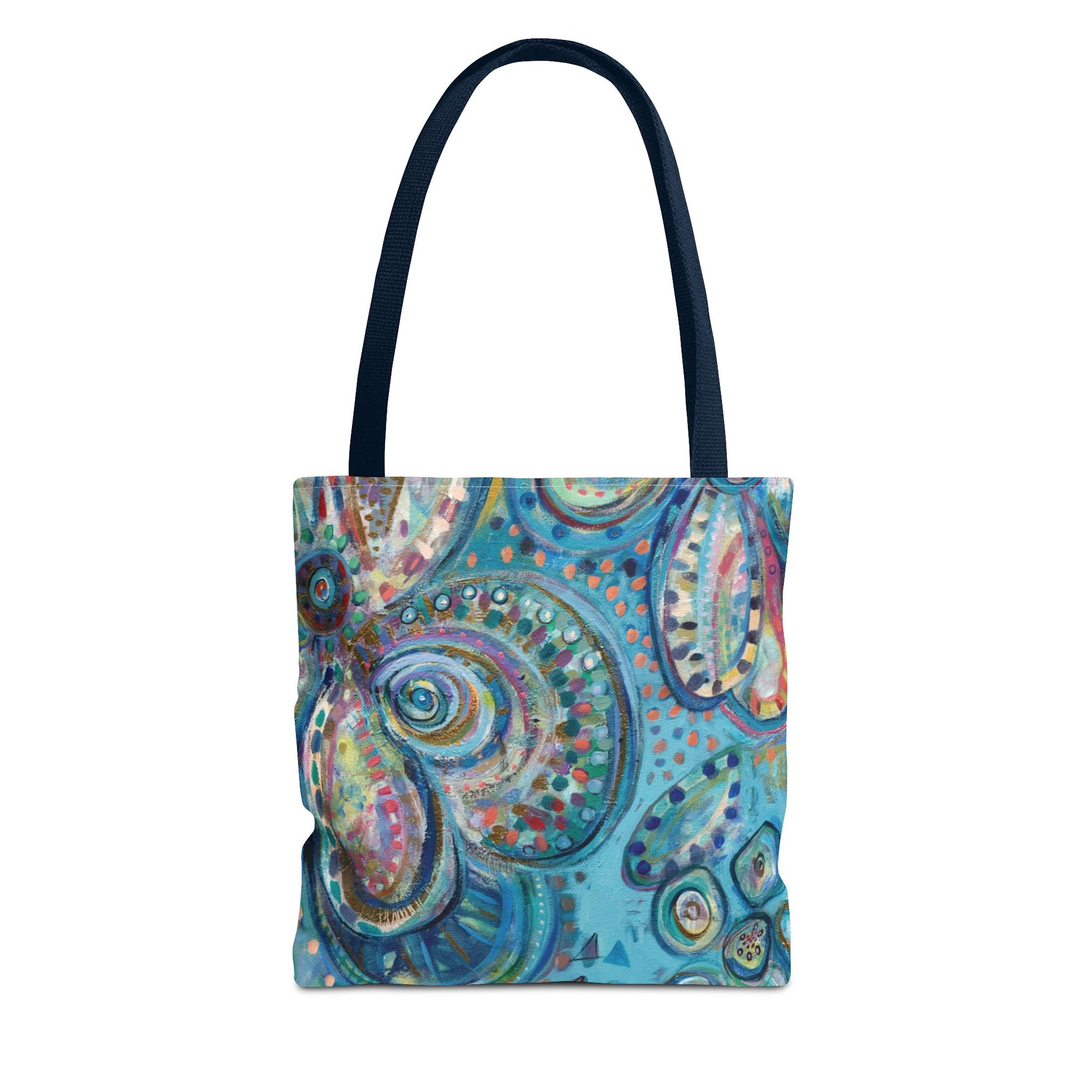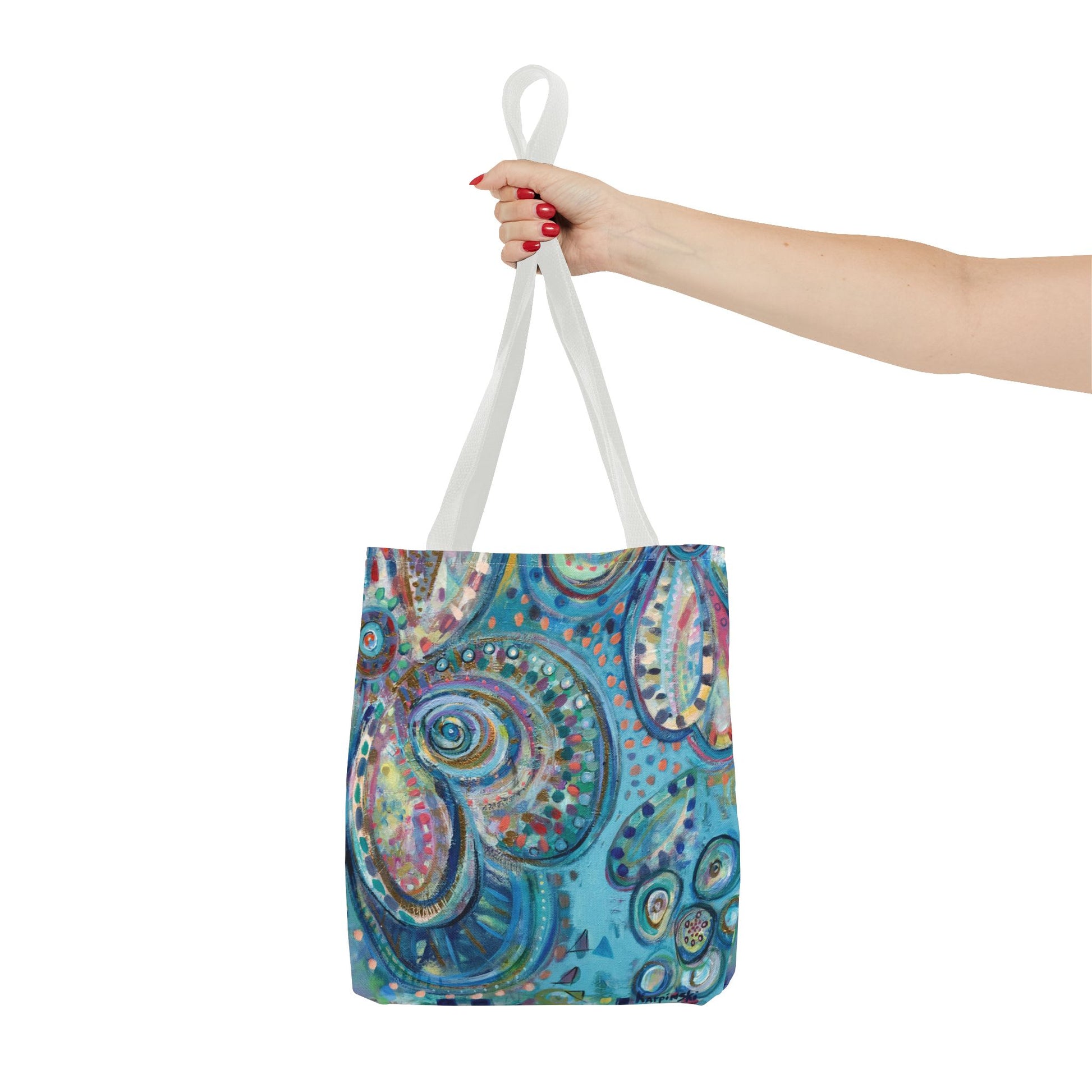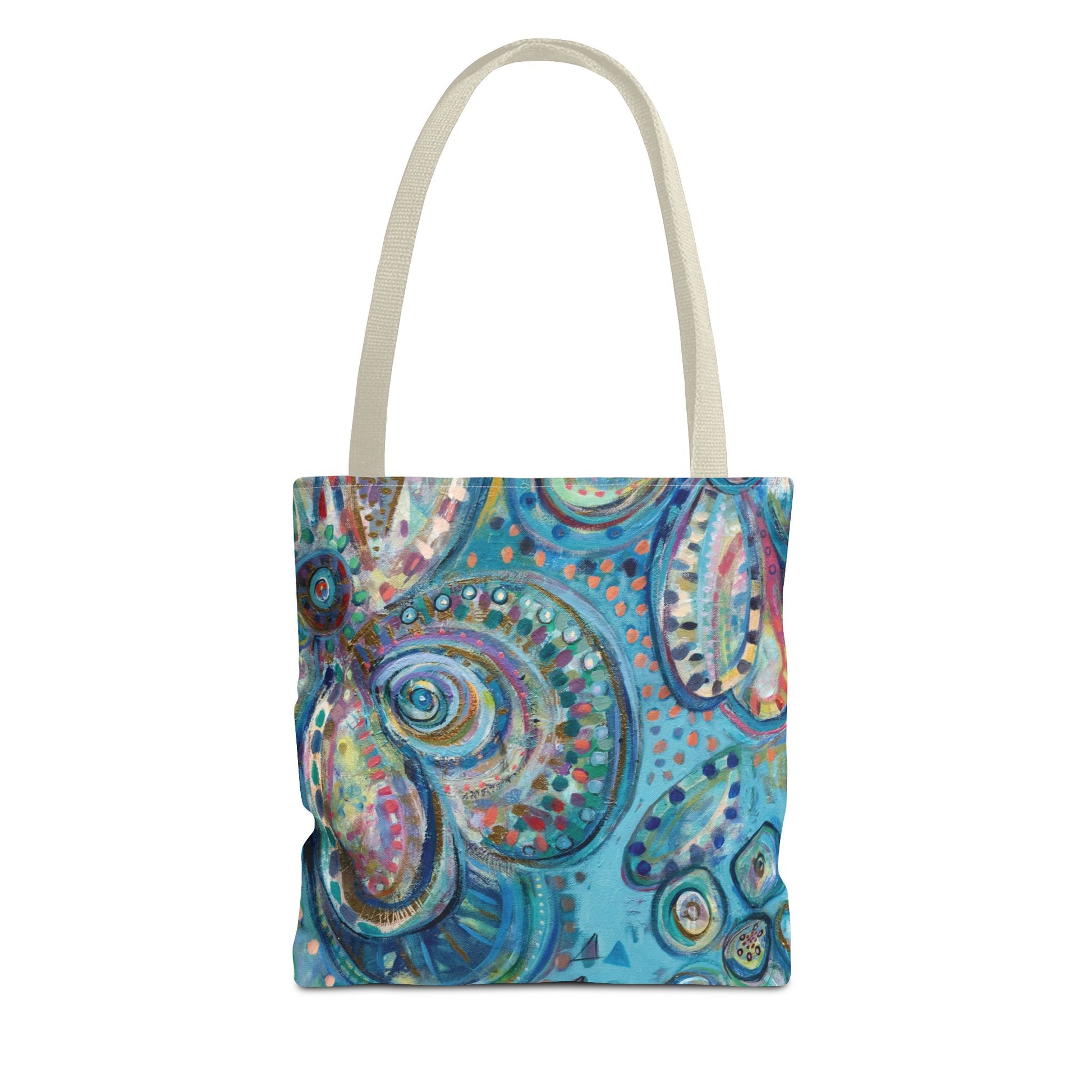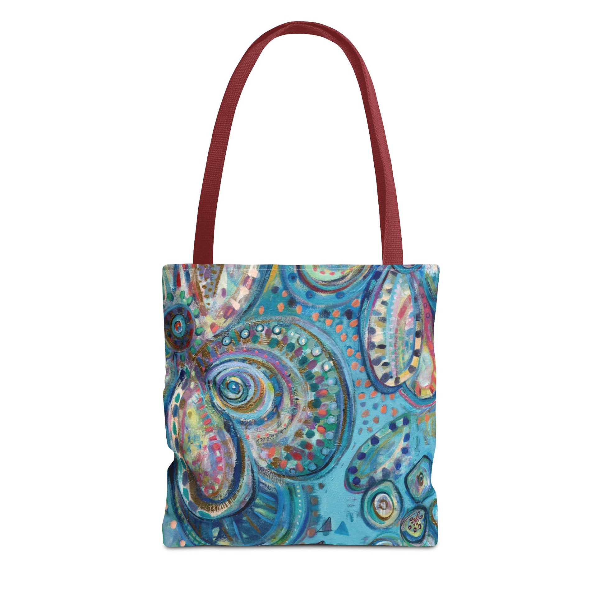 Leslie Karpinski's canvas artwork "World Love" printed on a canvas tote bag. The bag is available in 3 sizes and with different color handles.