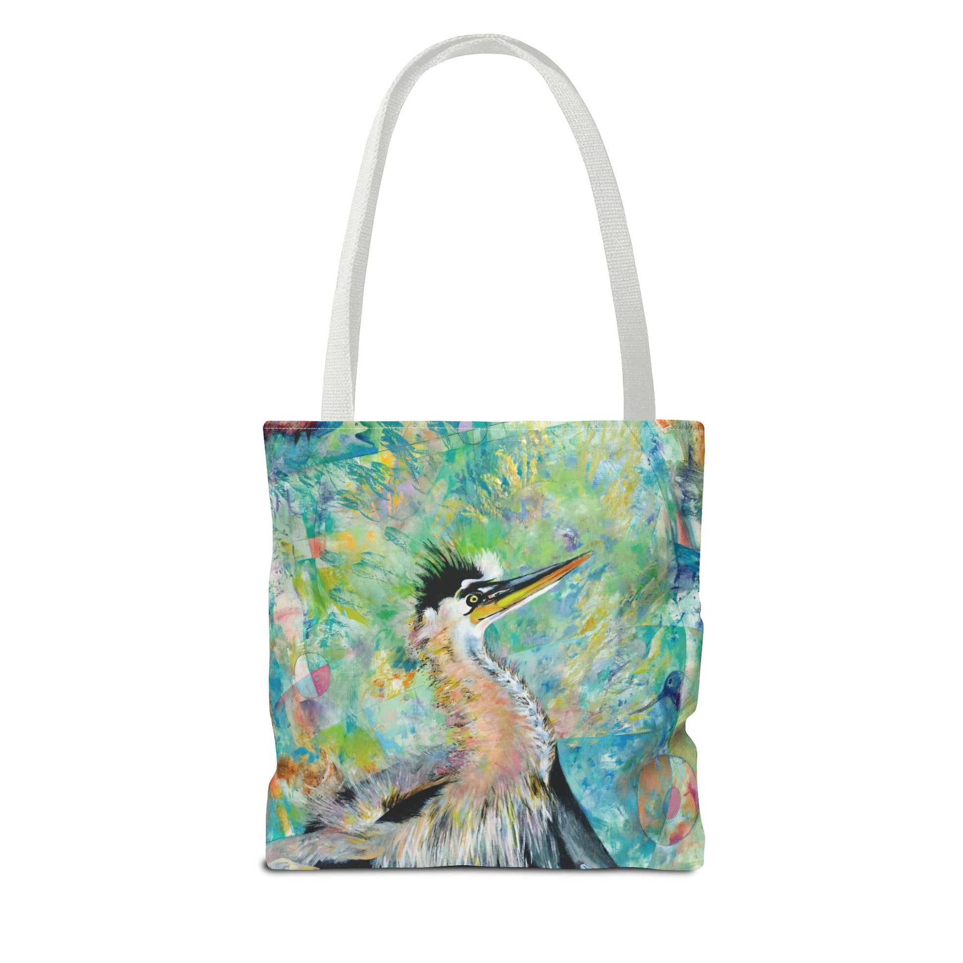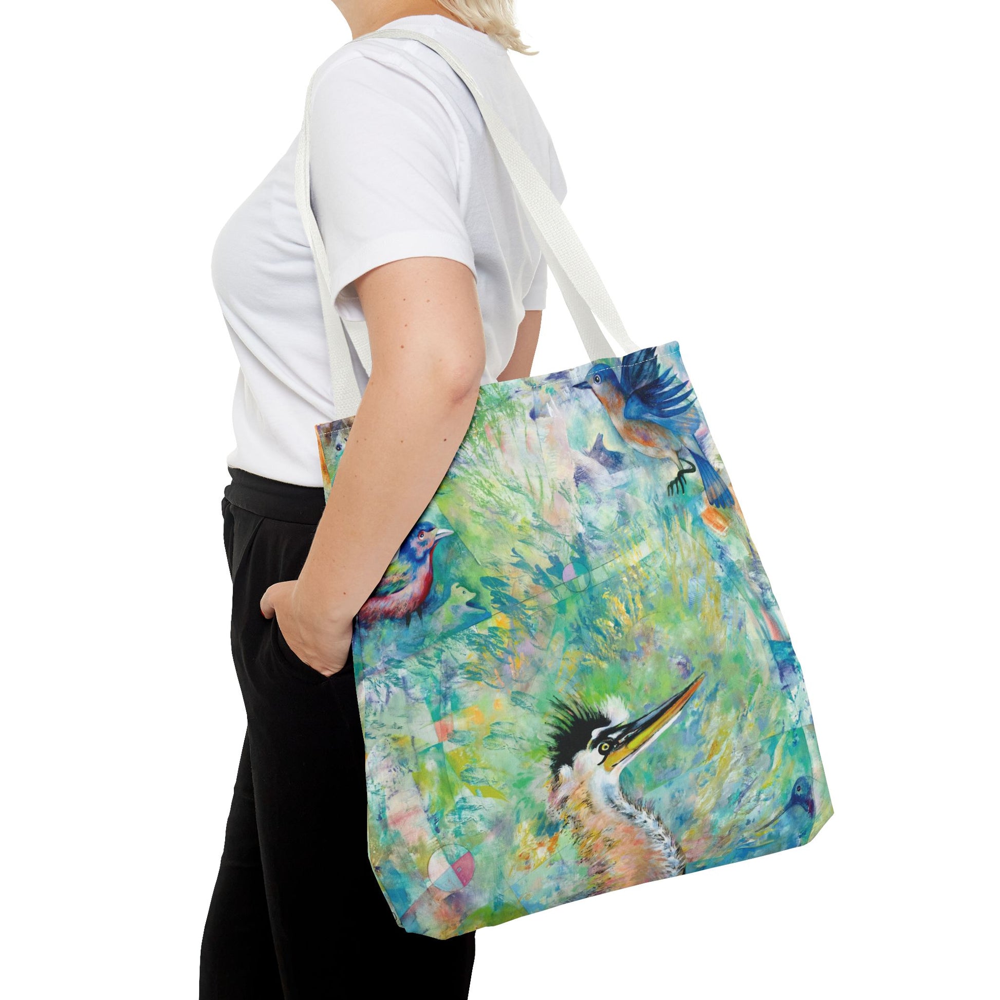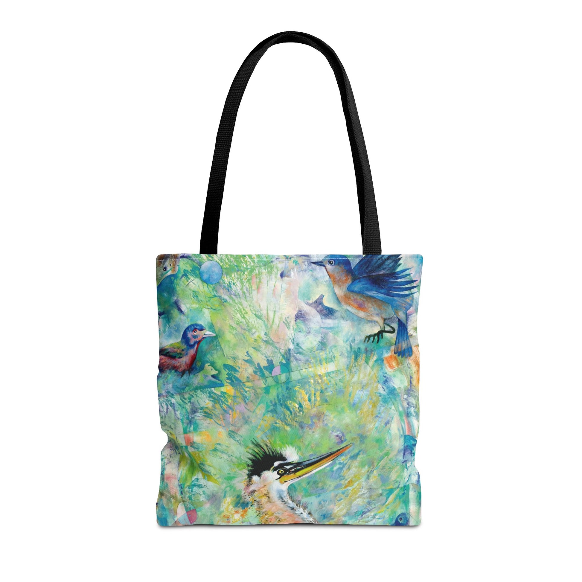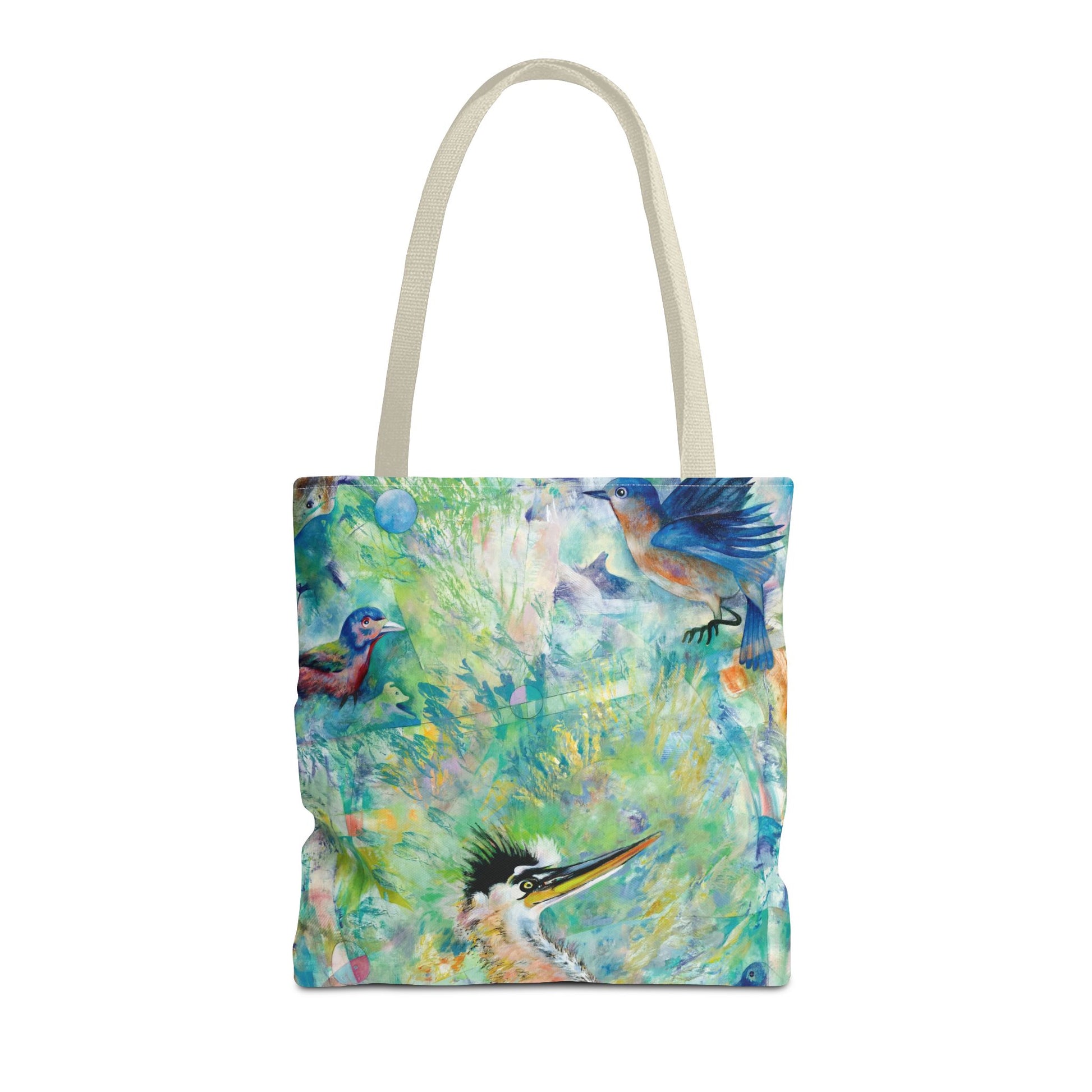 Leslie Karpinski's original artwork "Messengers in the Sky" printed on a canvas tote bag. The front and backside of the bag show different parts of the painting. The bag is available in 3 sizes and with different color handles.