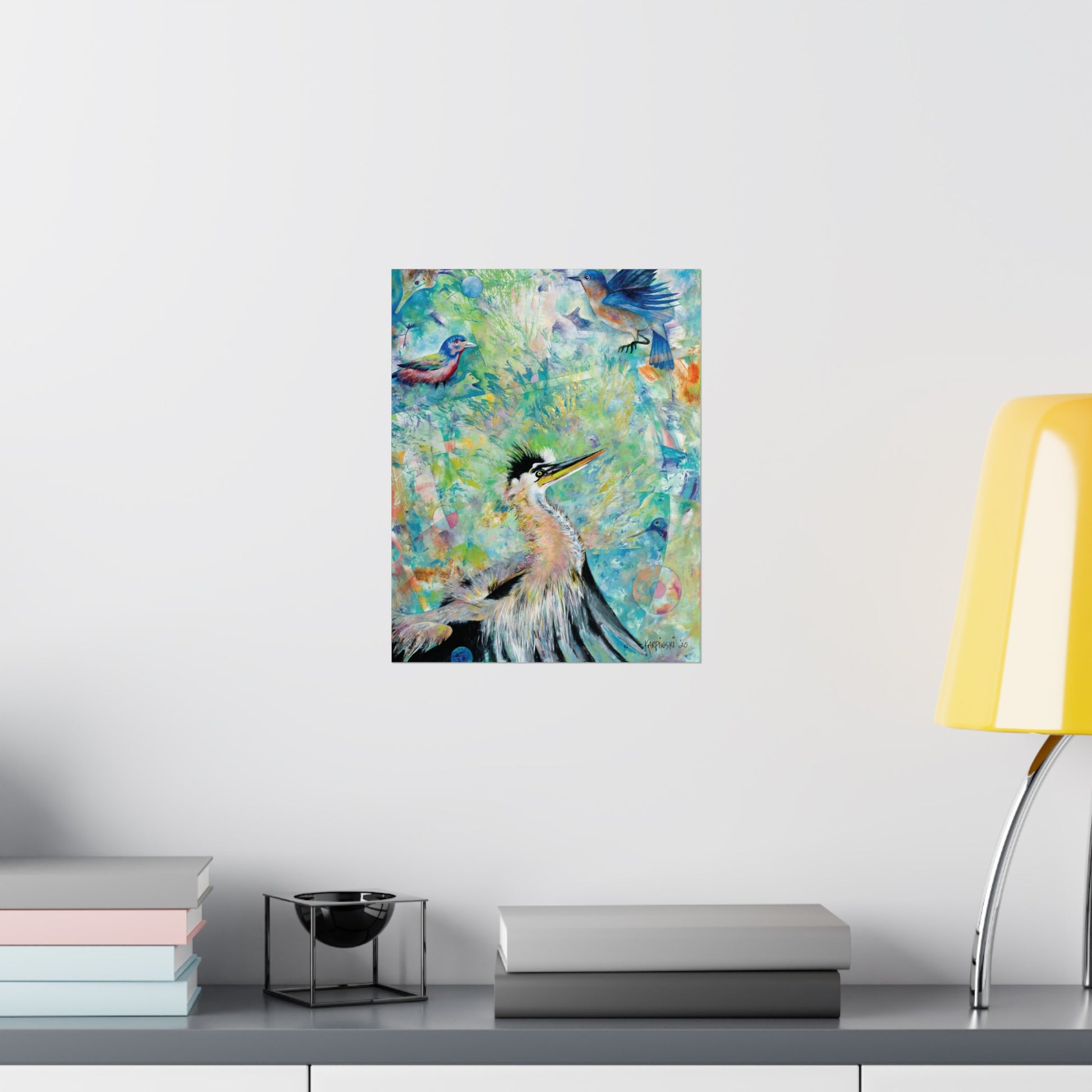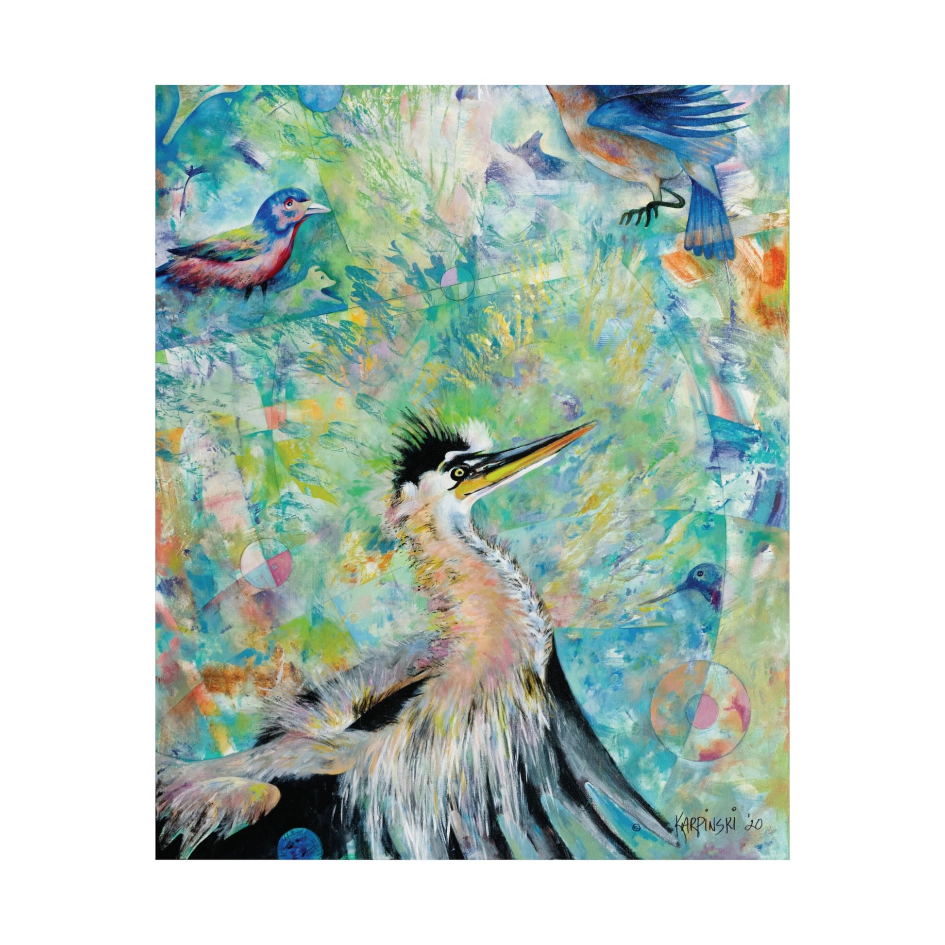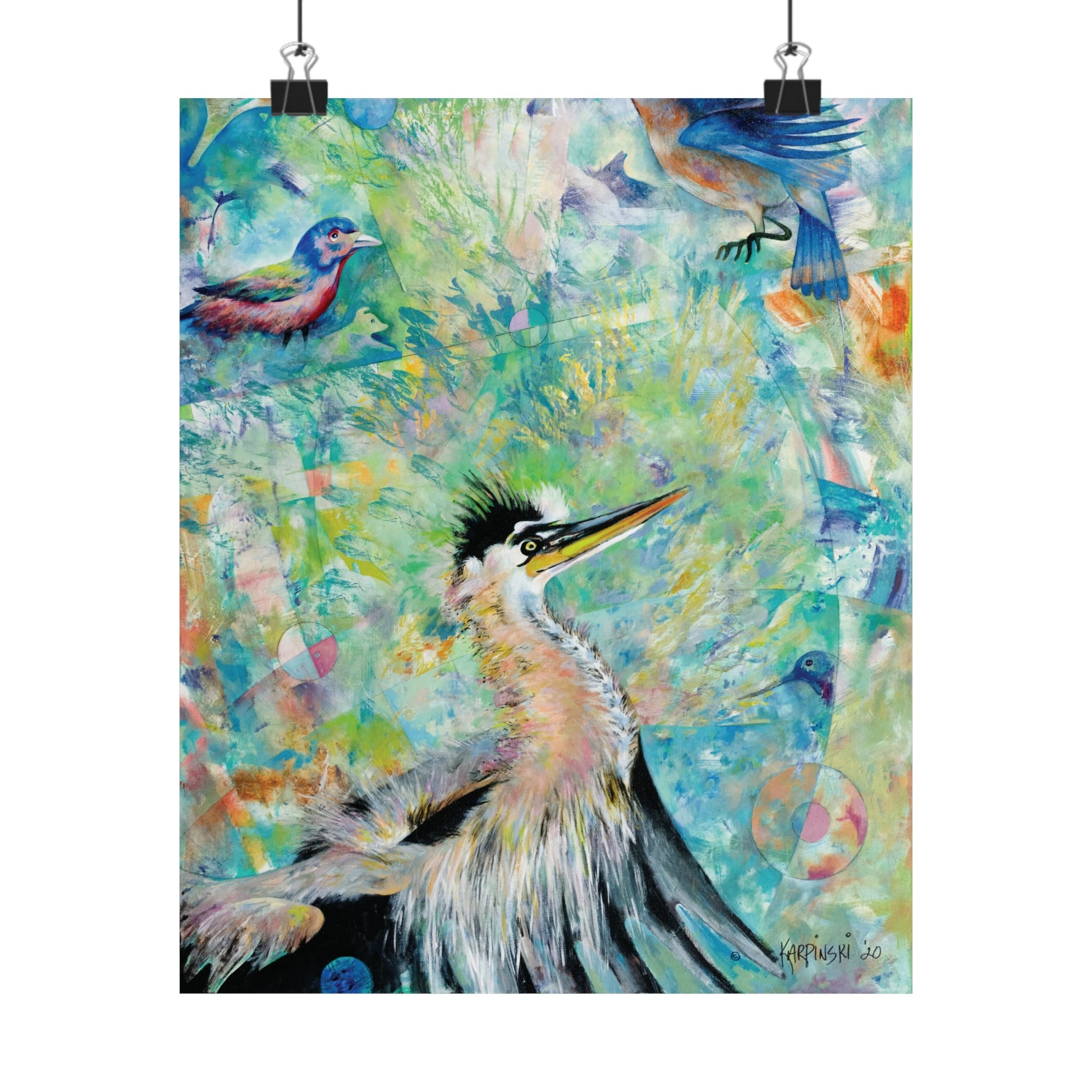 A poster print of an original painting by Leslie Karpinski titled "Messengers in the Sky". This one is for the bird enthusiasts! A beautiful abstract painting with various birds. The print is ready for framing.
