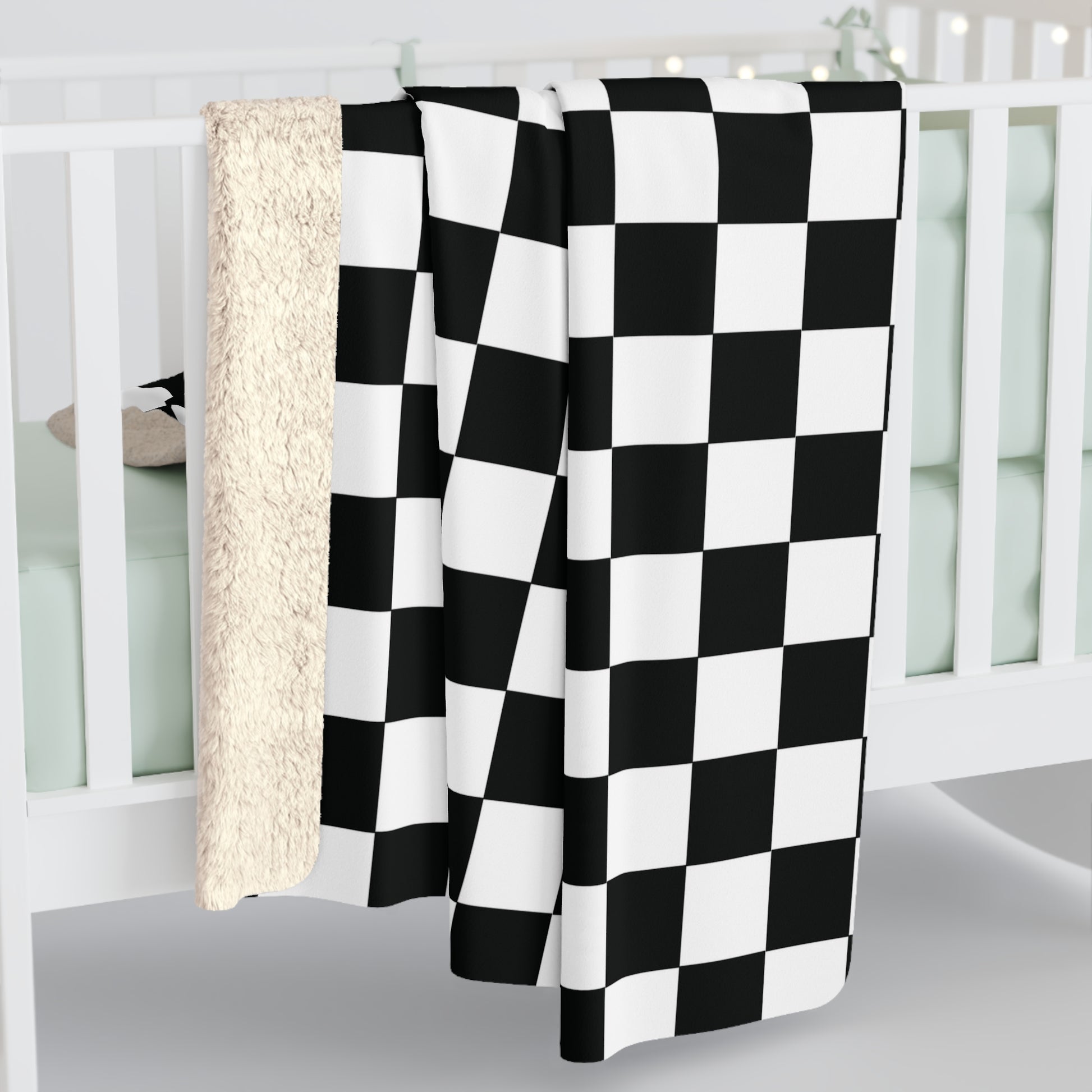 Our soft and cozy black and white checkerboard print blanket made with Sherpa fleece on the backside and printed on the front side.