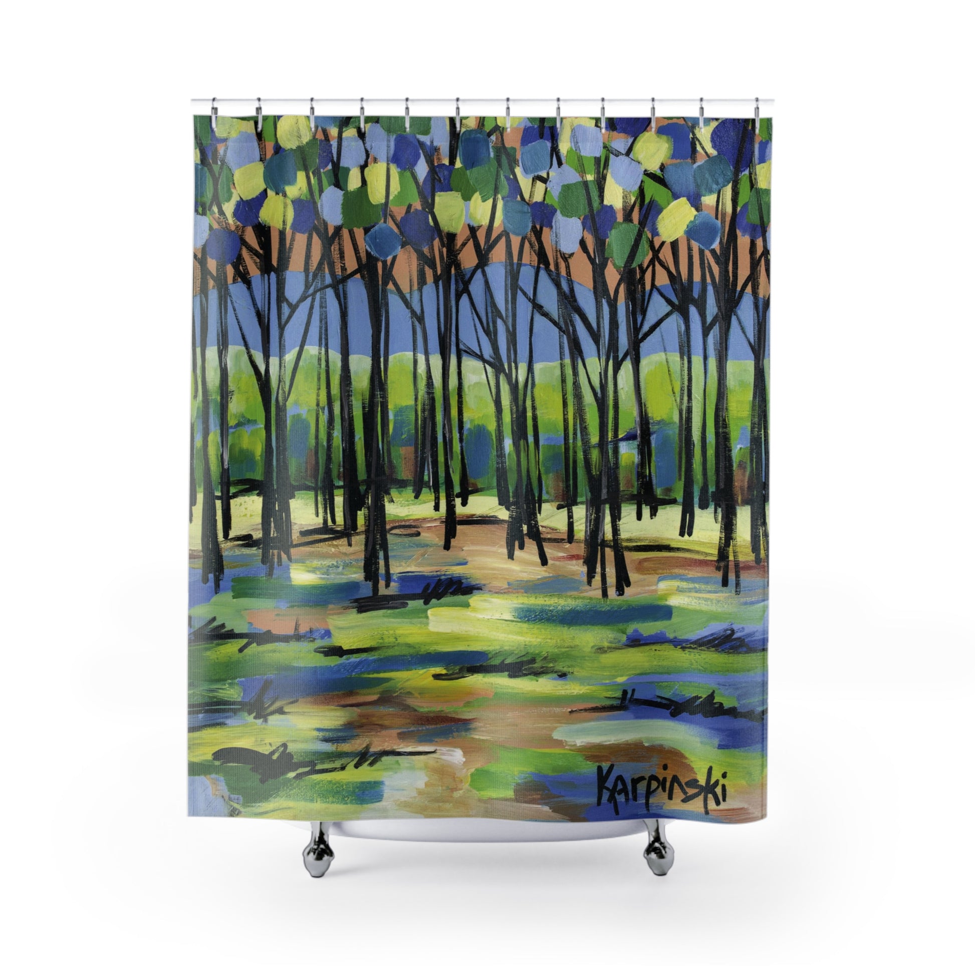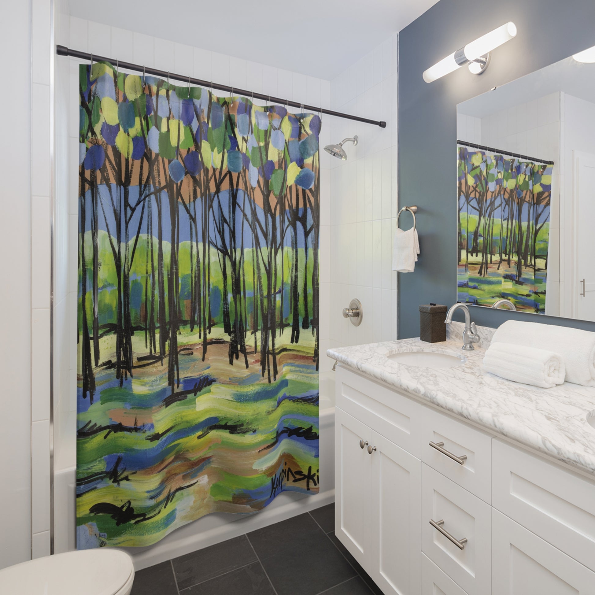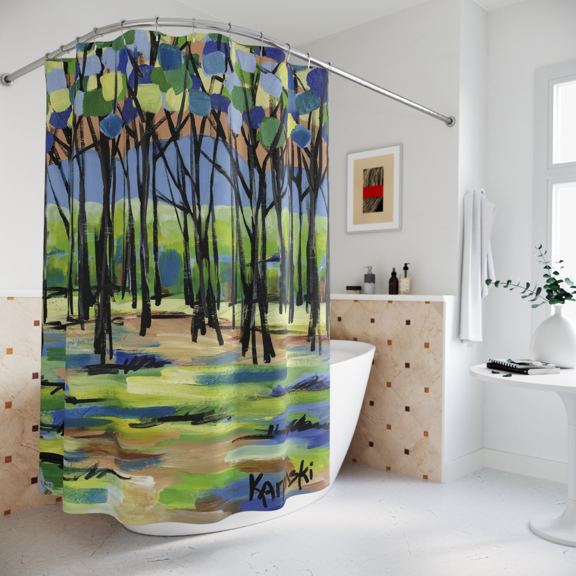 Island is an original painting by Leslie Karpinski now available printed on a 100% polyester shower curtain. The shower curtain is printed in North Carolina on an imported blank. A plastic liner is recommended.