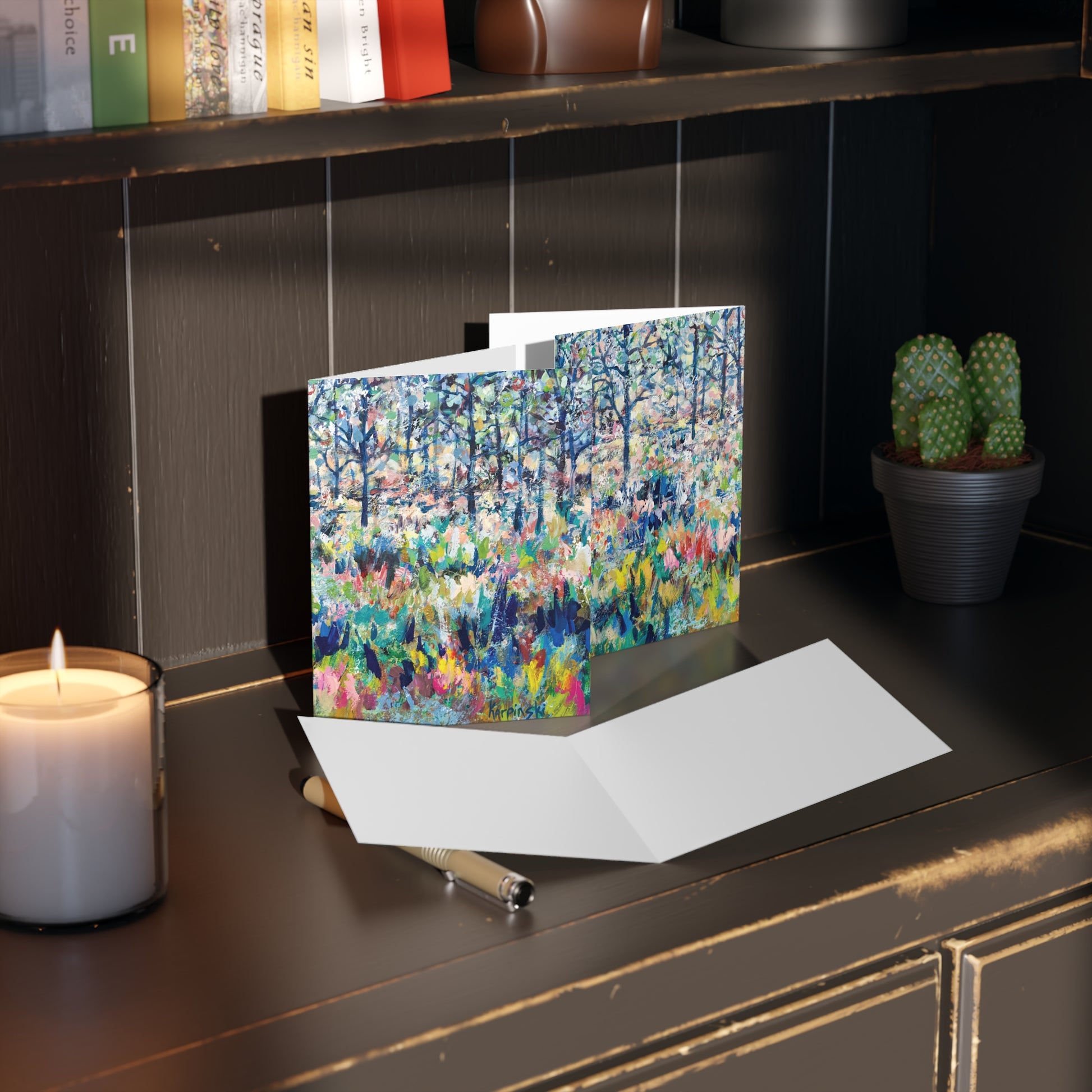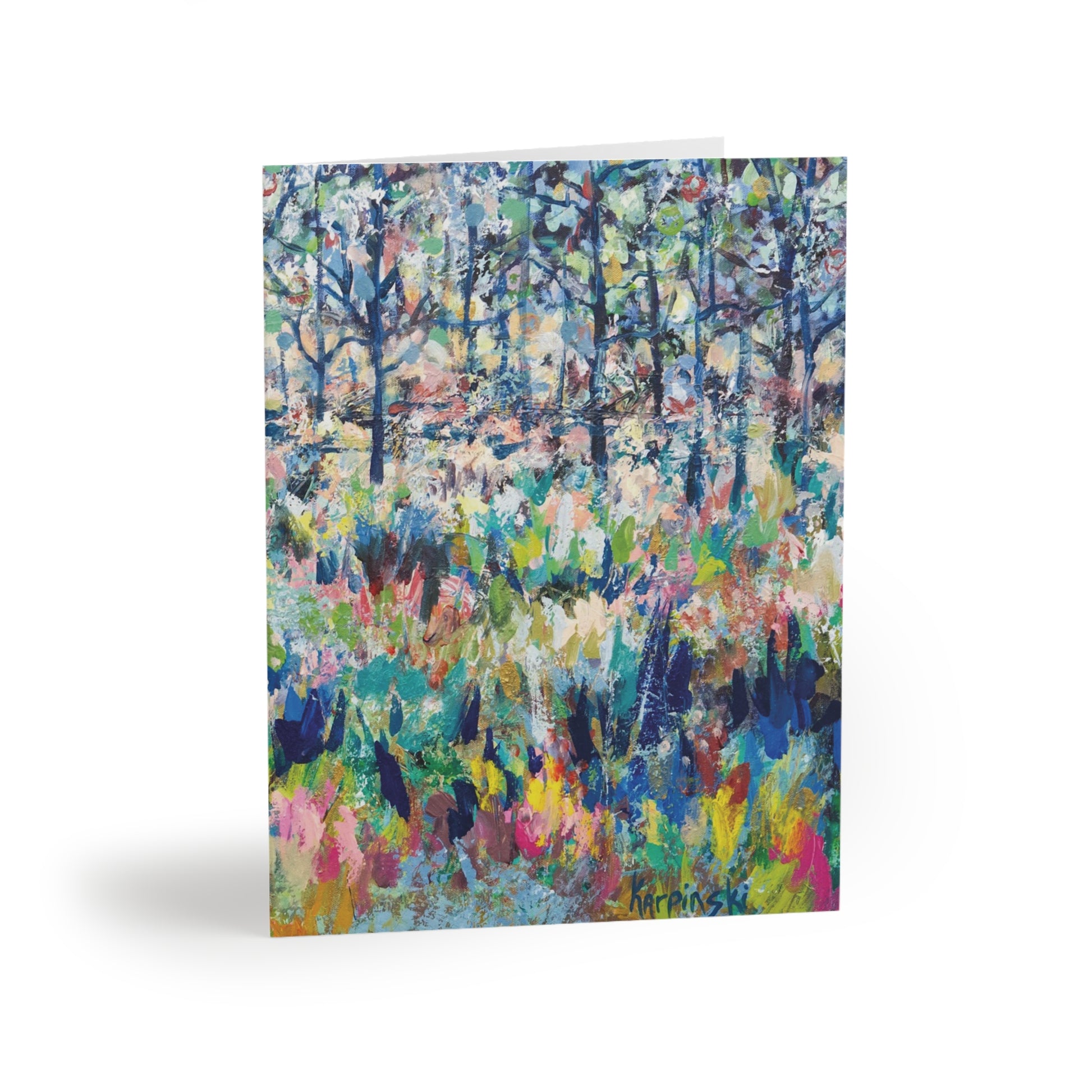 A multi pack of greeting cards with Leslie Karpinski's original painting "Healing From The Storm". We have 8, 16 and 24 packs. The cards measure 4.25" x 5.5". Each greeting card come with a white envelope.