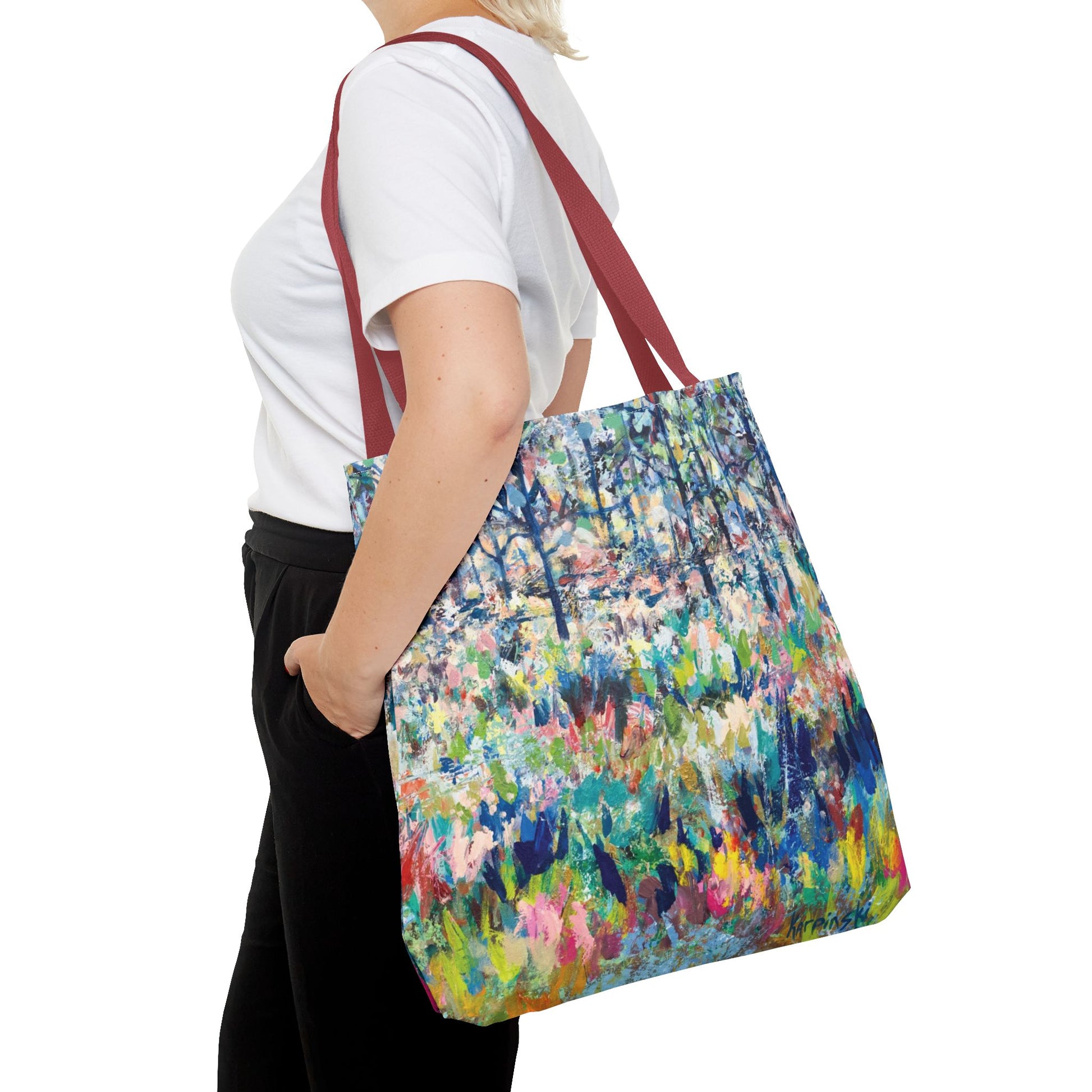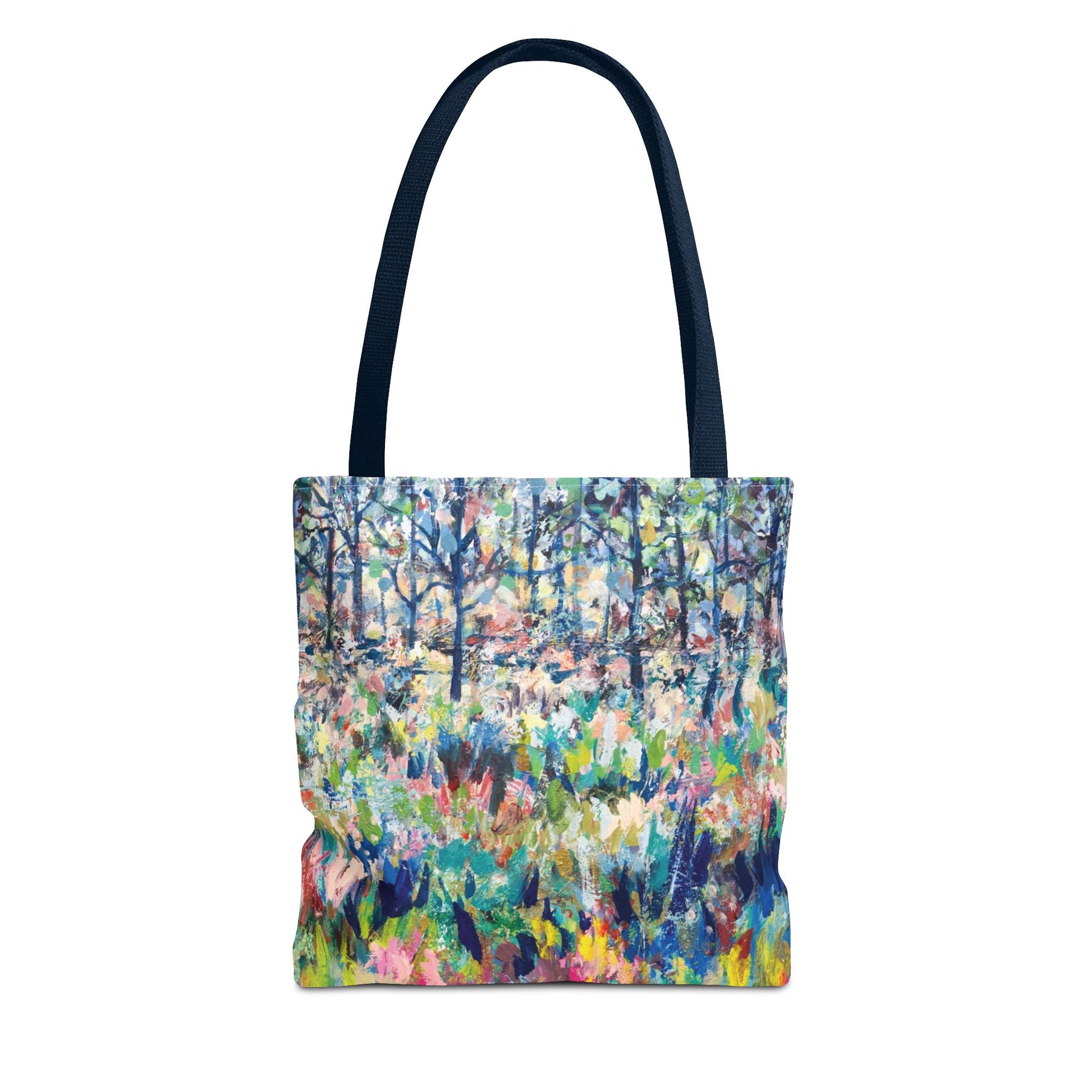 Leslie Karpinski's canvas artwork "Healing From the Storm" printed on a canvas tote bag. The bag is available in 3 sizes and with different color handles.