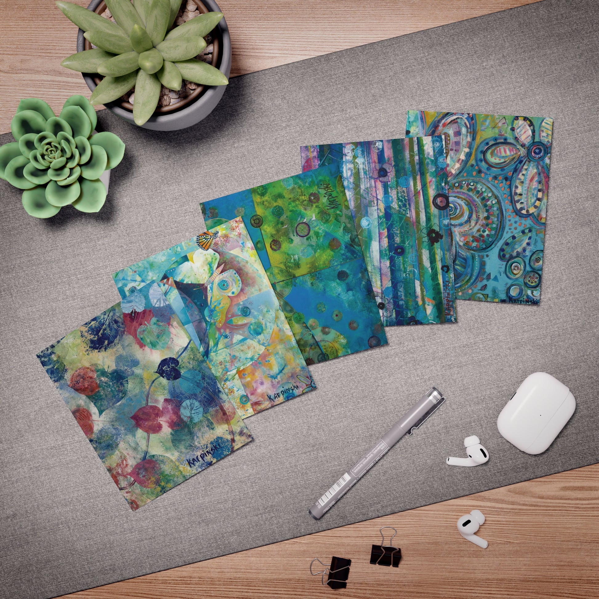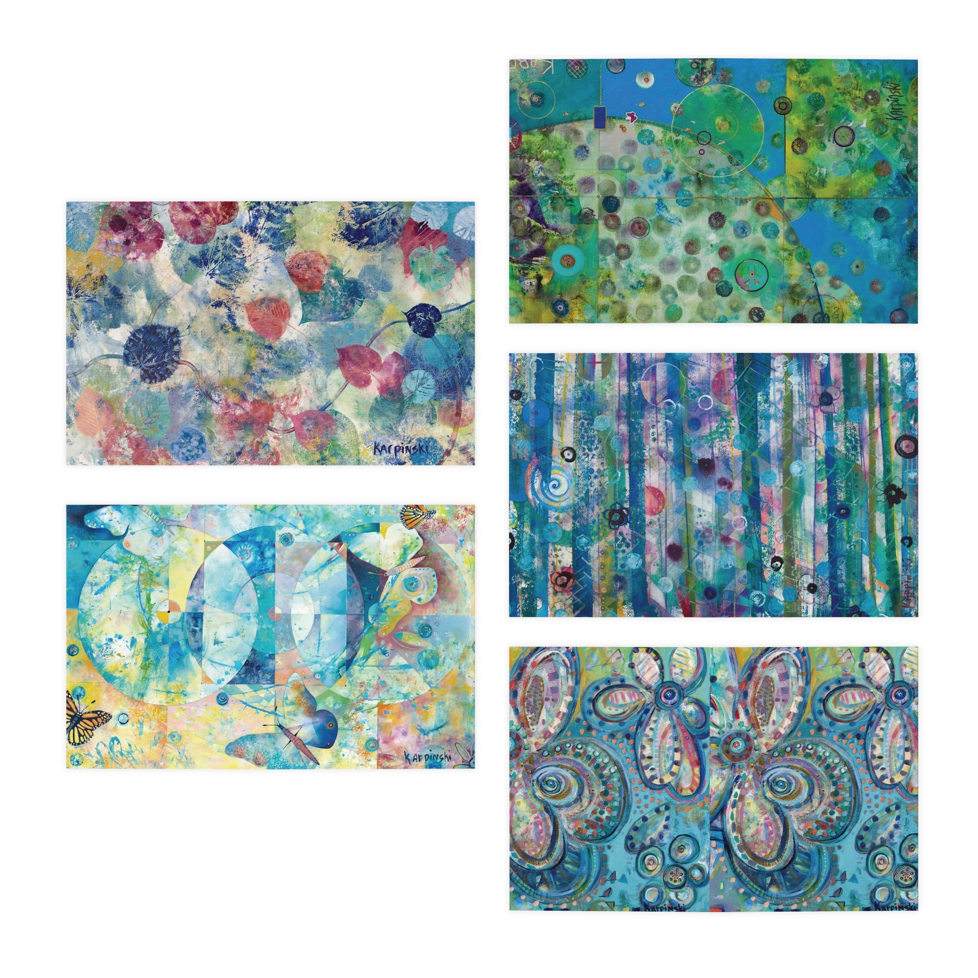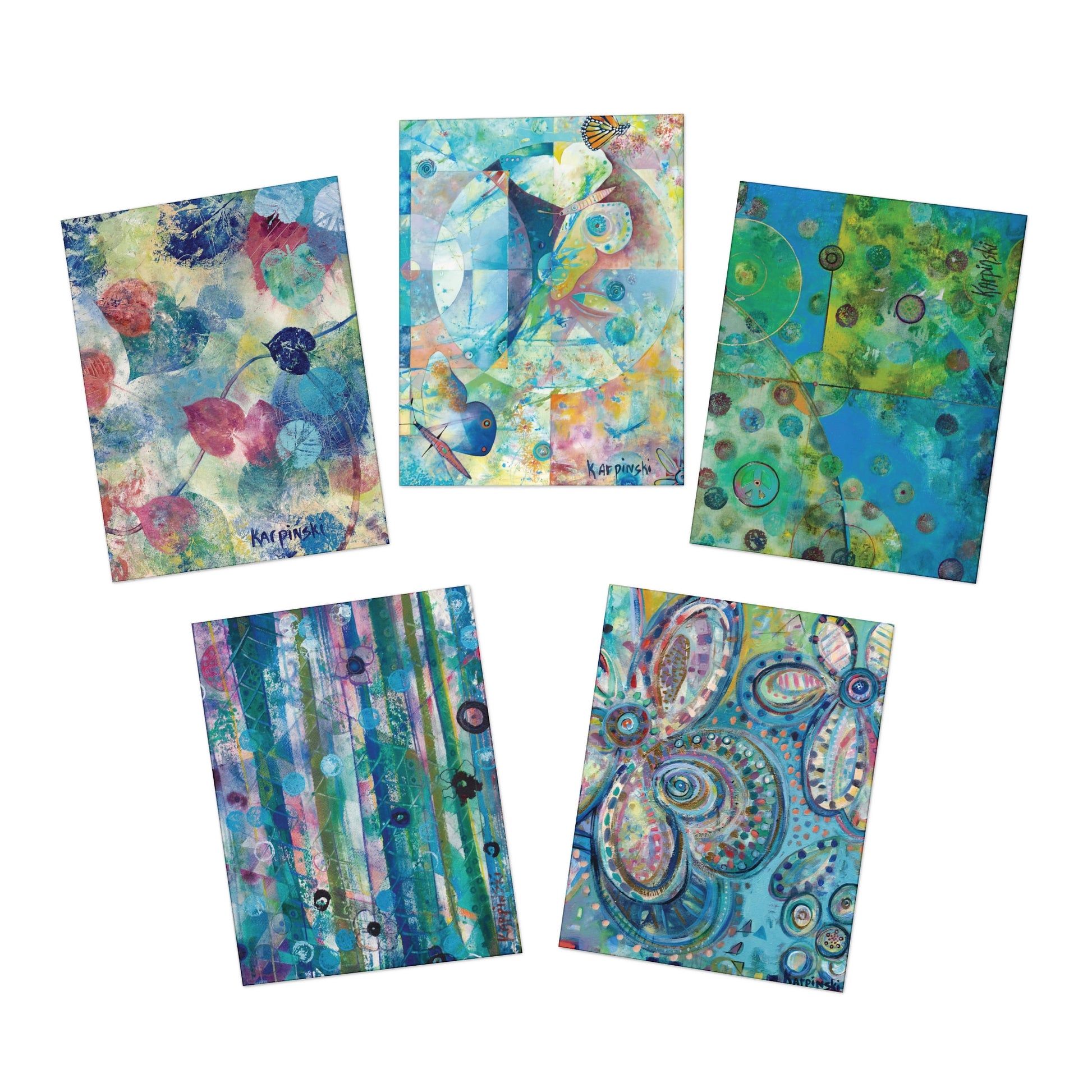 A multi pack of greeting cards with 5 different paintings by Leslie Karpinski. The cards measure 4.25" x 5.5". Each greeting card come with a white envelope and is blank inside.