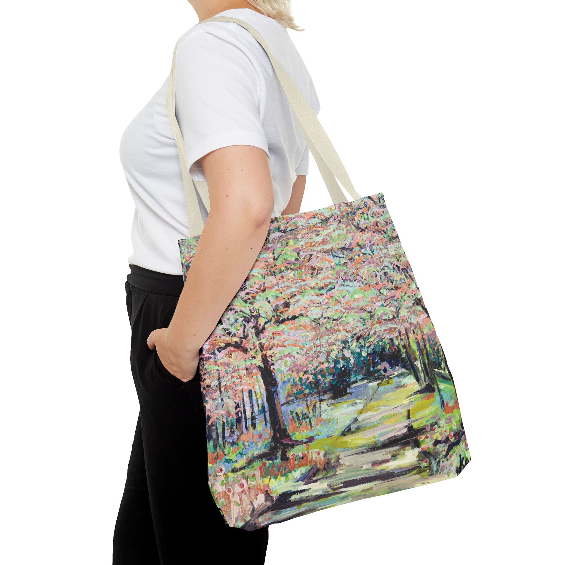 Spring Tree Flowers Landscape Art Tote Bag Canvas Shopping Bag - Path in Reynolda Gardens by Leslie Karpinski