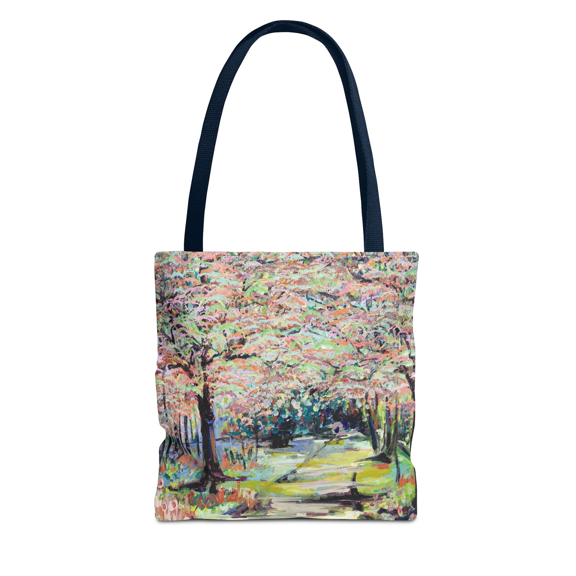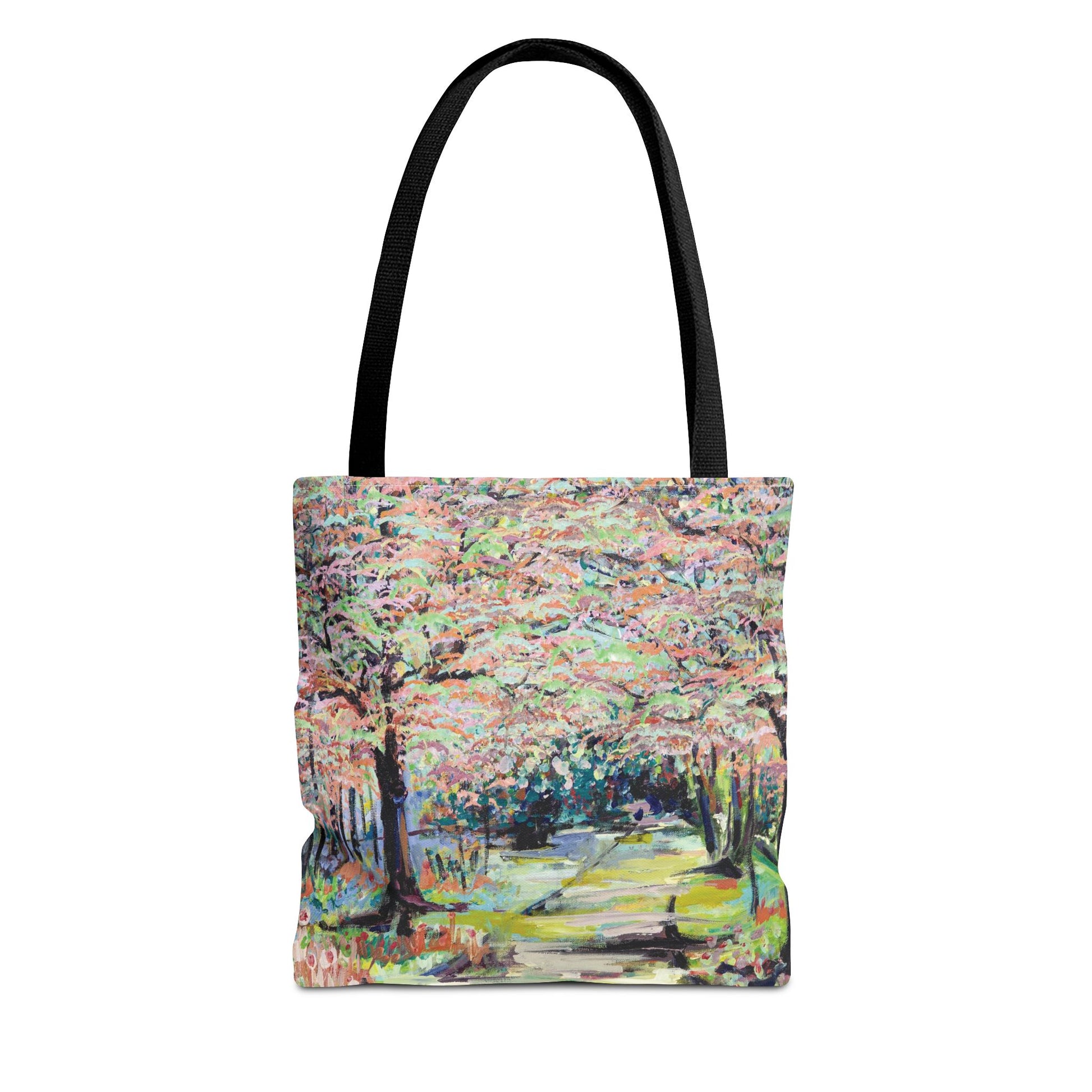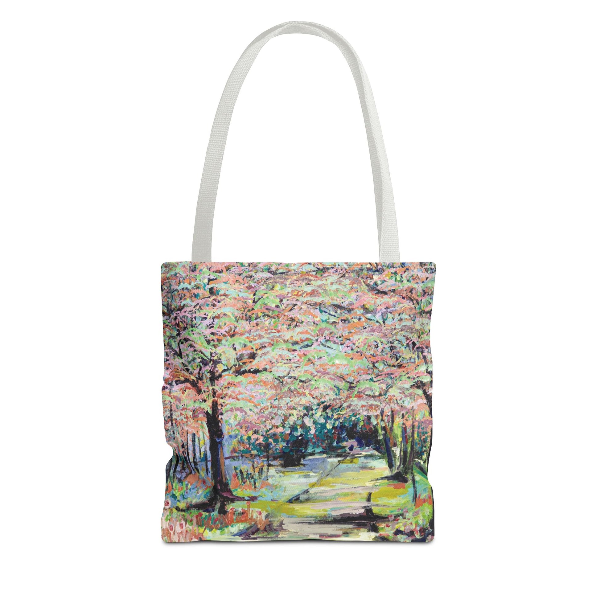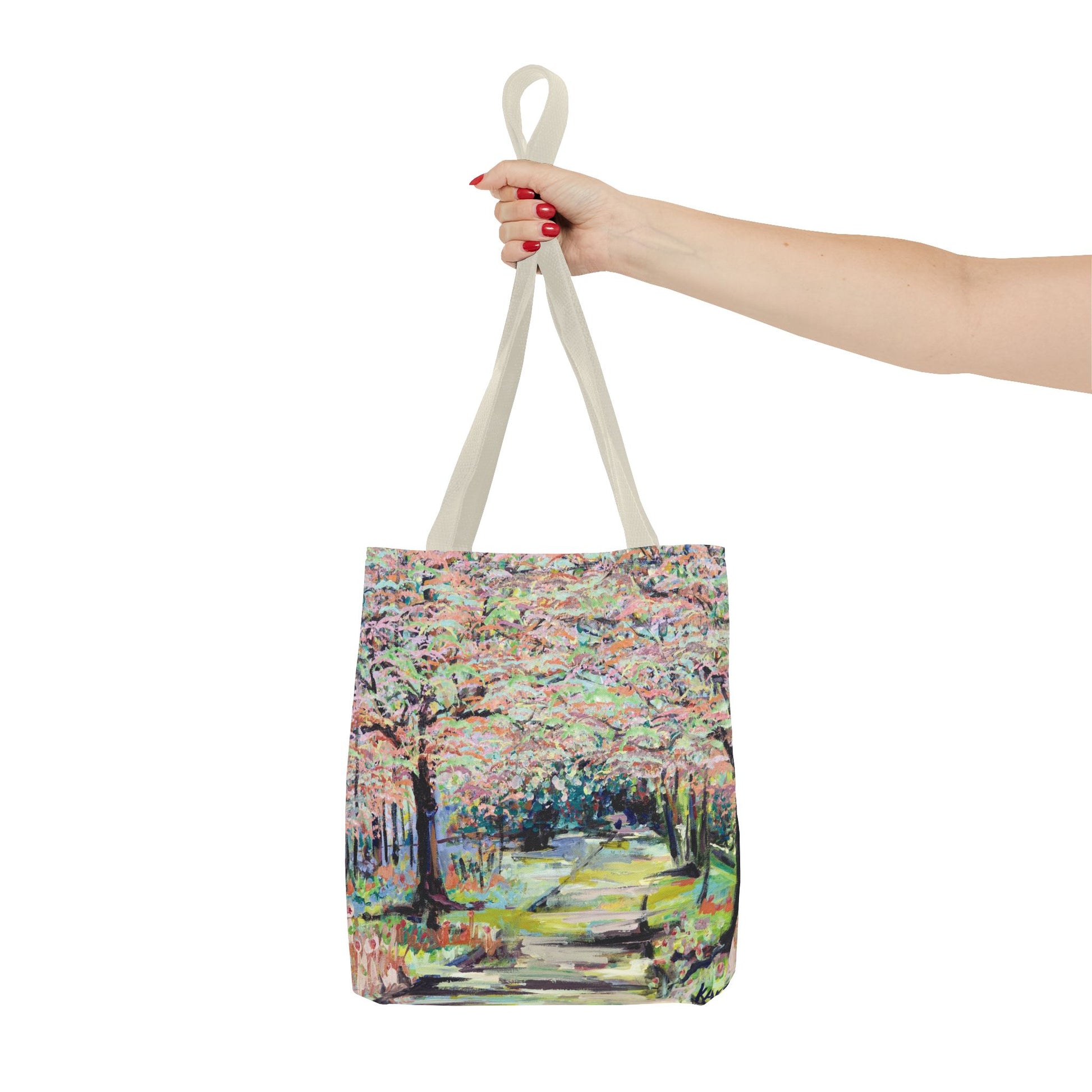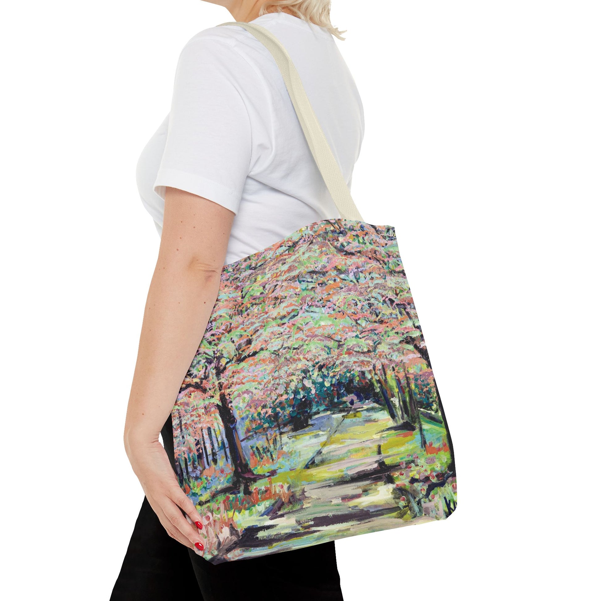 Leslie Karpinski's original artwork "Path in Reynolda Gardens" printed on a canvas tote bag. The bag is available in 3 sizes and with 4 different color handles.