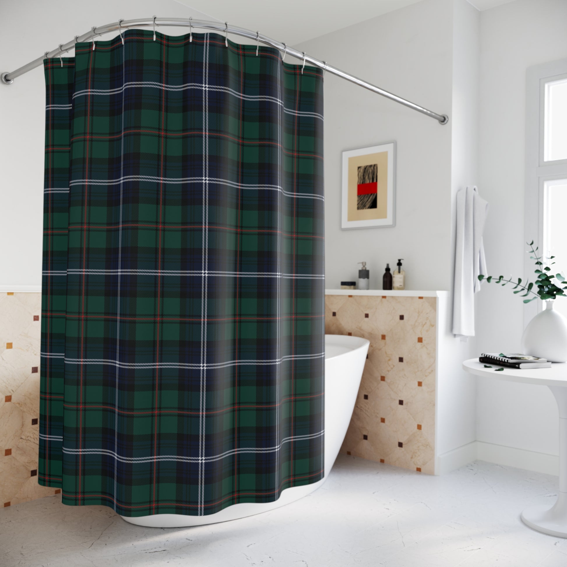 Customize our shower curtain with your family's tartan. The design is printed on a 100% polyester shower curtain. The tartan shown is "Urquhart". The colors in this shower curtain are green, blue, red and white.