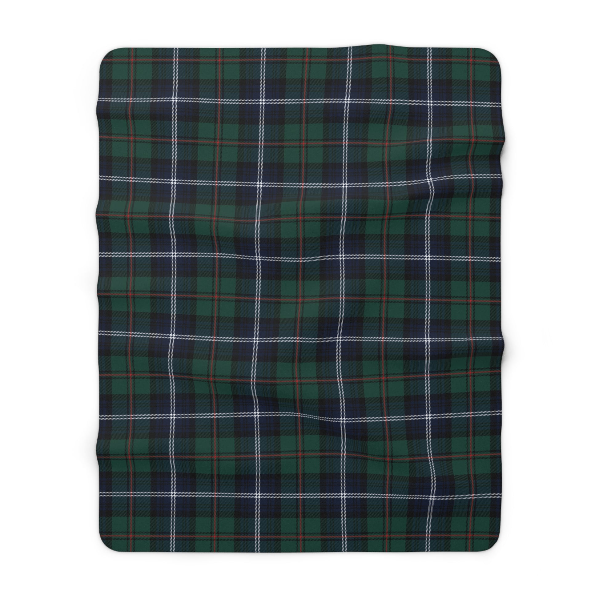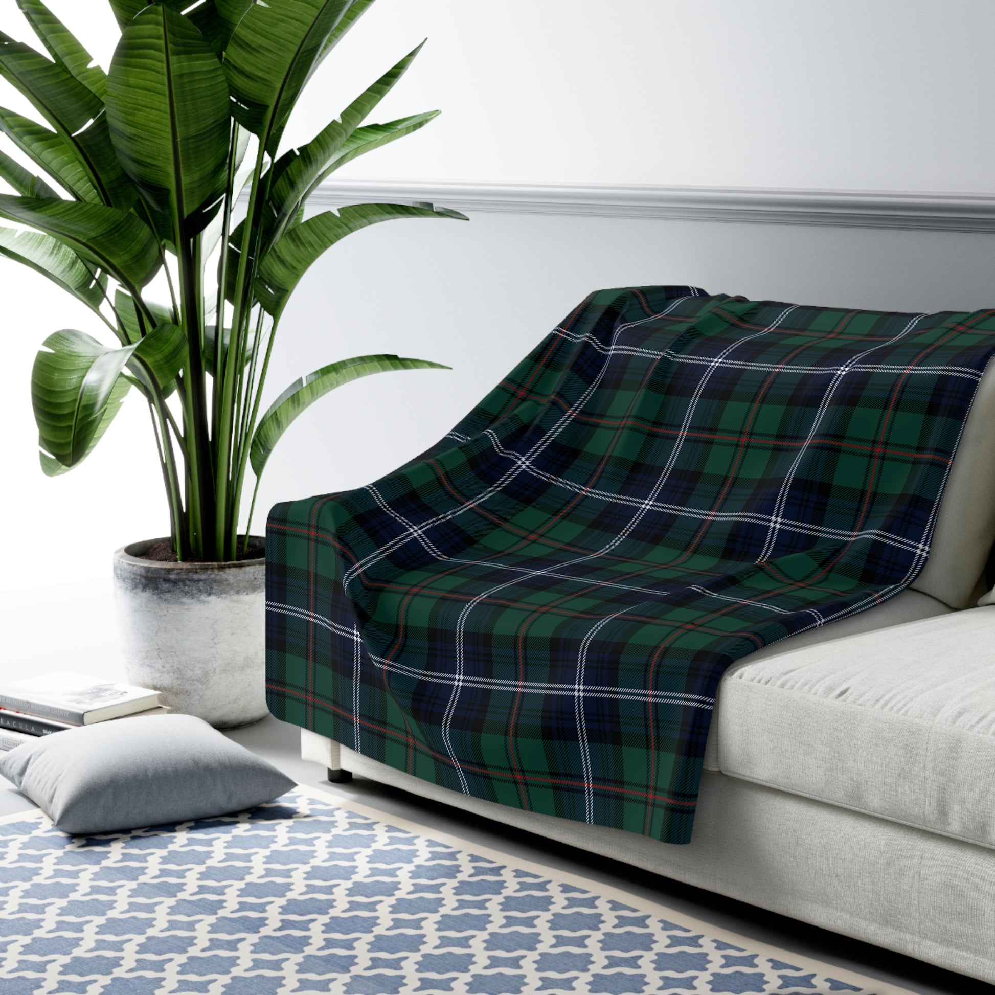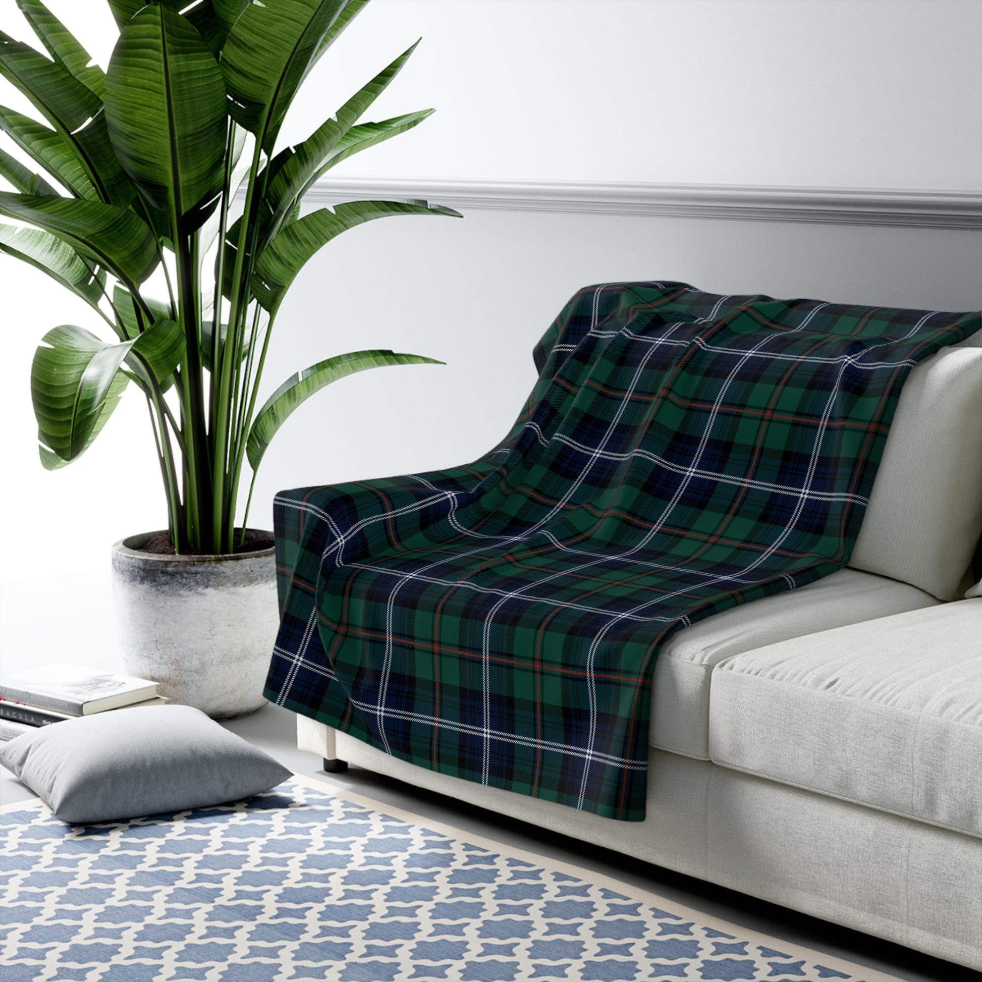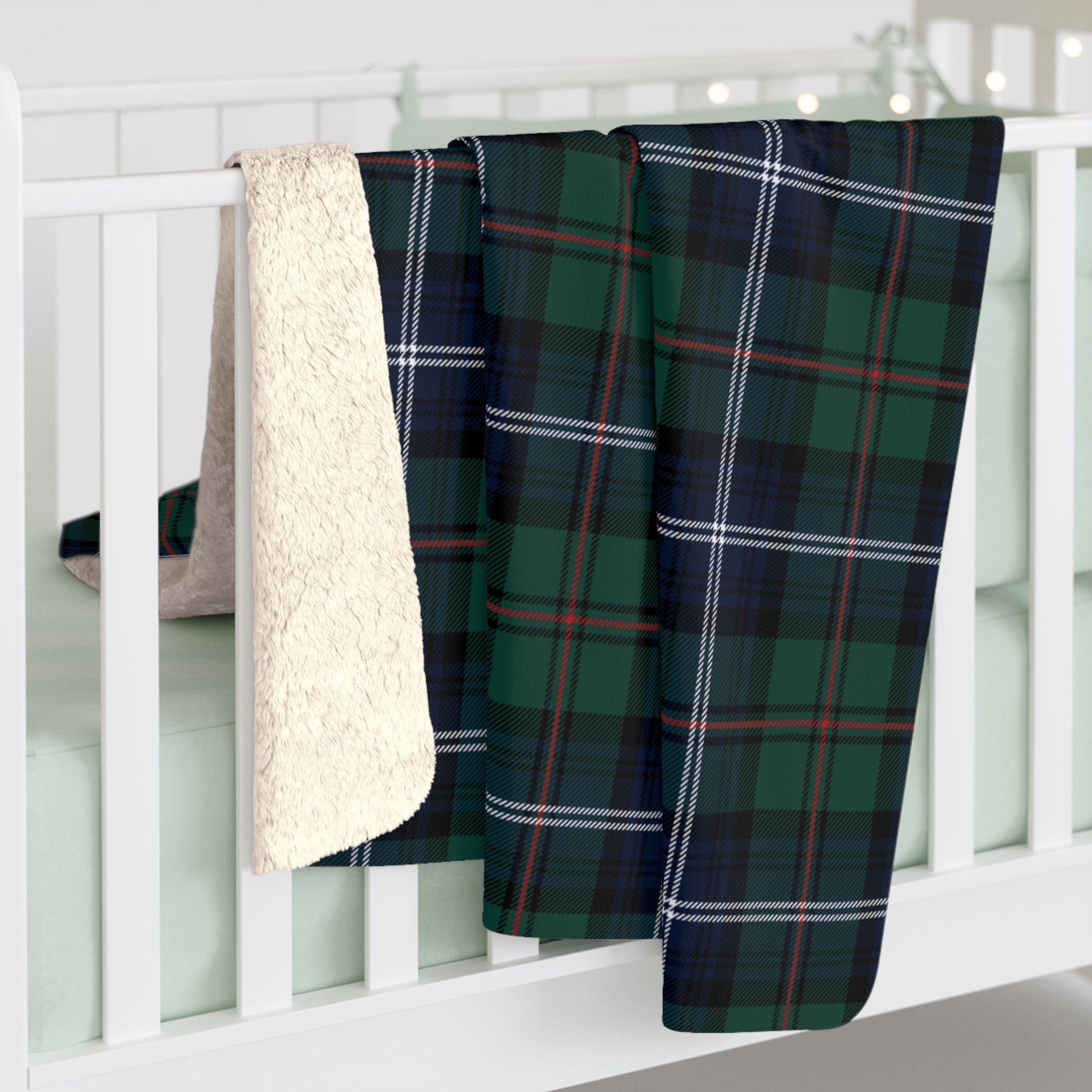 Our green, blue, red and white plaid (tartan) Sherpa fleece blanket is cozy and soft. We can customize the blanket with your family Tartan.
