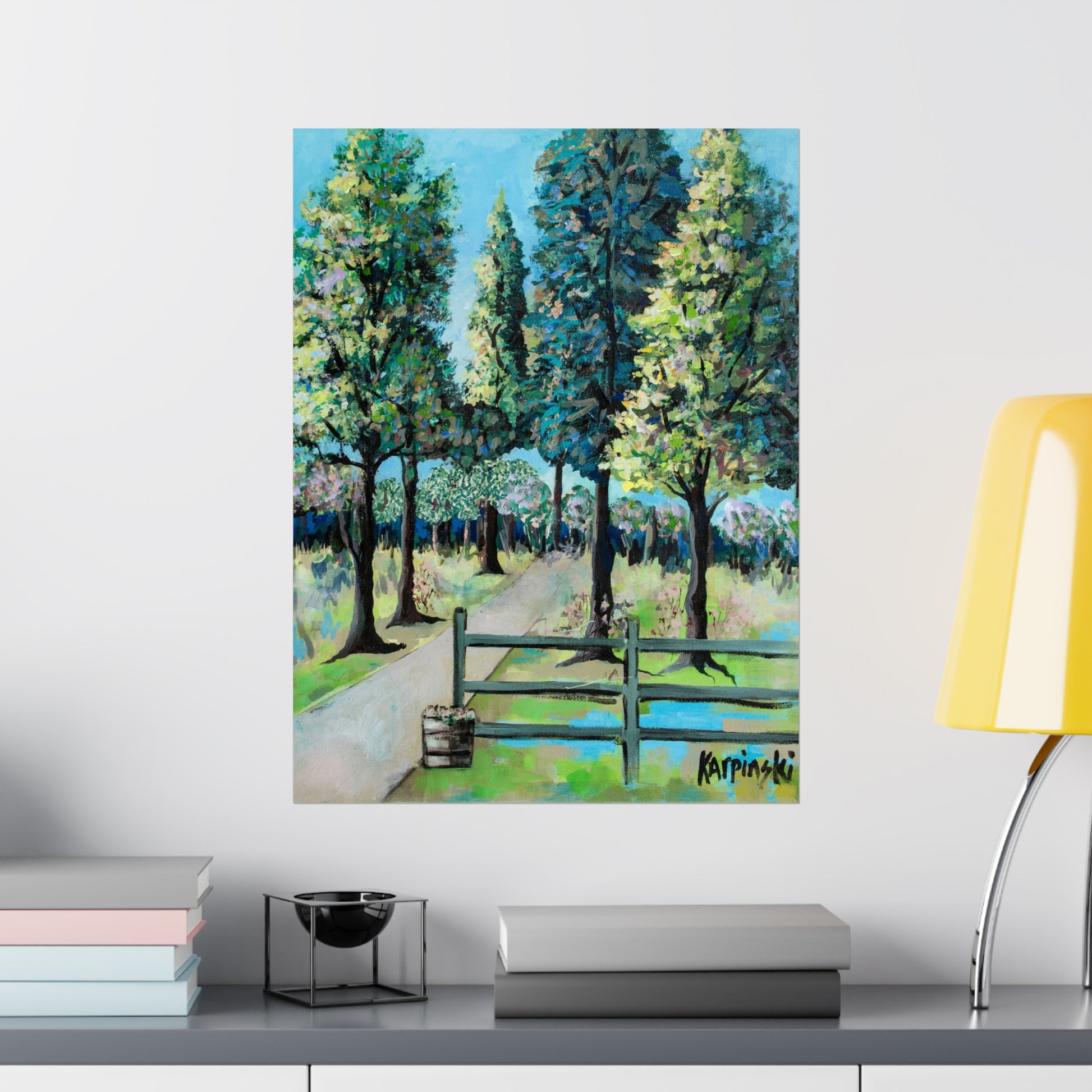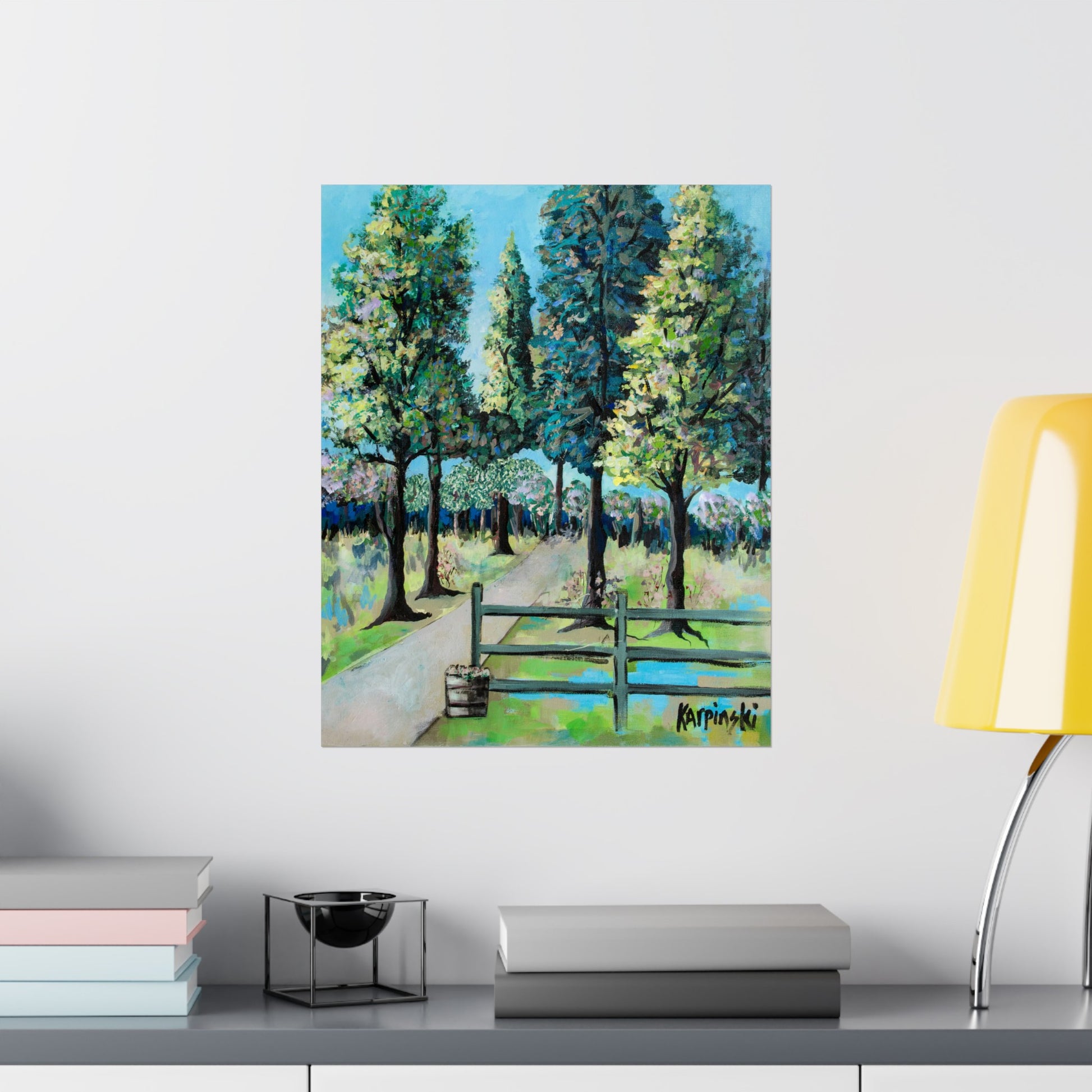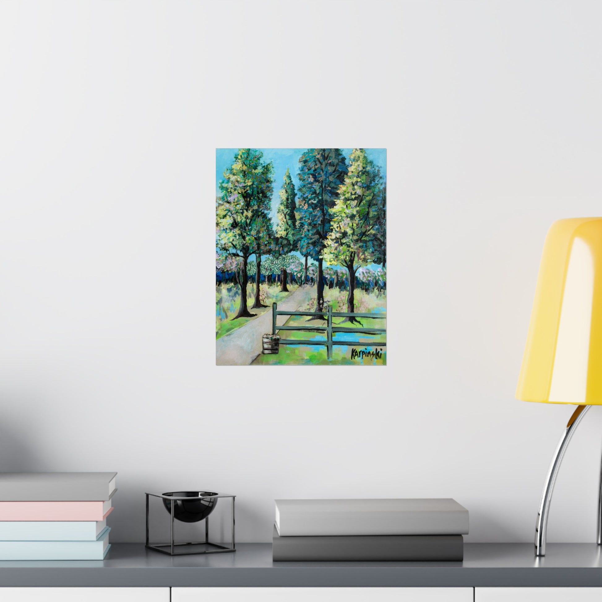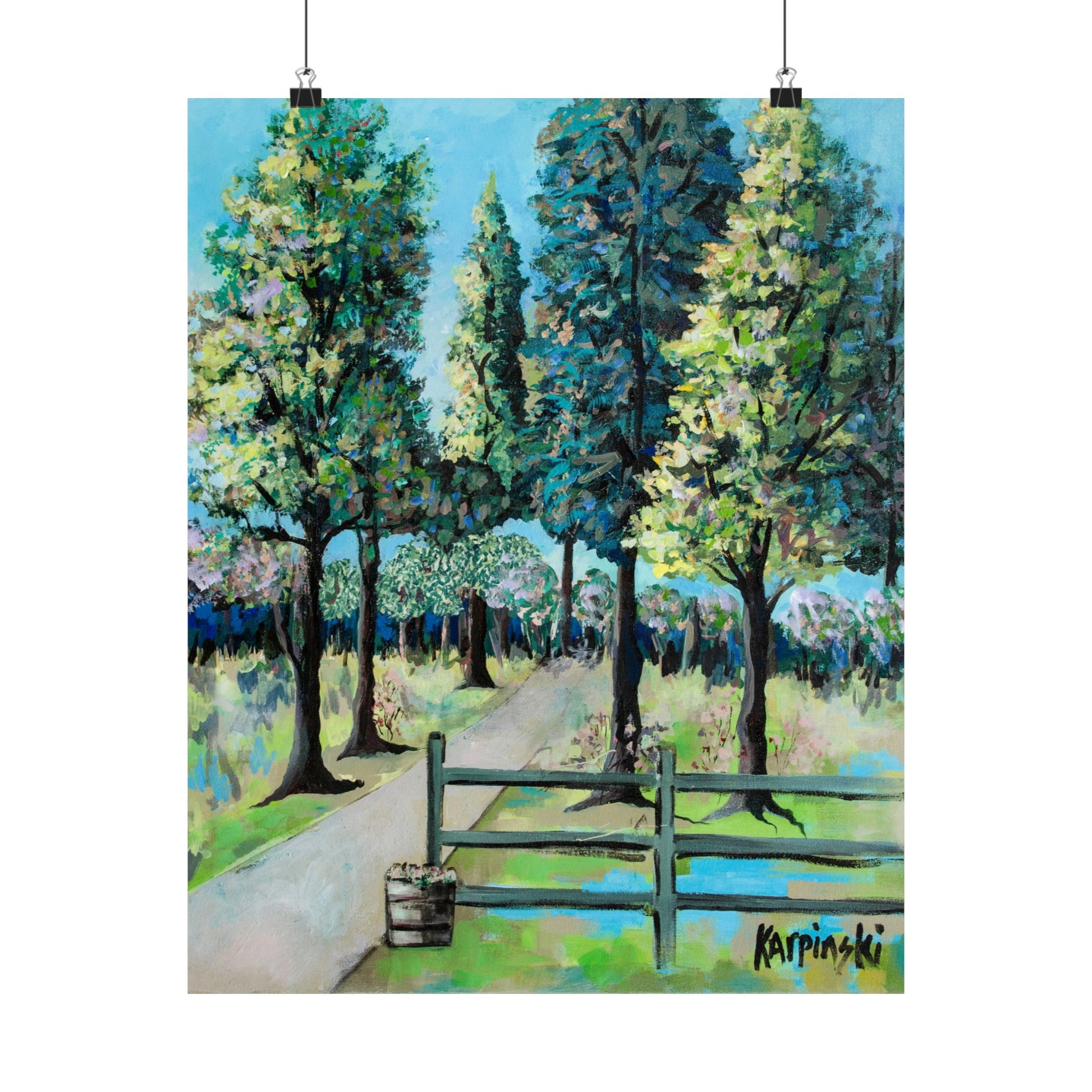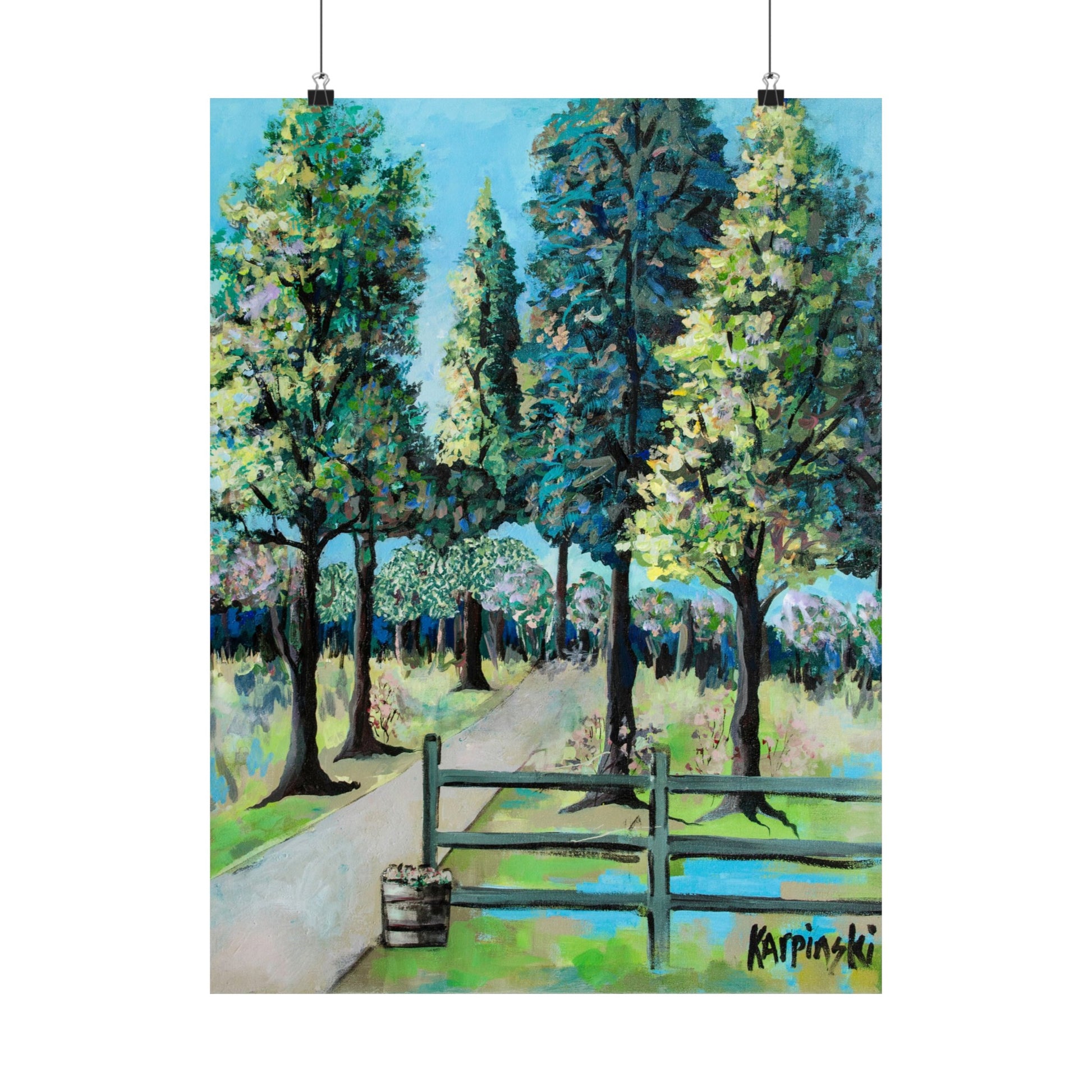 A poster print of an original painting by Leslie Karpinski titled "Renegar Farm". A bright landscape depicting Renegar Farm. The crisp clean contrasting lines of this piece really make this art pop.