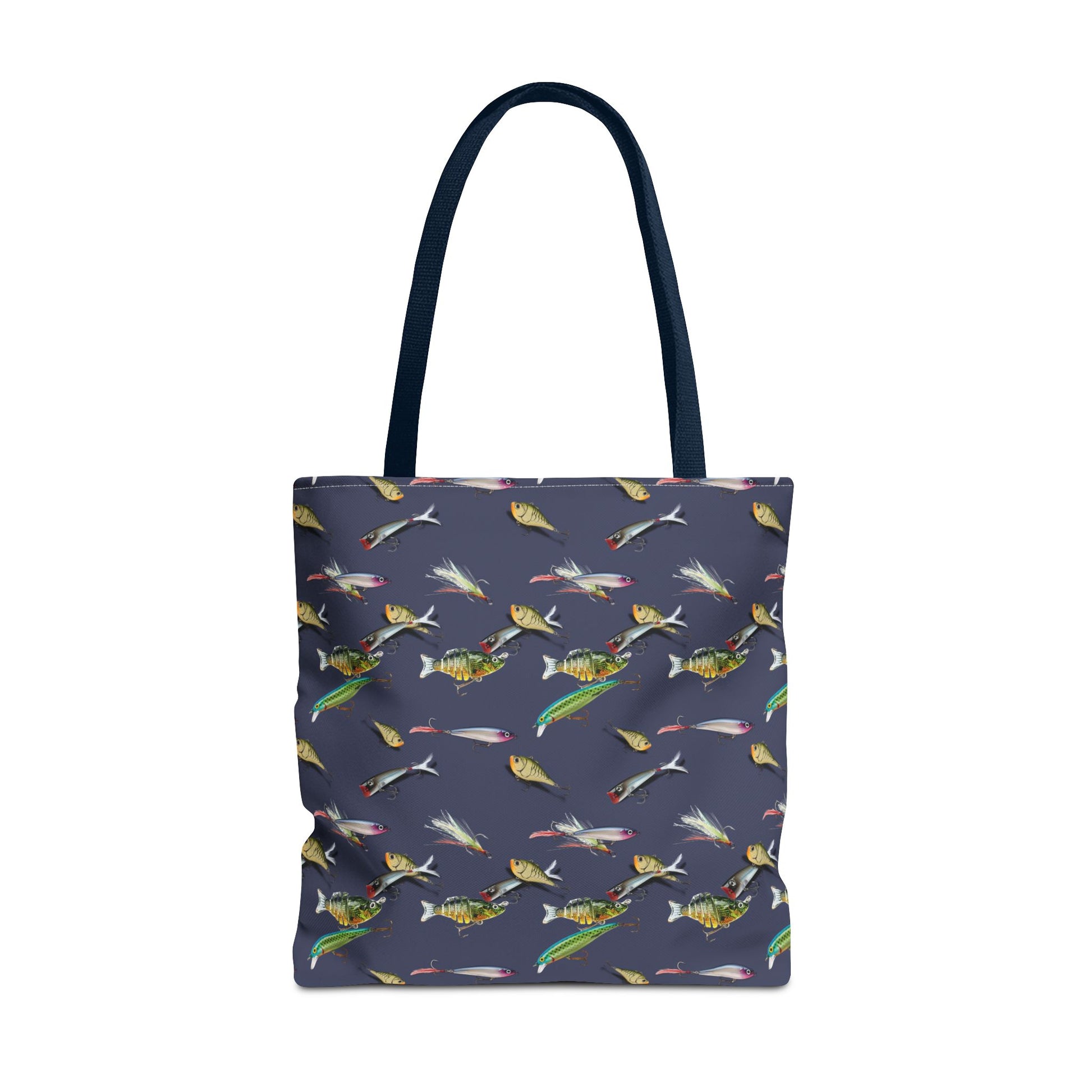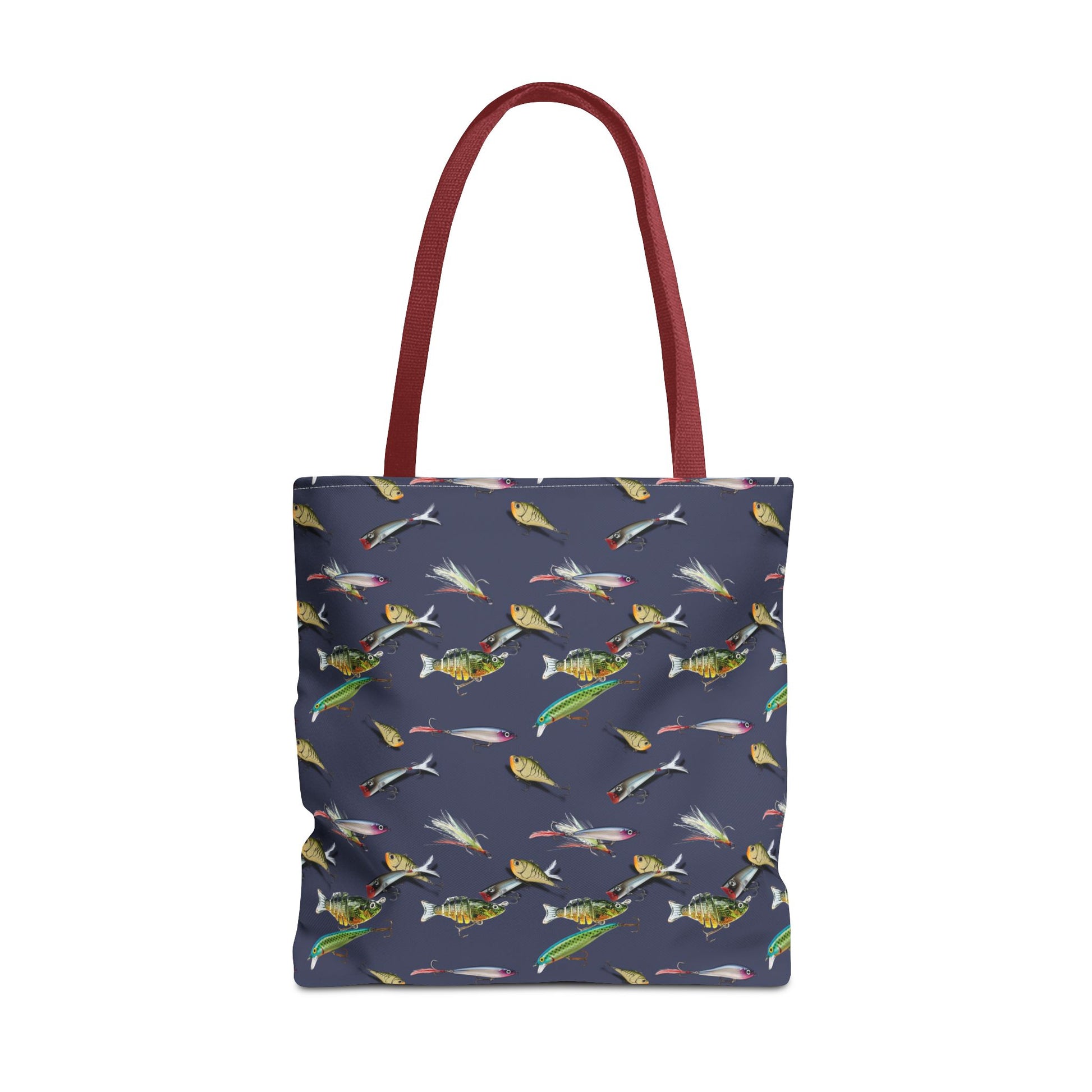 Our blue, green and red fishing lure print tote bag available in 3 sizes. We can personalize the bag.