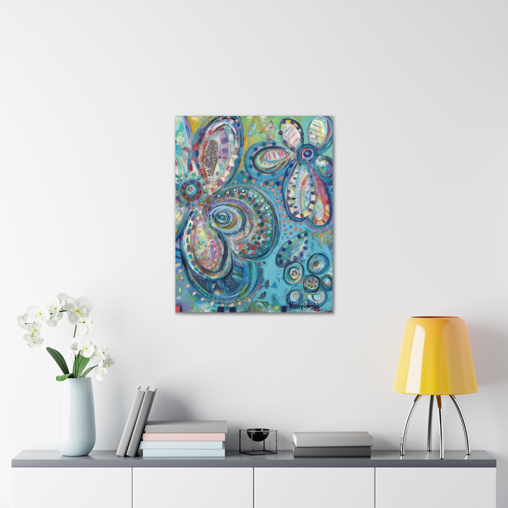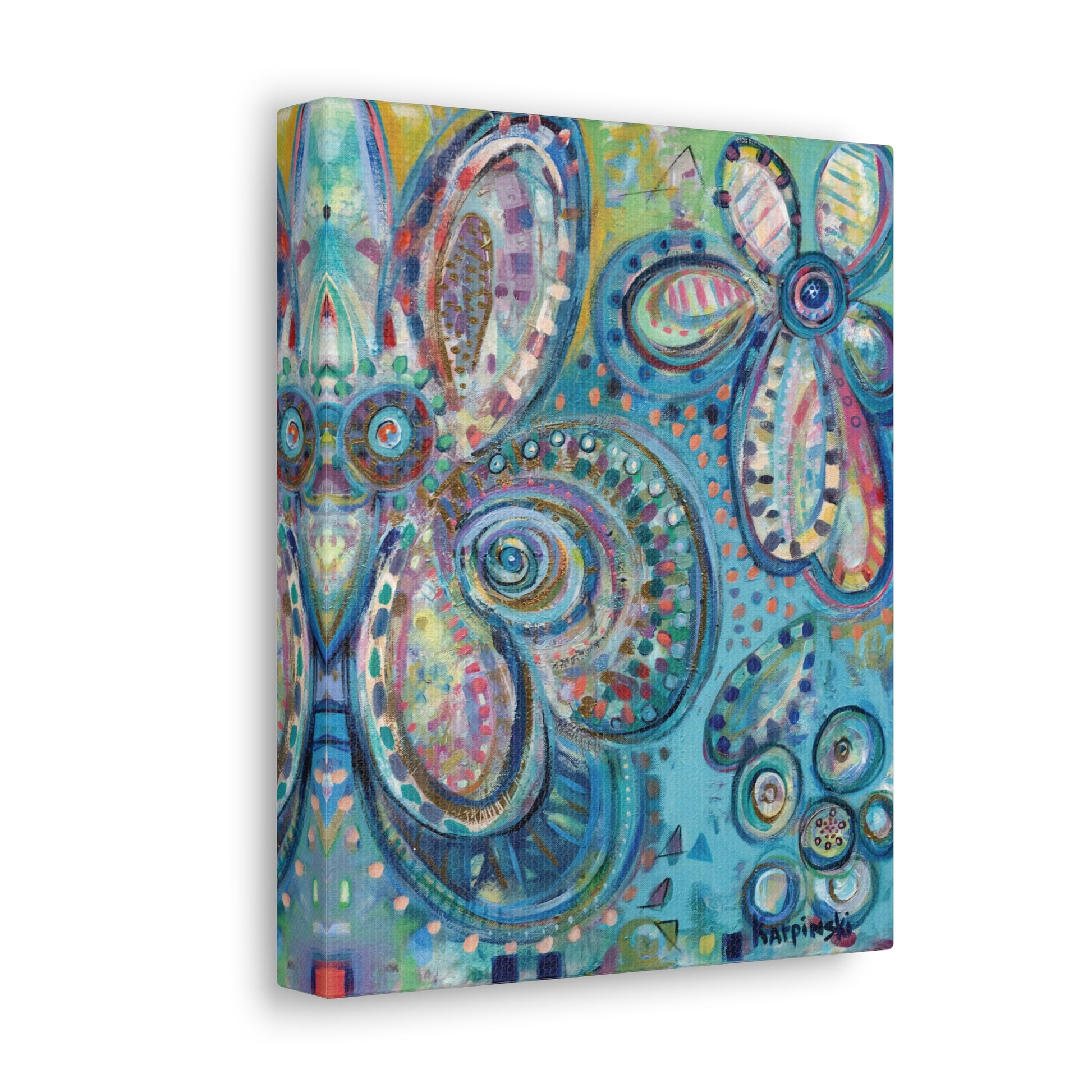 A gallery wrap canvas print of an original painting by Leslie Karpinski titled "World Love". A colorful contemporary painting featuring muted big blue flowers. A fun piece of art that will liven up a room!