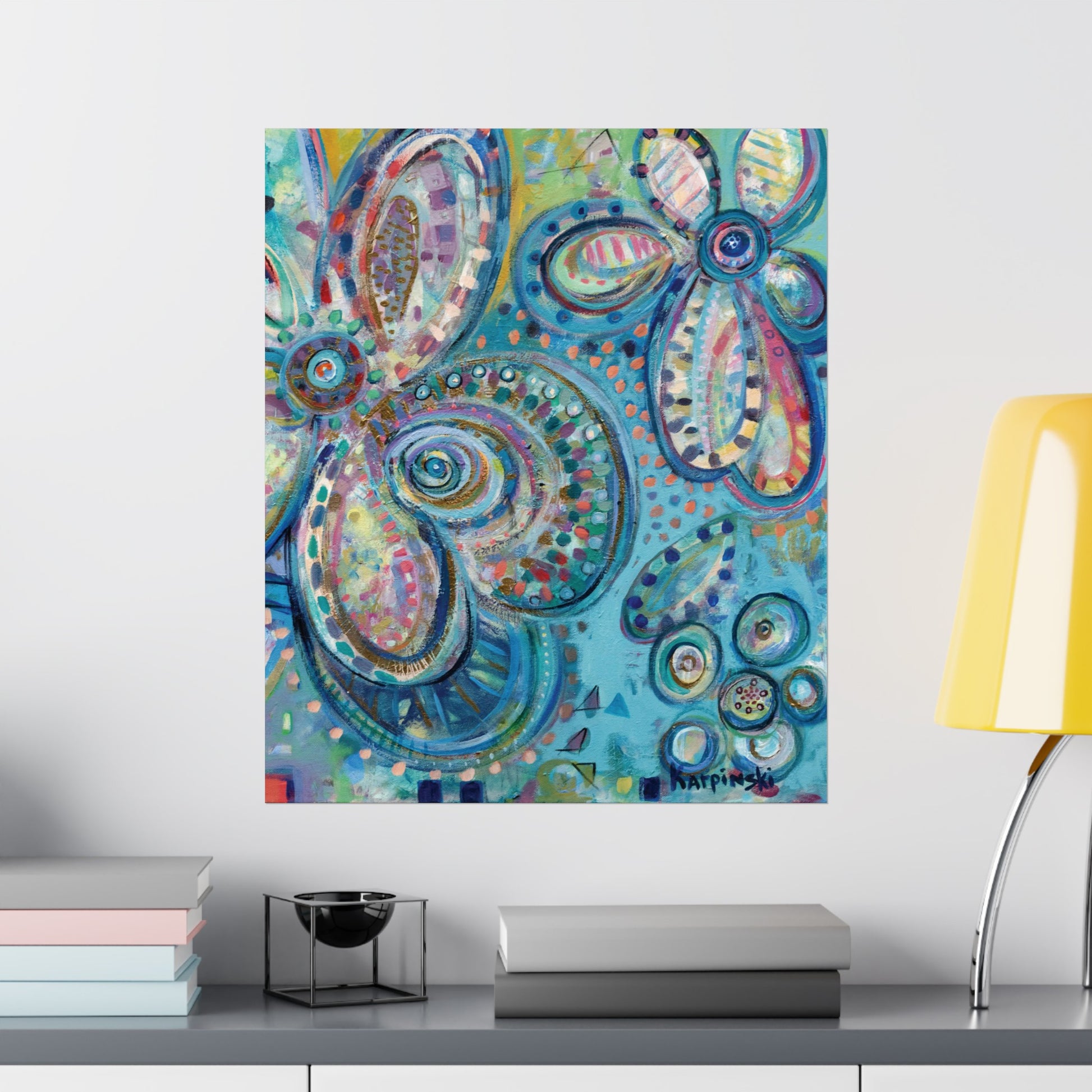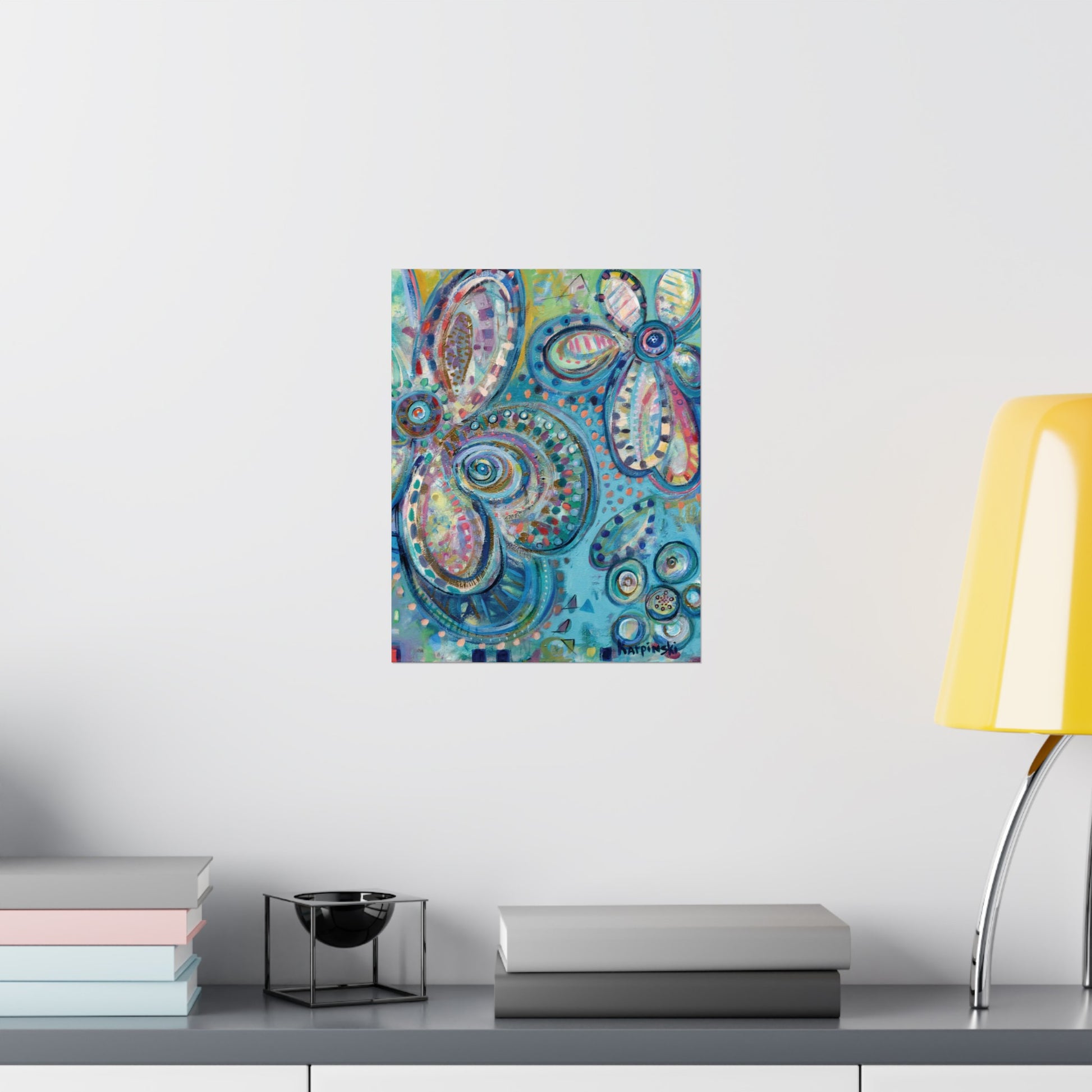 A poster print of an original painting by Leslie Karpinski titled "World Love". This one is for the bird enthusiasts! A colorful contemporary painting featuring muted big blue flowers. A fun piece of art that will liven up a room! The print is ready for framing.