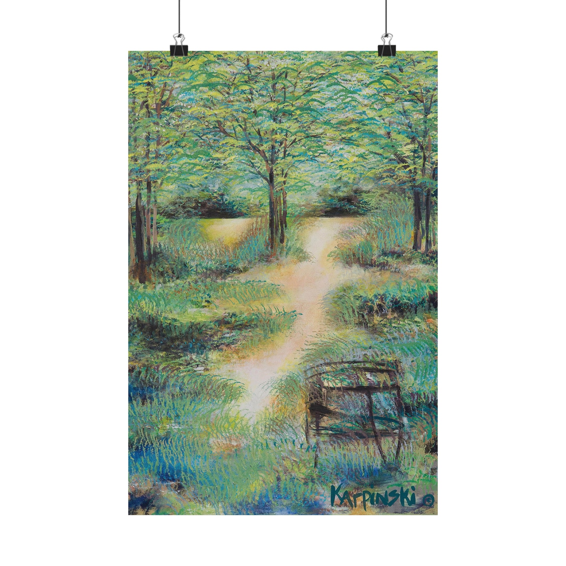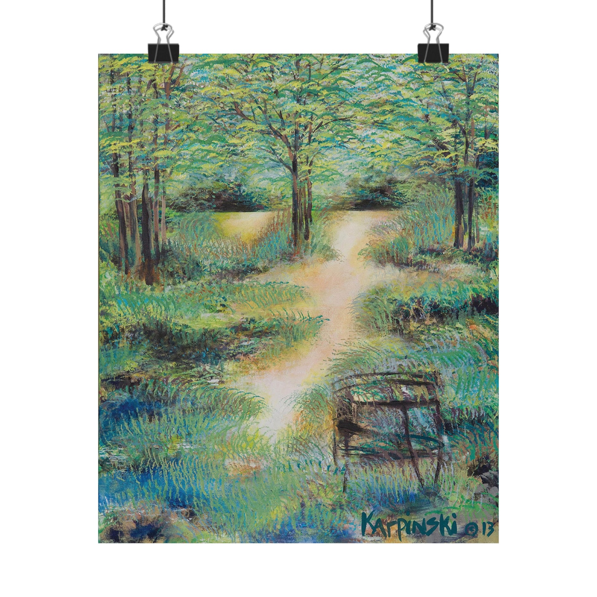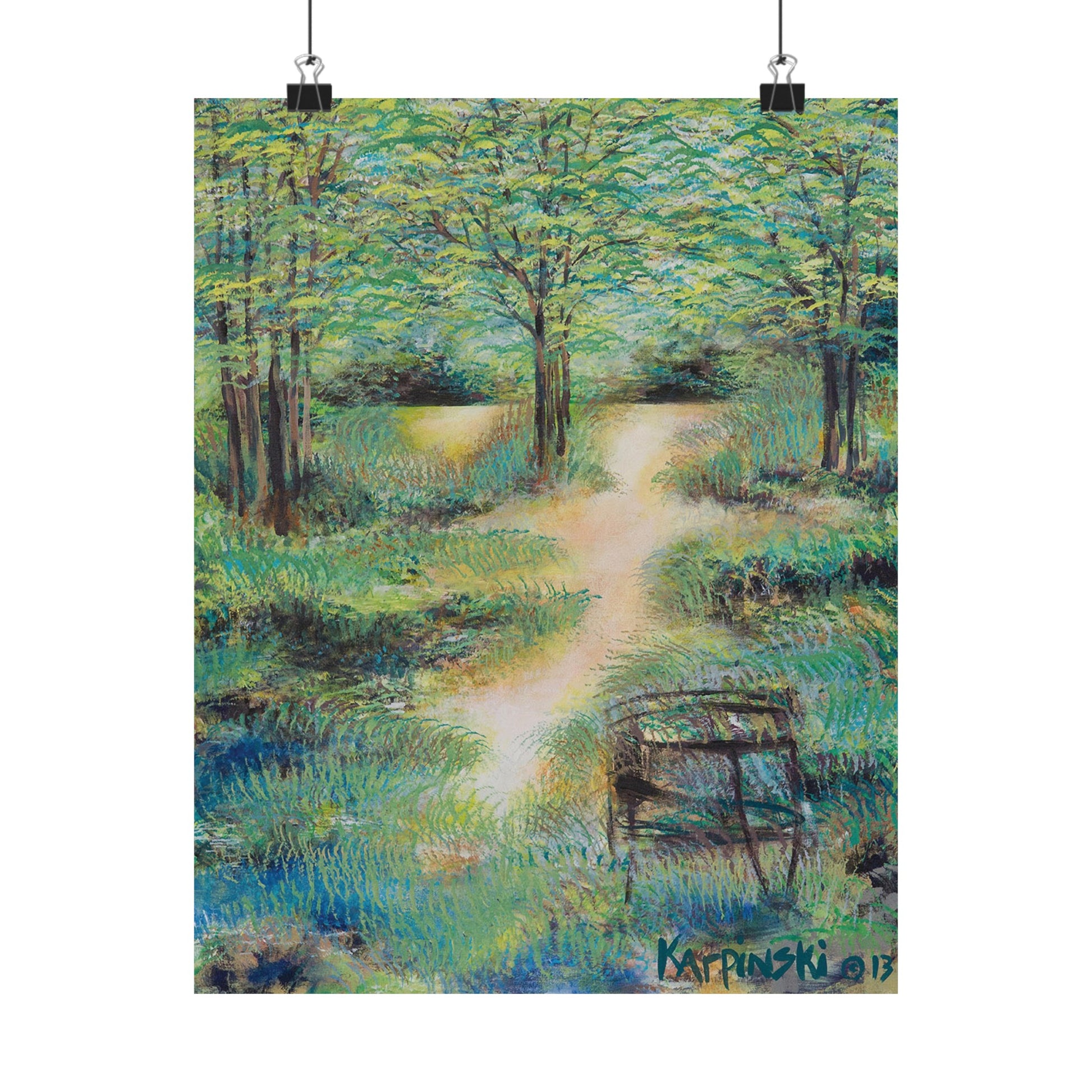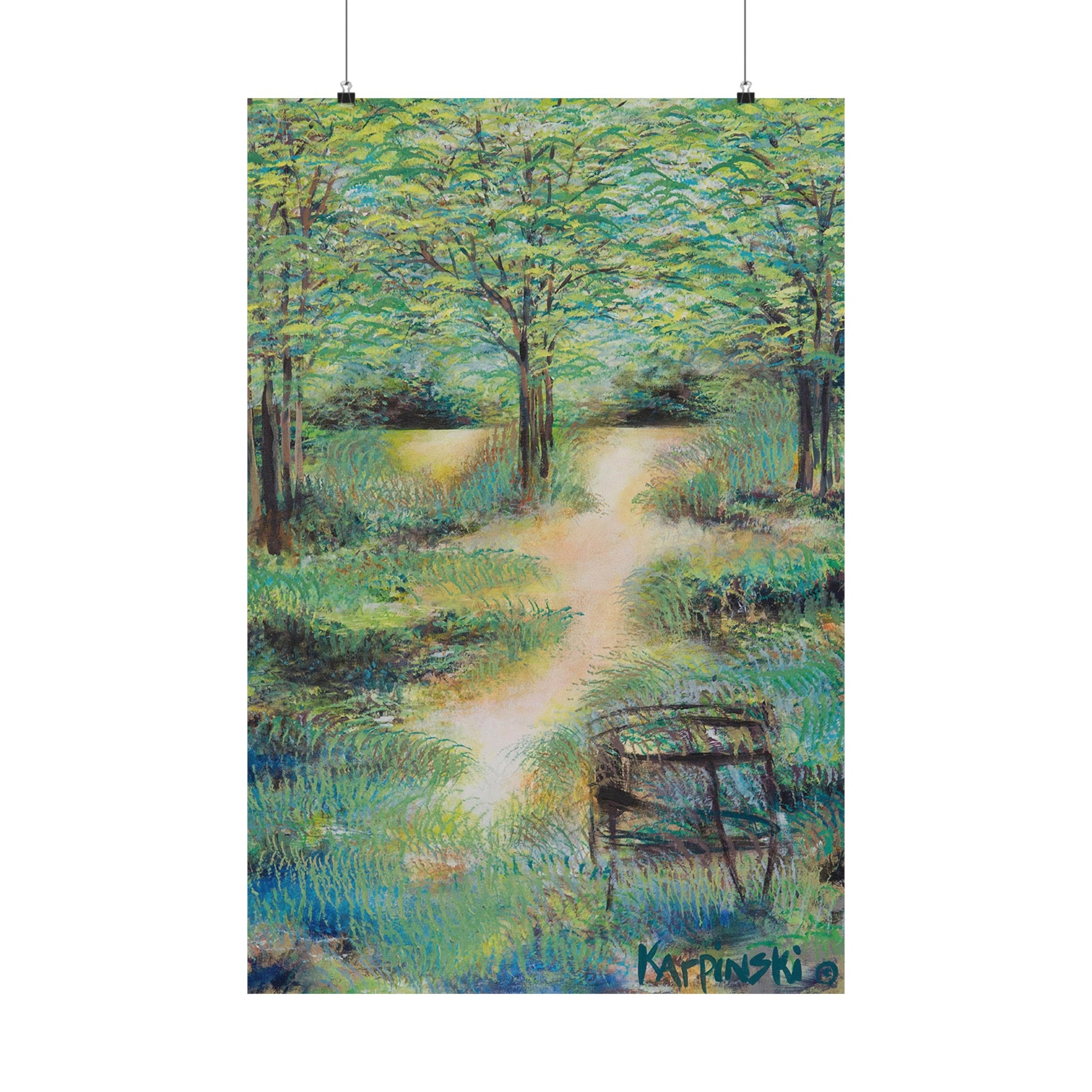 A poster print of an original painting by Leslie Karpinski titled "Nella's Garden". This print has cool tones of blues and greens with an inviting path that carries you through the woods.