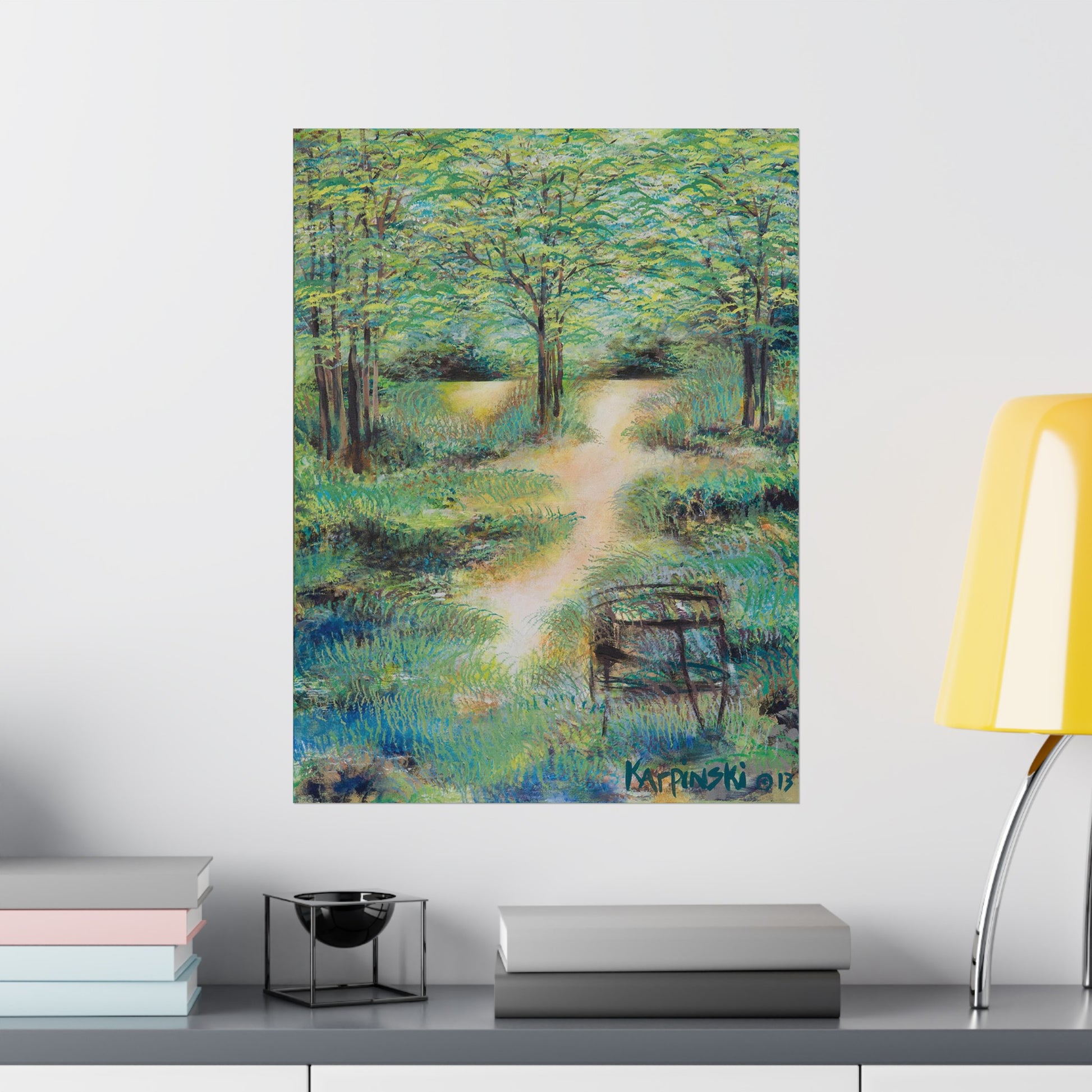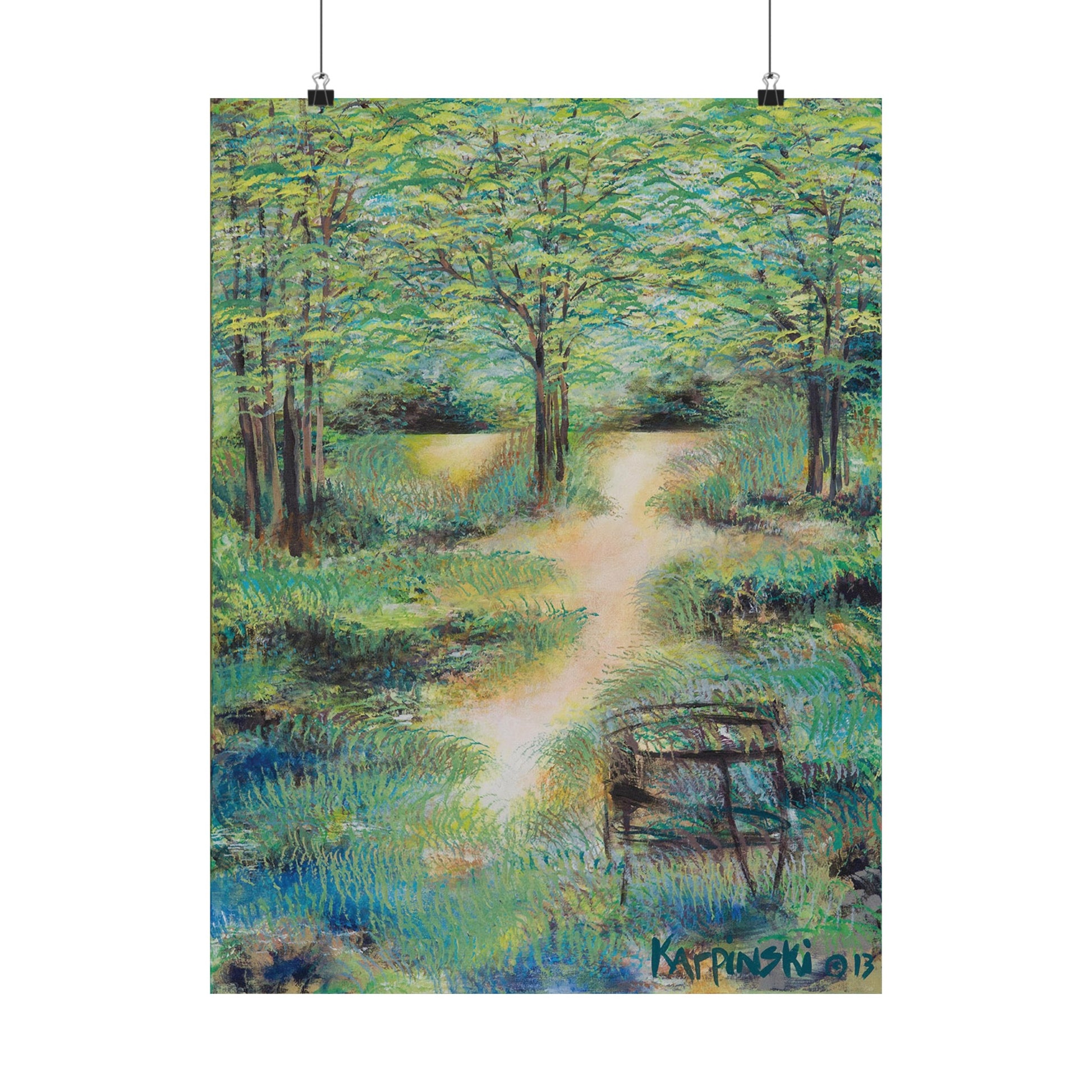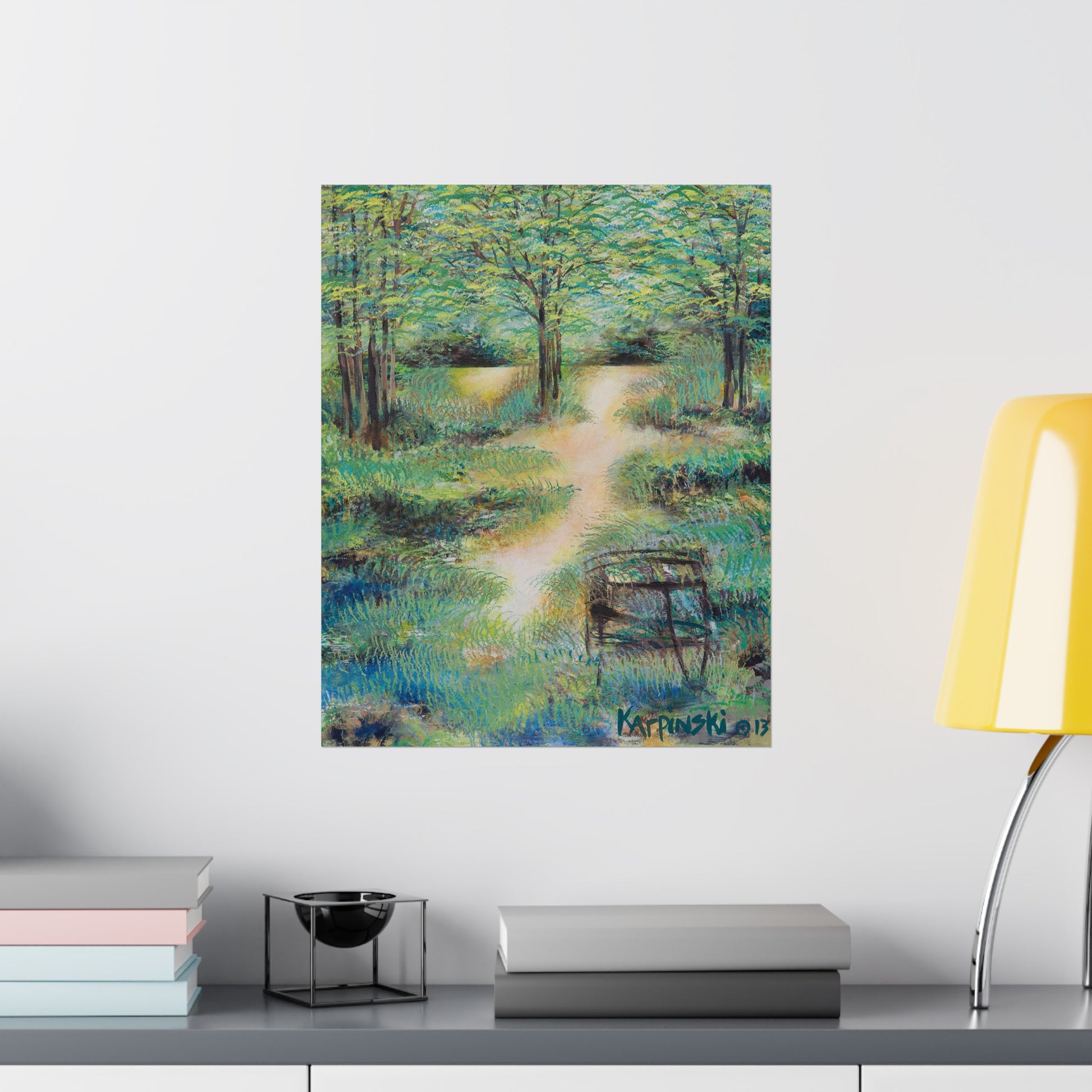 A poster print of an original painting by Leslie Karpinski titled "Nella's Garden". This print has cool tones of blues and greens with an inviting path that carries you through the woods.