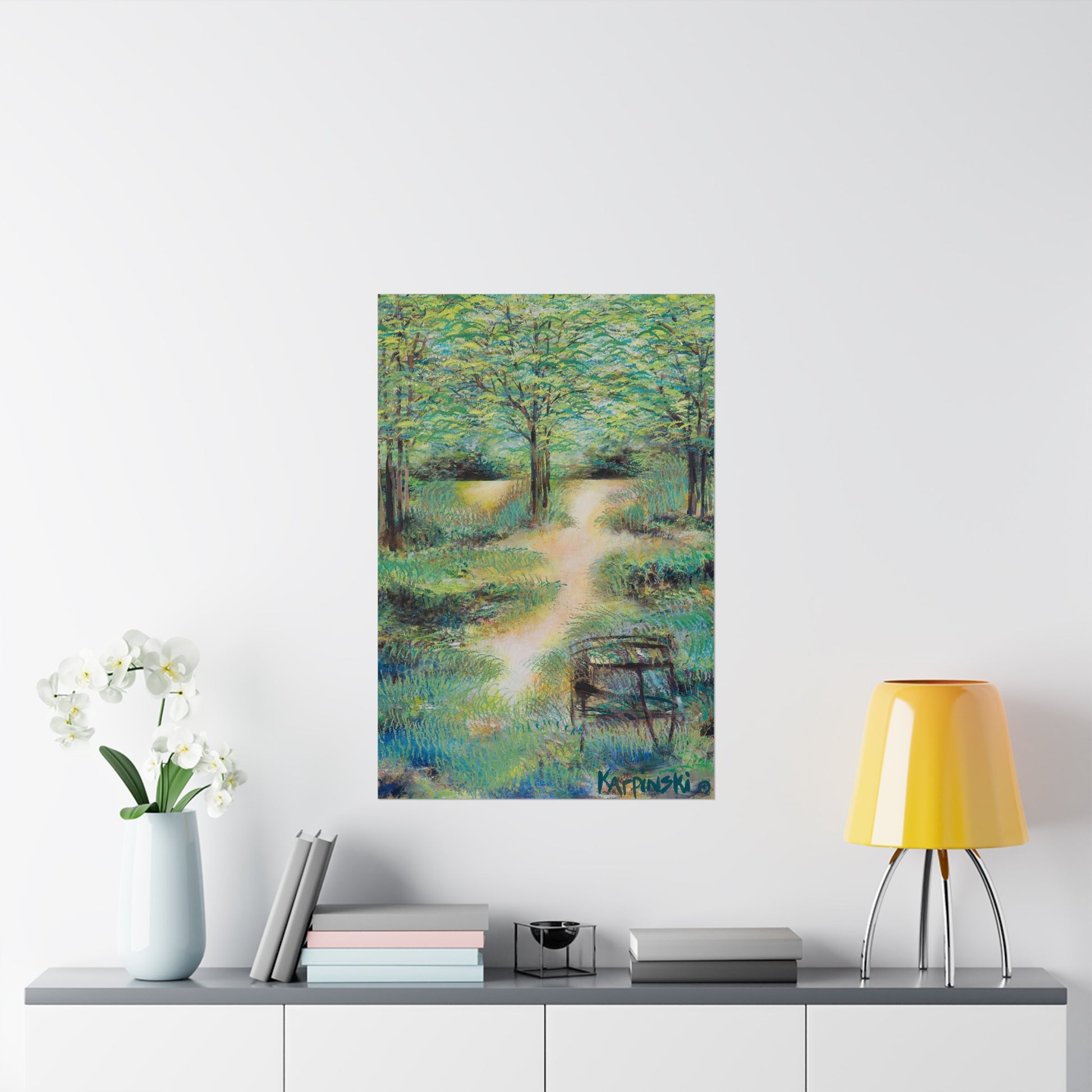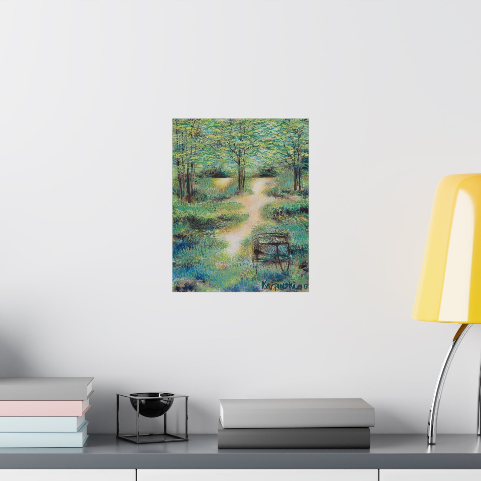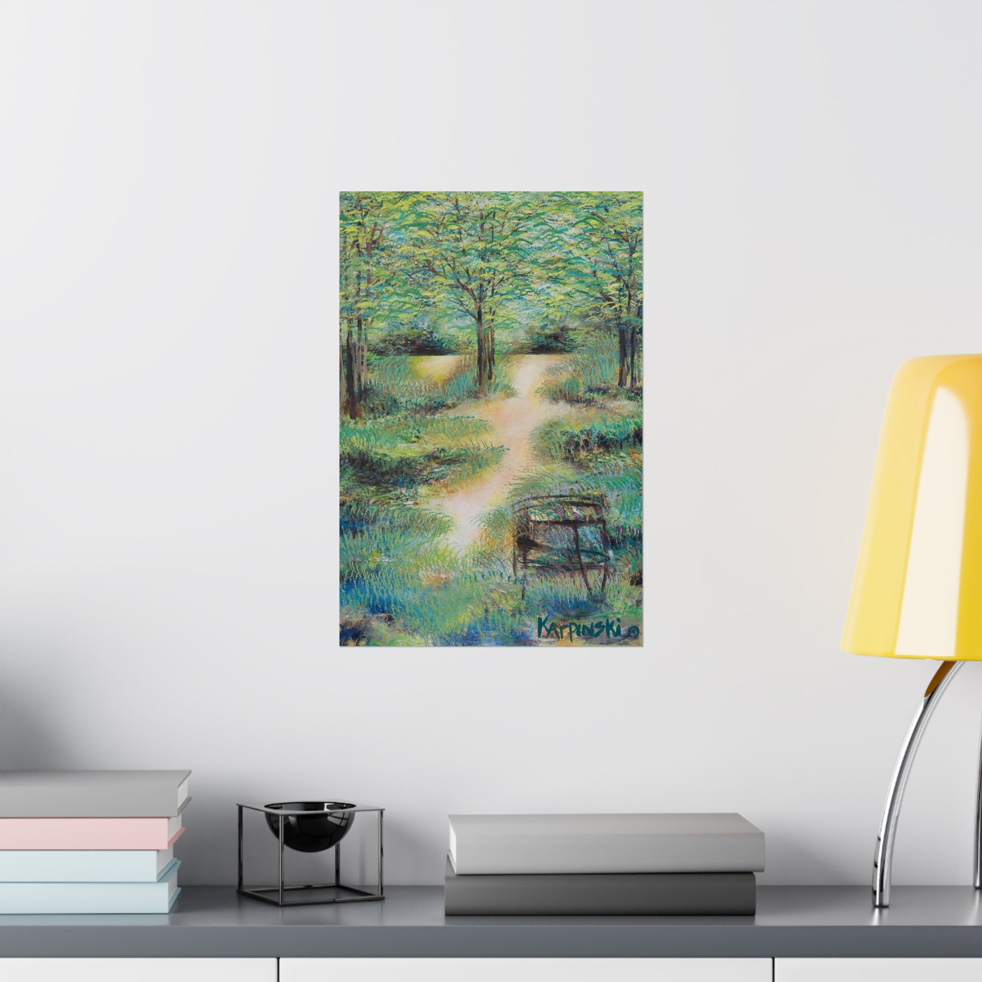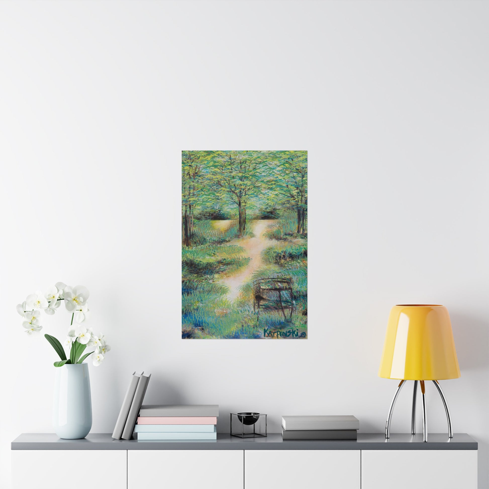 A poster print of an original painting by Leslie Karpinski titled "Nella's Garden". This print has cool tones of blues and greens with an inviting path that carries you through the woods.