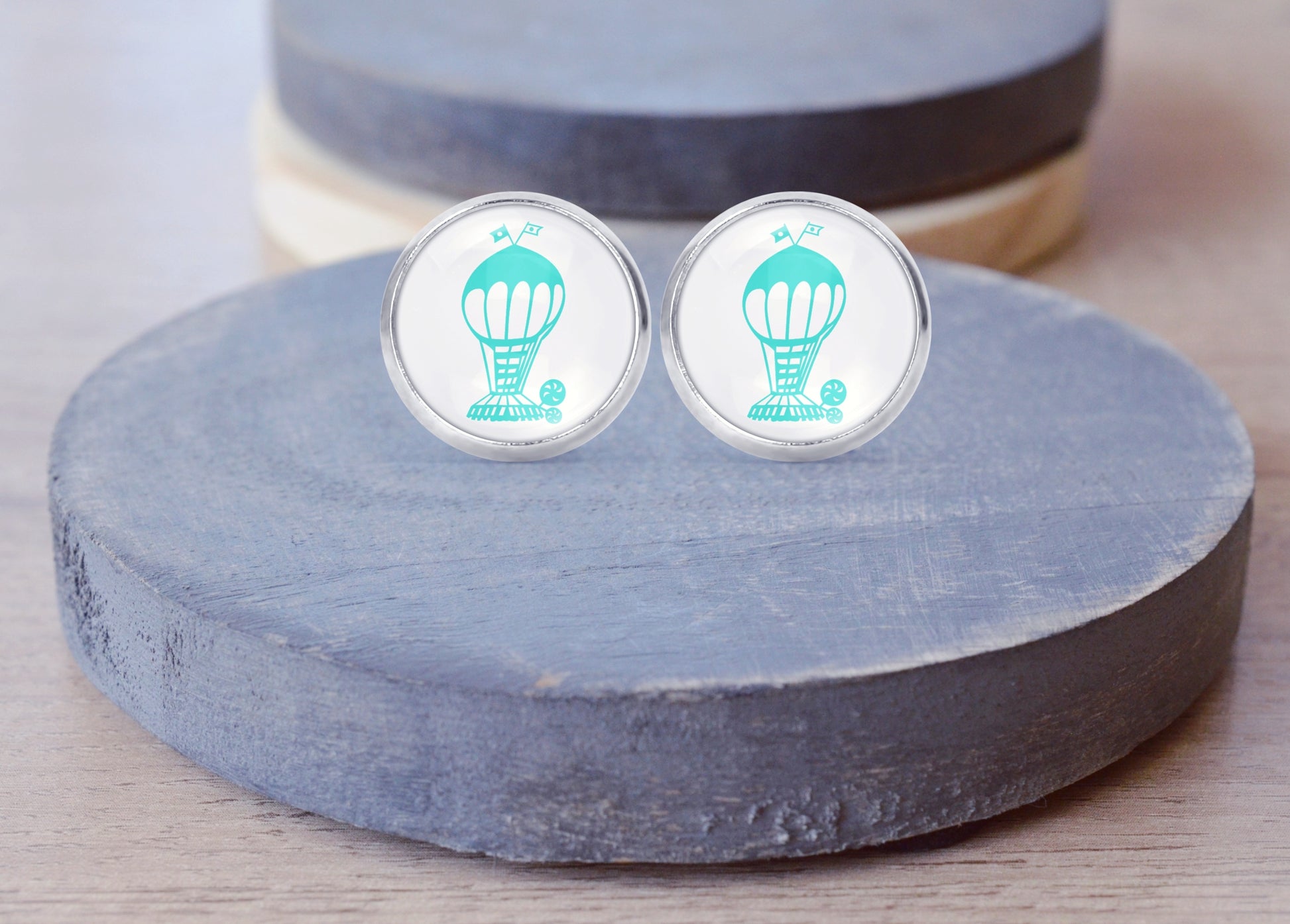 Stud earrings made with printed Hot Air Balloon Pyrex design set in nickel free post settings. Surgical steel or gold plated studs are also available. The earring measures 14mm (.55") across. 12mm (.47") and 16mm (.62") also available.
