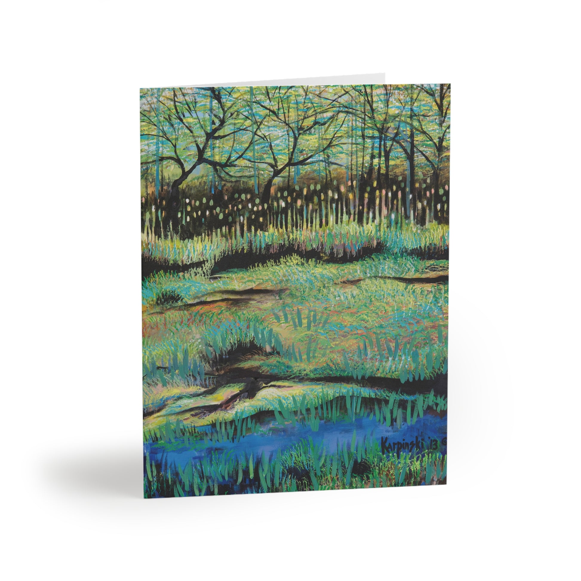 A multi pack of greeting cards with Leslie Karpinski's original painting "Cattails At Lake Katherine". We have 8, 16 and 24 packs. The cards measure 4.25" x 5.5". Each greeting card come with a white envelope. The inside of the greeting card is blank.