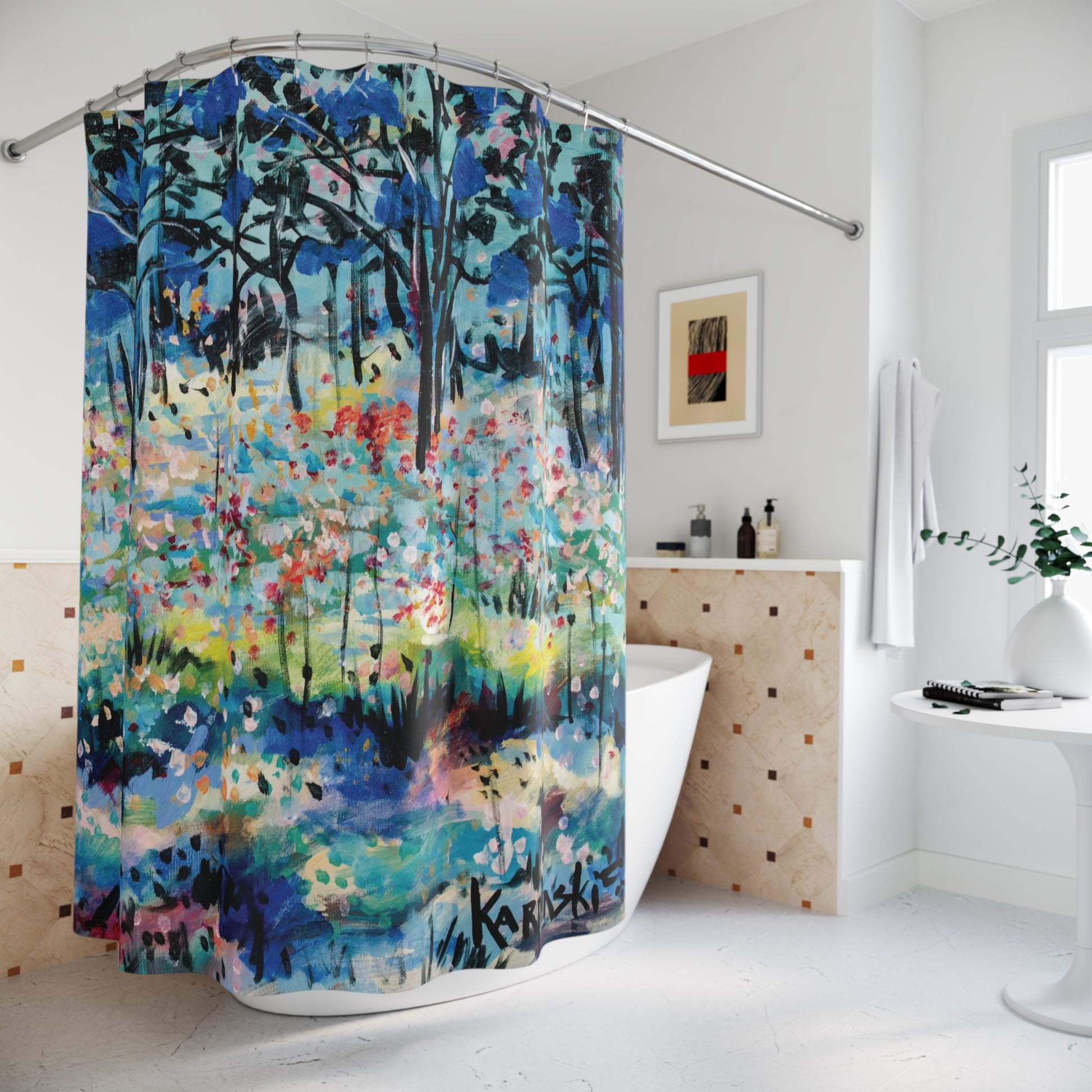 Dotted Landscape is an original painting by Leslie Karpinski now available printed on a 100% polyester shower curtain. The shower curtain is printed in North Carolina on an imported blank. A plastic liner is recommended.