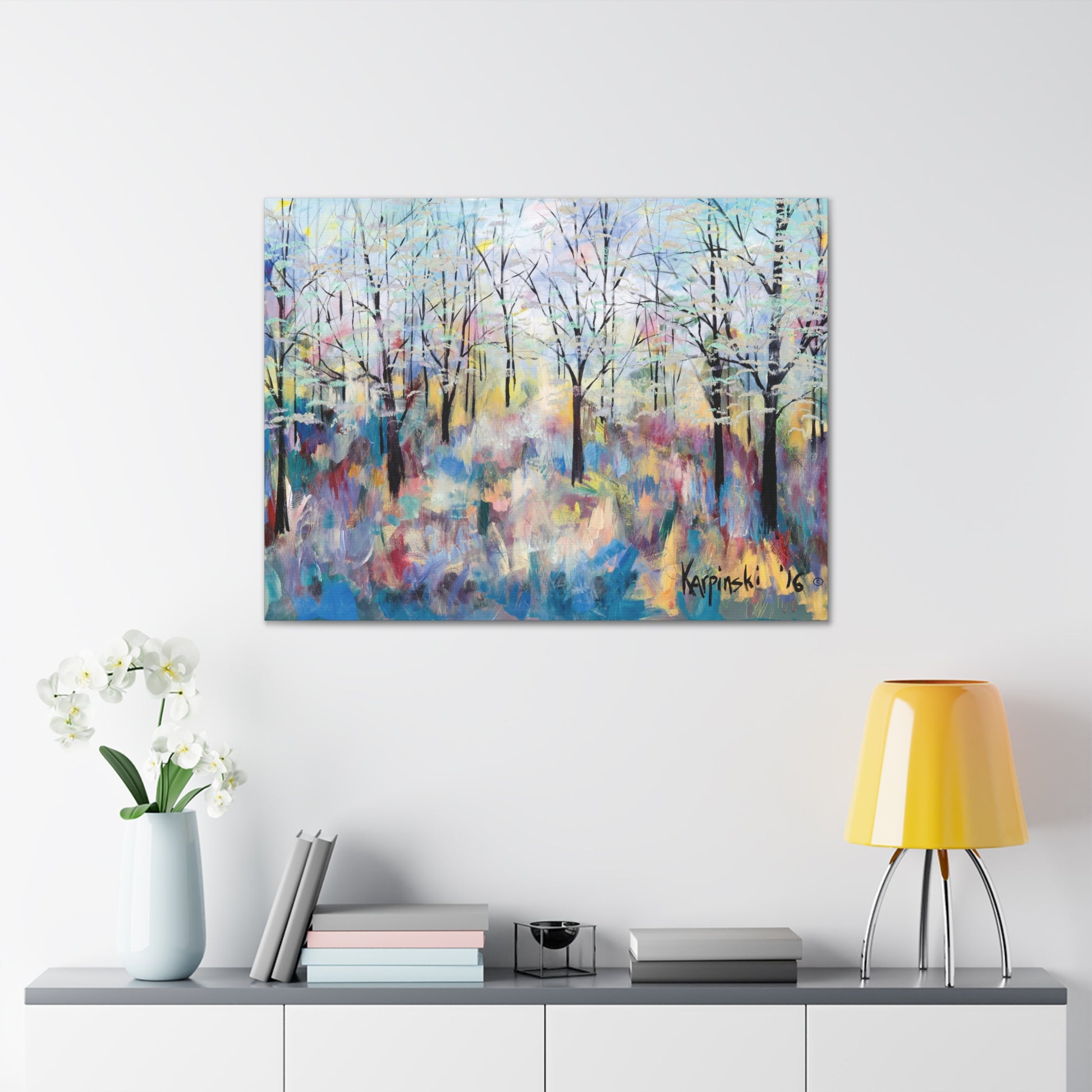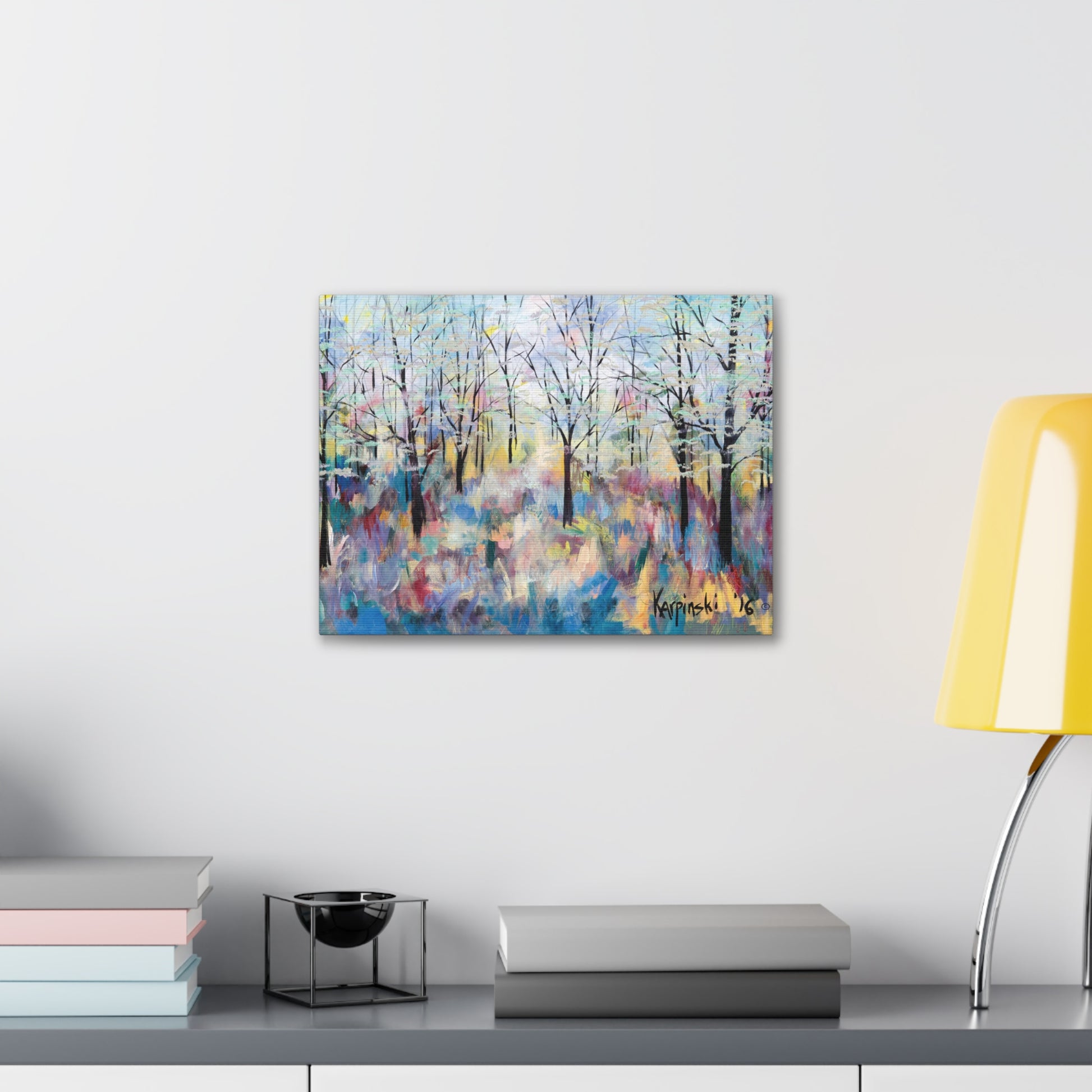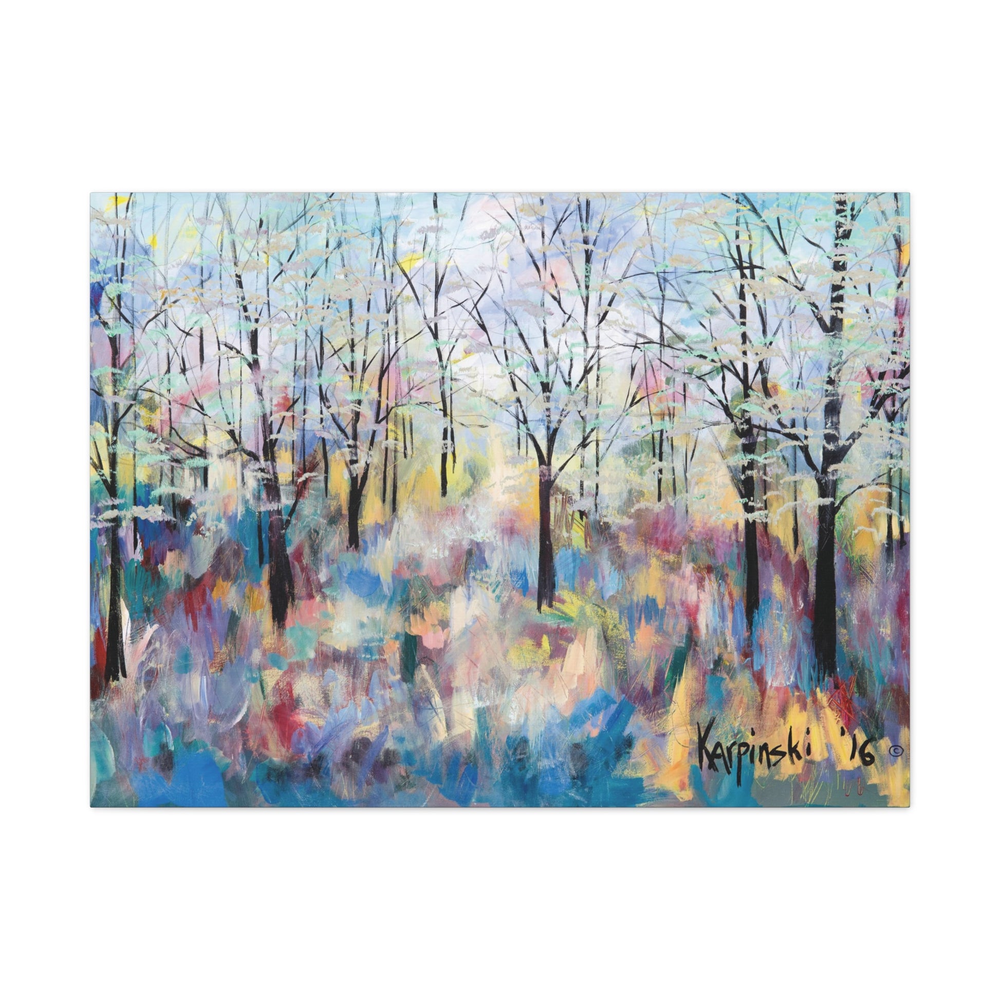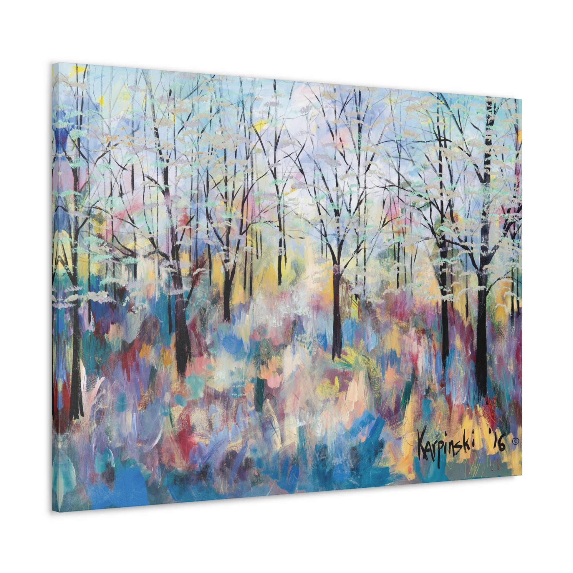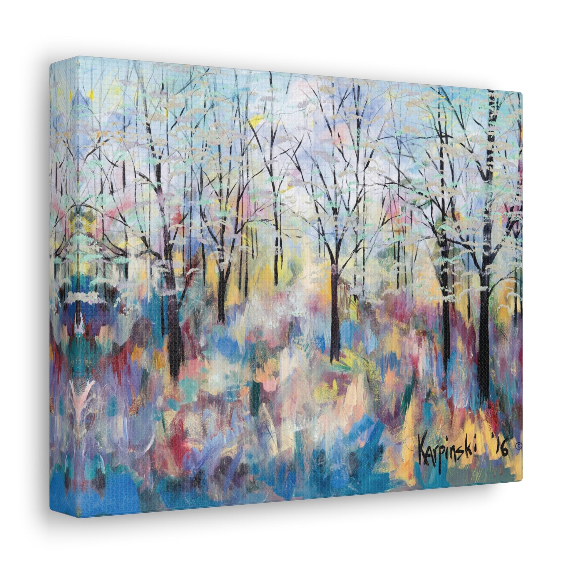 A gallery wrap canvas print of an original painting by Leslie Karpinski titled "Blue Ridge Parkway". A contemporary painting featuring spring time trees and flowers off the Blue Ridge Parkway in North Carolina.