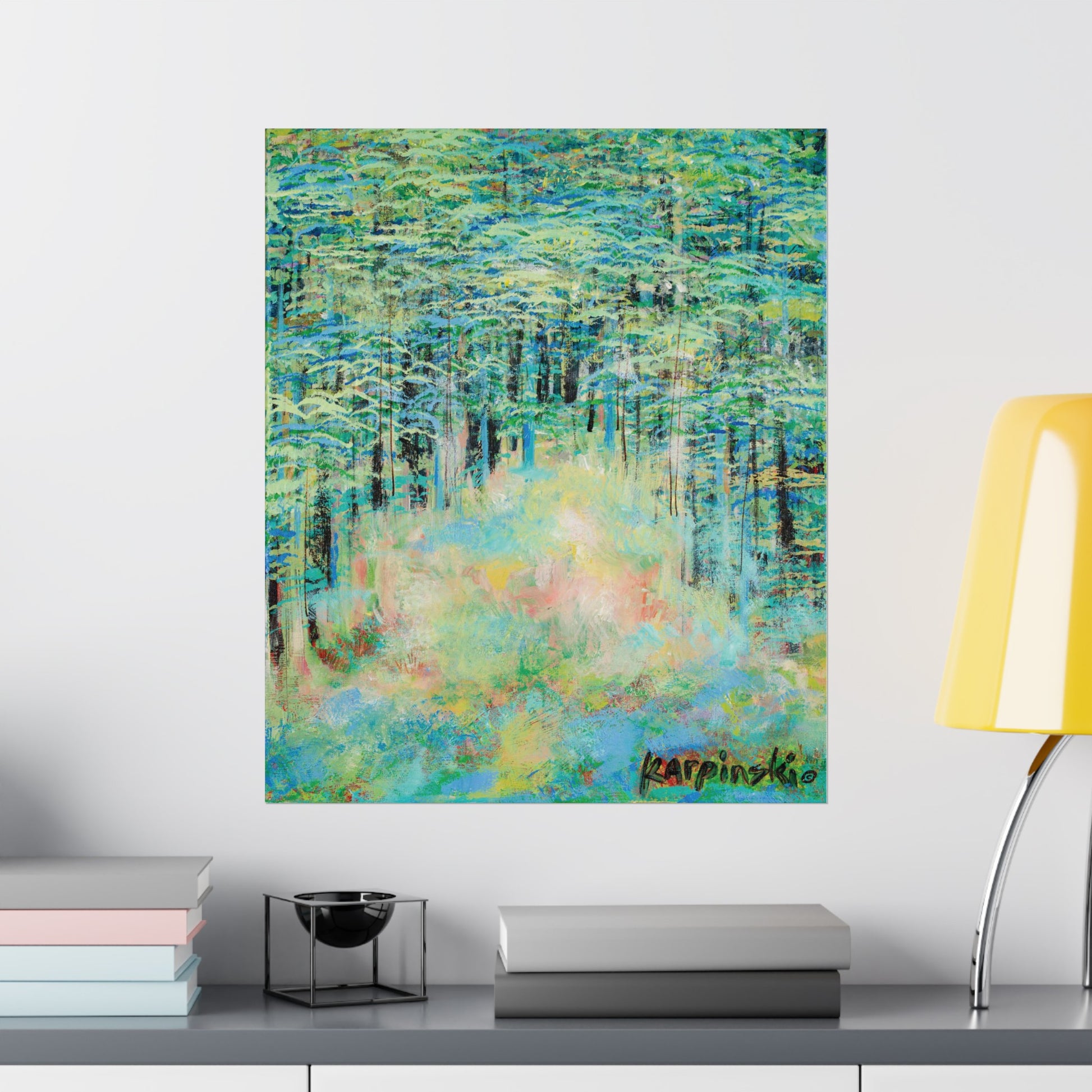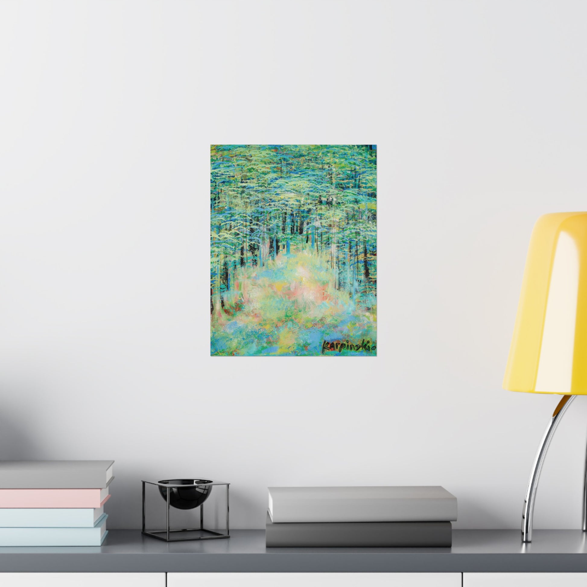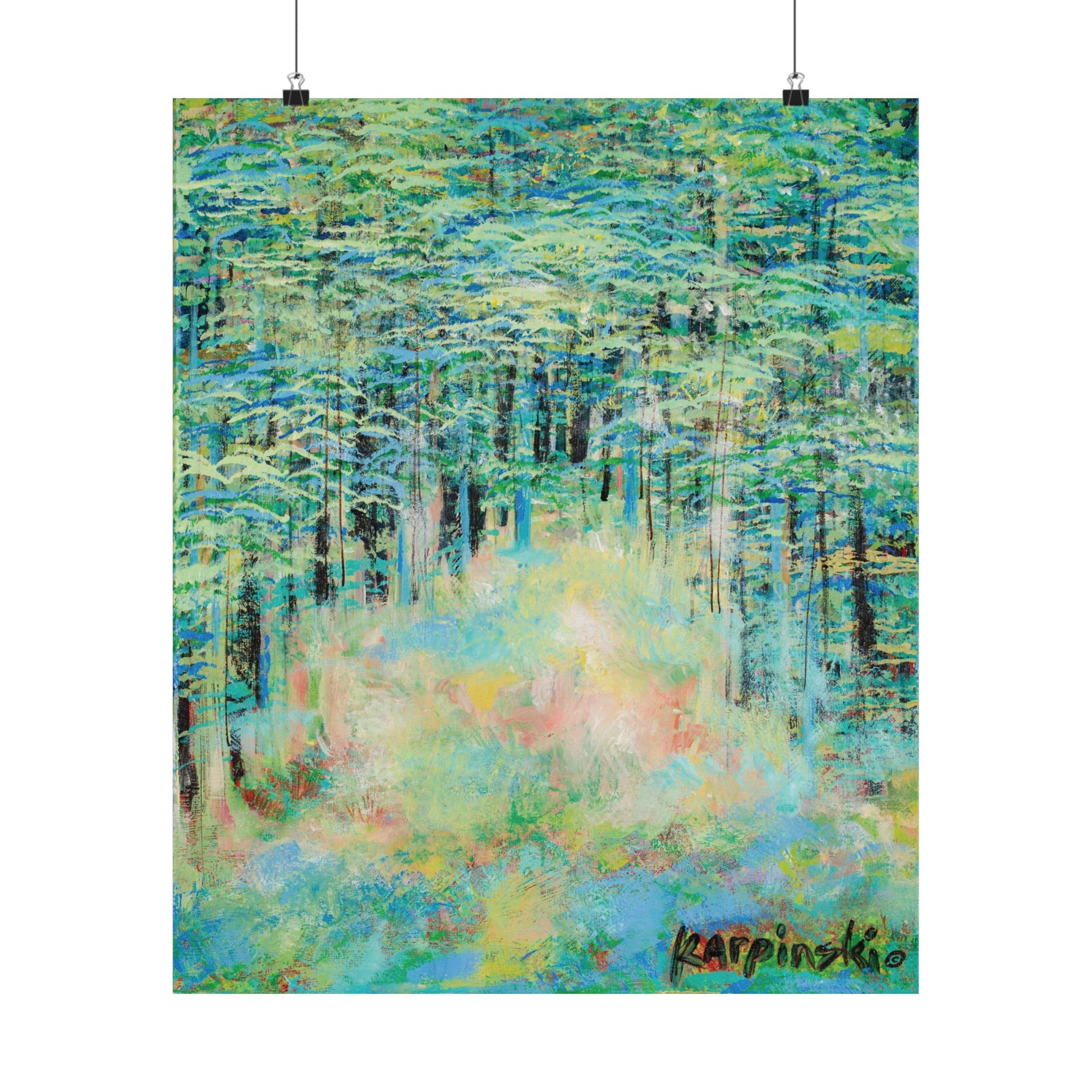 A poster print of an original painting by Leslie Karpinski titled "Springtime Forest". Cool toned landscape art available in many sizes. It would make a great piece for your living room, dining room, office or wherever you want to hang a beautiful art!