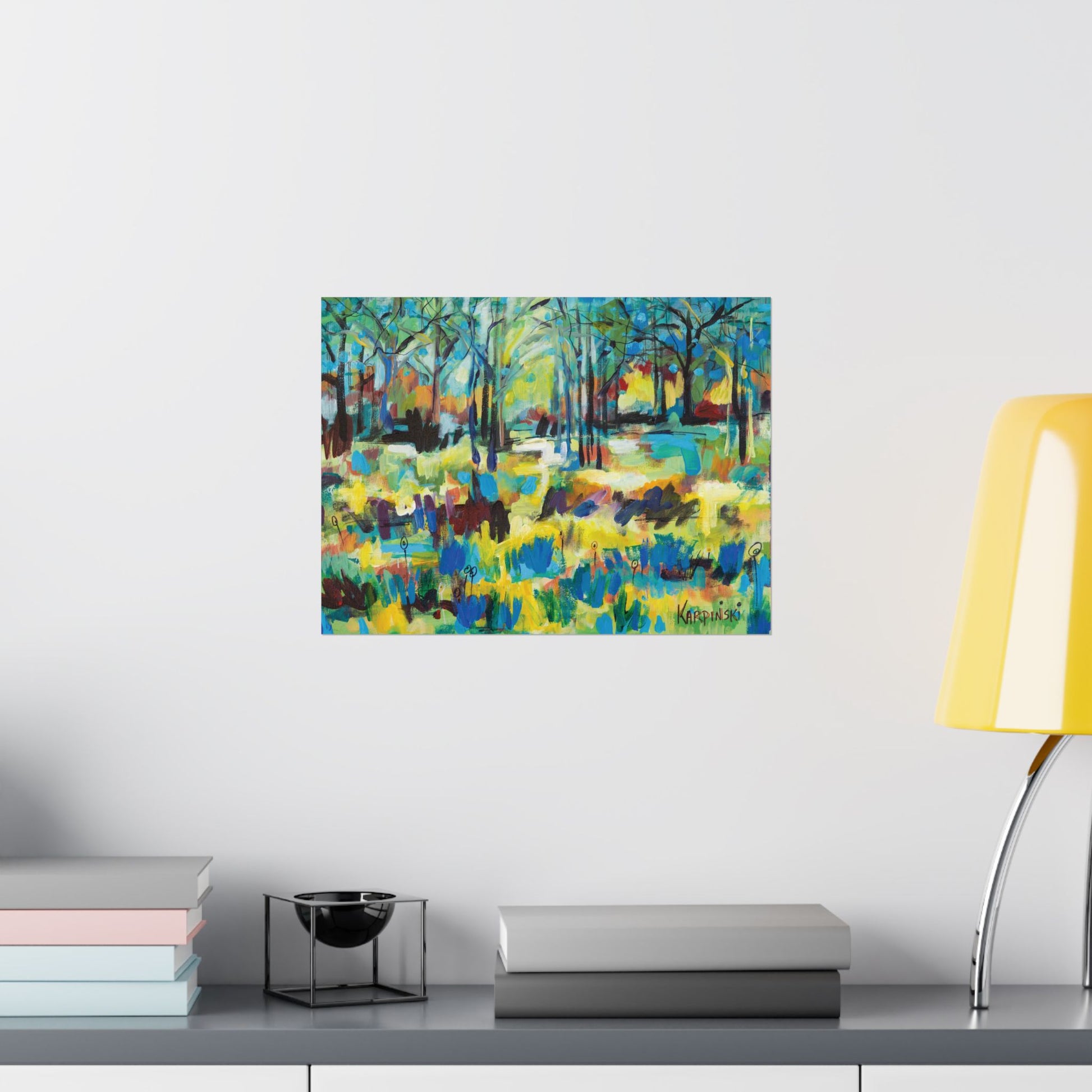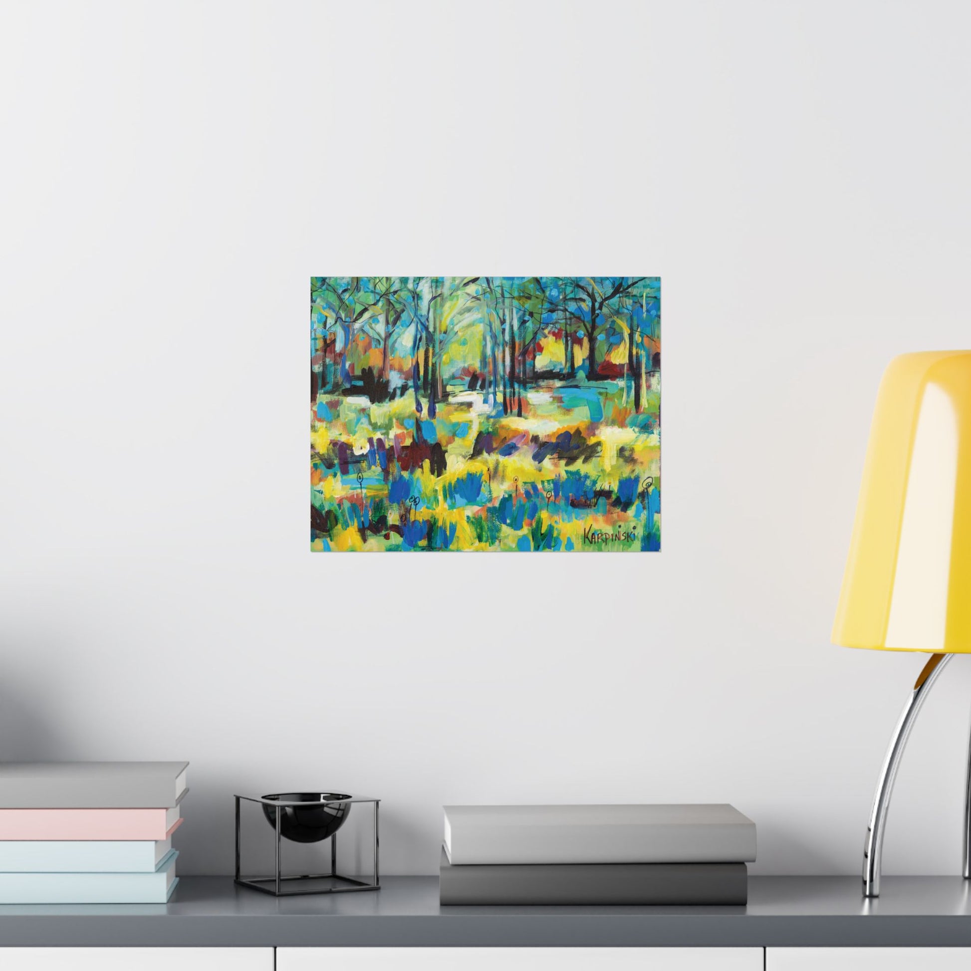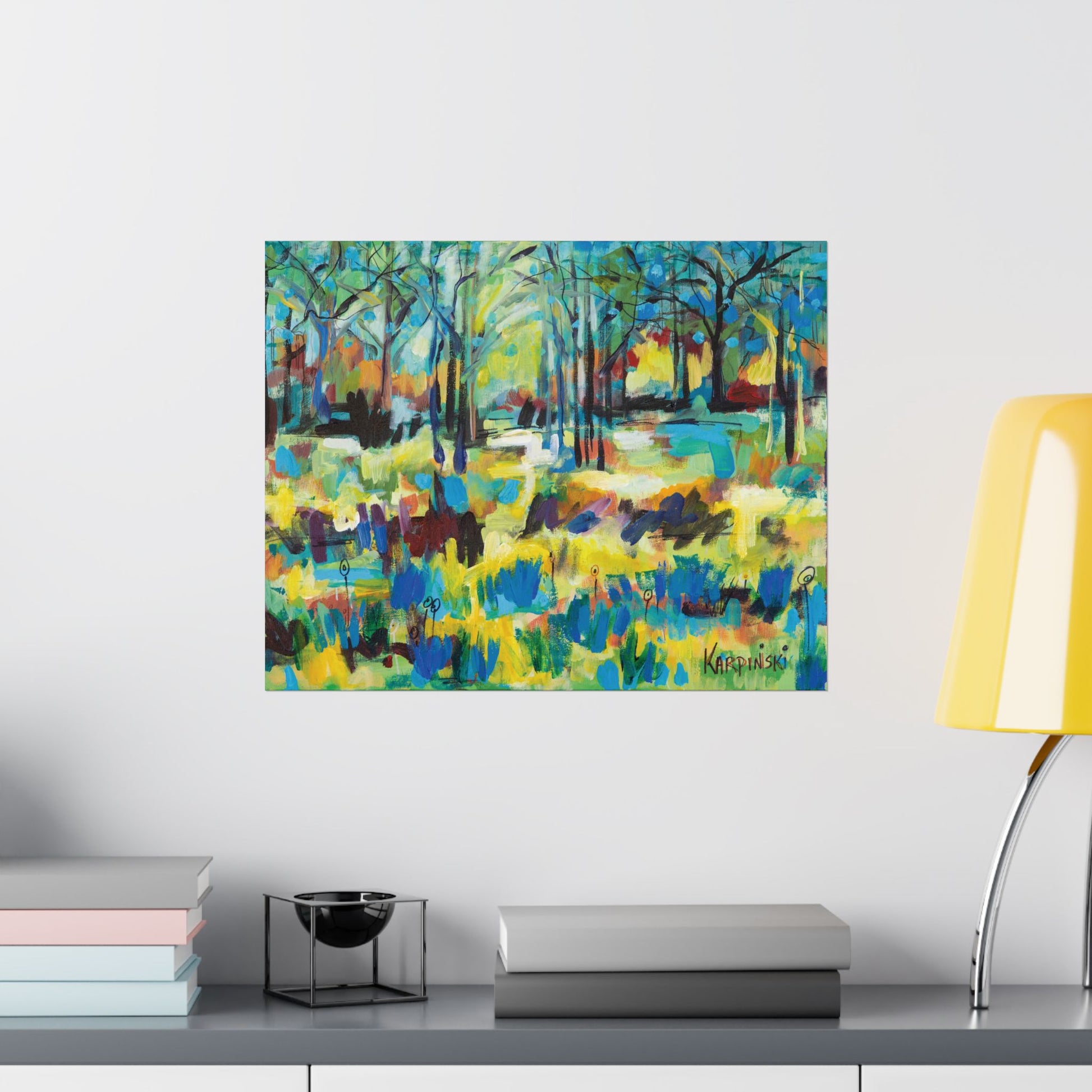 A fine art poster print of an original painting by Leslie Karpinski titled "Color Blast Through Trees". A colorful contemporary painting featuring yellows, oranges and blues tones in the ground covering of a forest. This is truly a color blast.