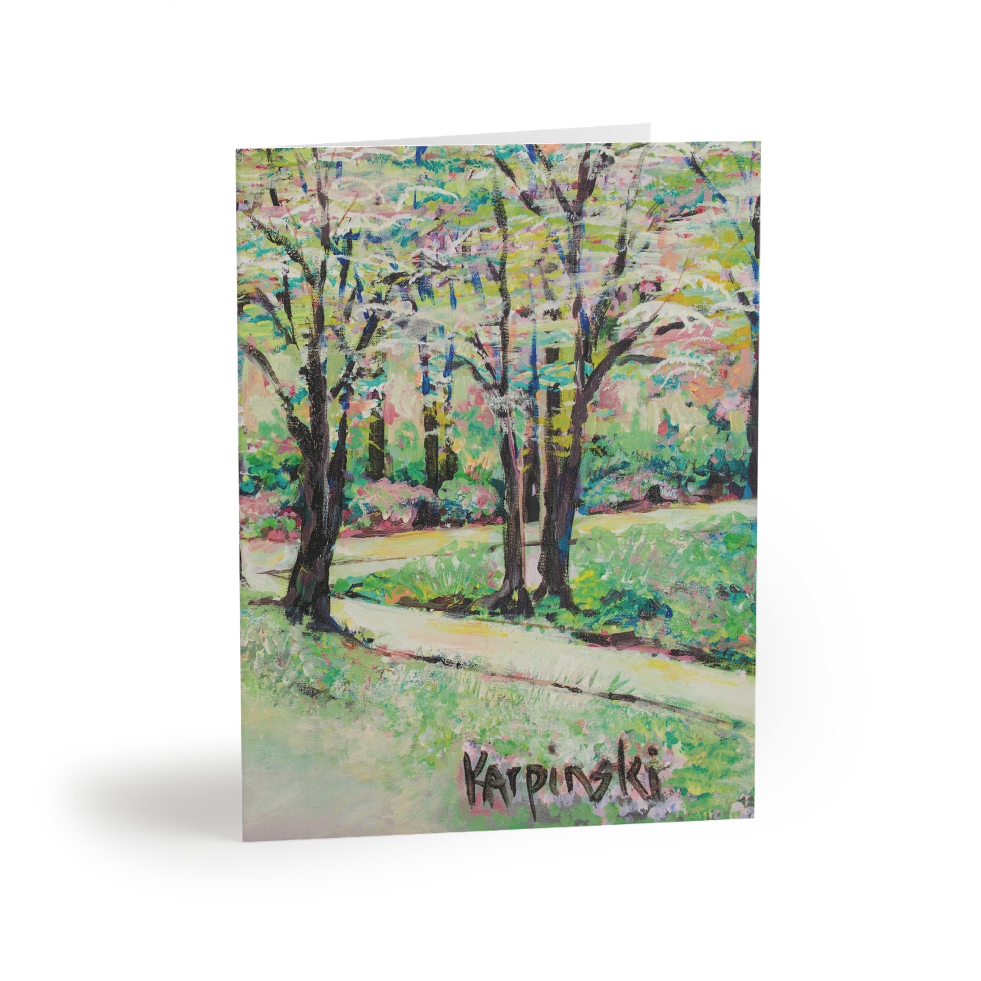 A multi pack of greeting cards with Leslie Karpinski's original painting "Bottom of Reynolda". We have 8, 16 and 24 packs. The cards measure 4.25" x 5.5". Each greeting card come with a white envelope. The inside of the card is blank.