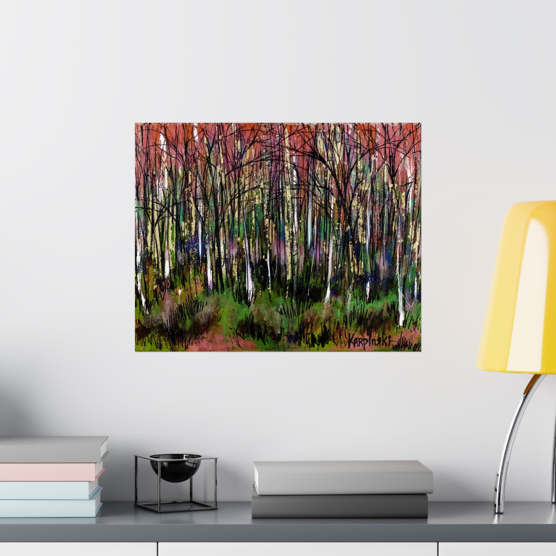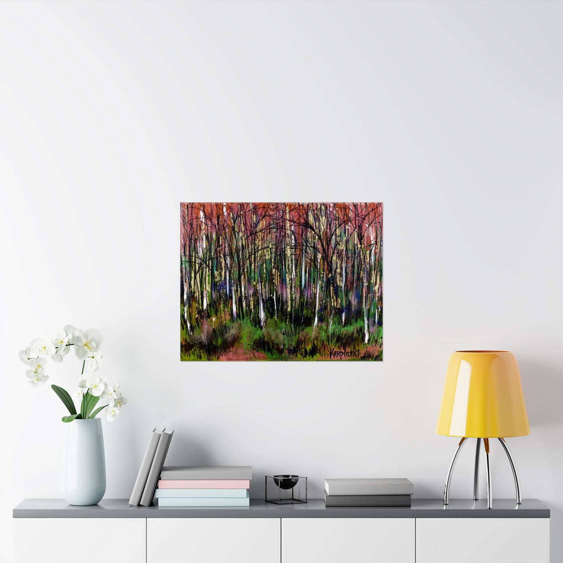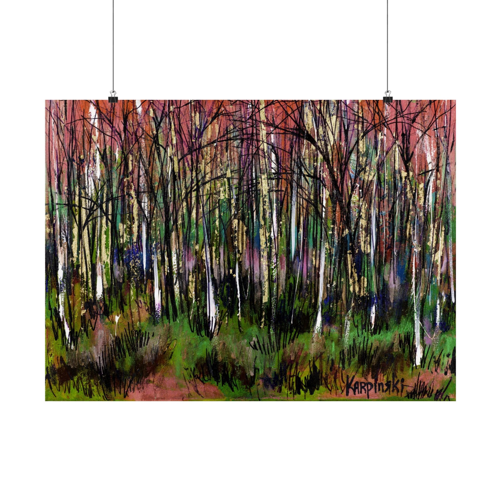 A poster print of an original painting by Leslie Karpinski titled "Trees of Fire". This beautiful landscape painting has skies ablaze with pinks and red.