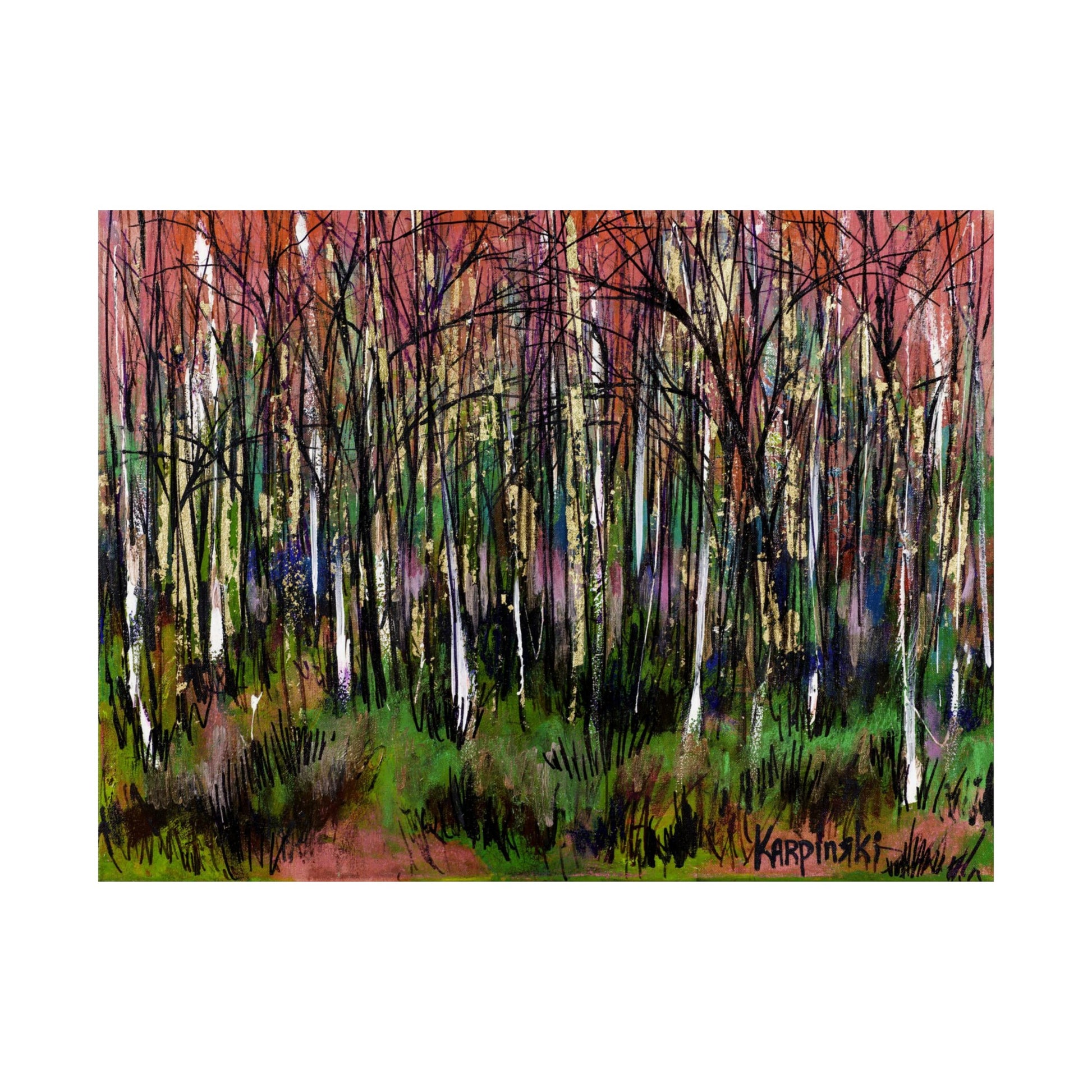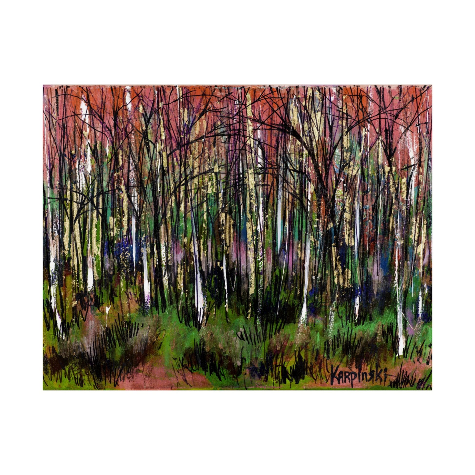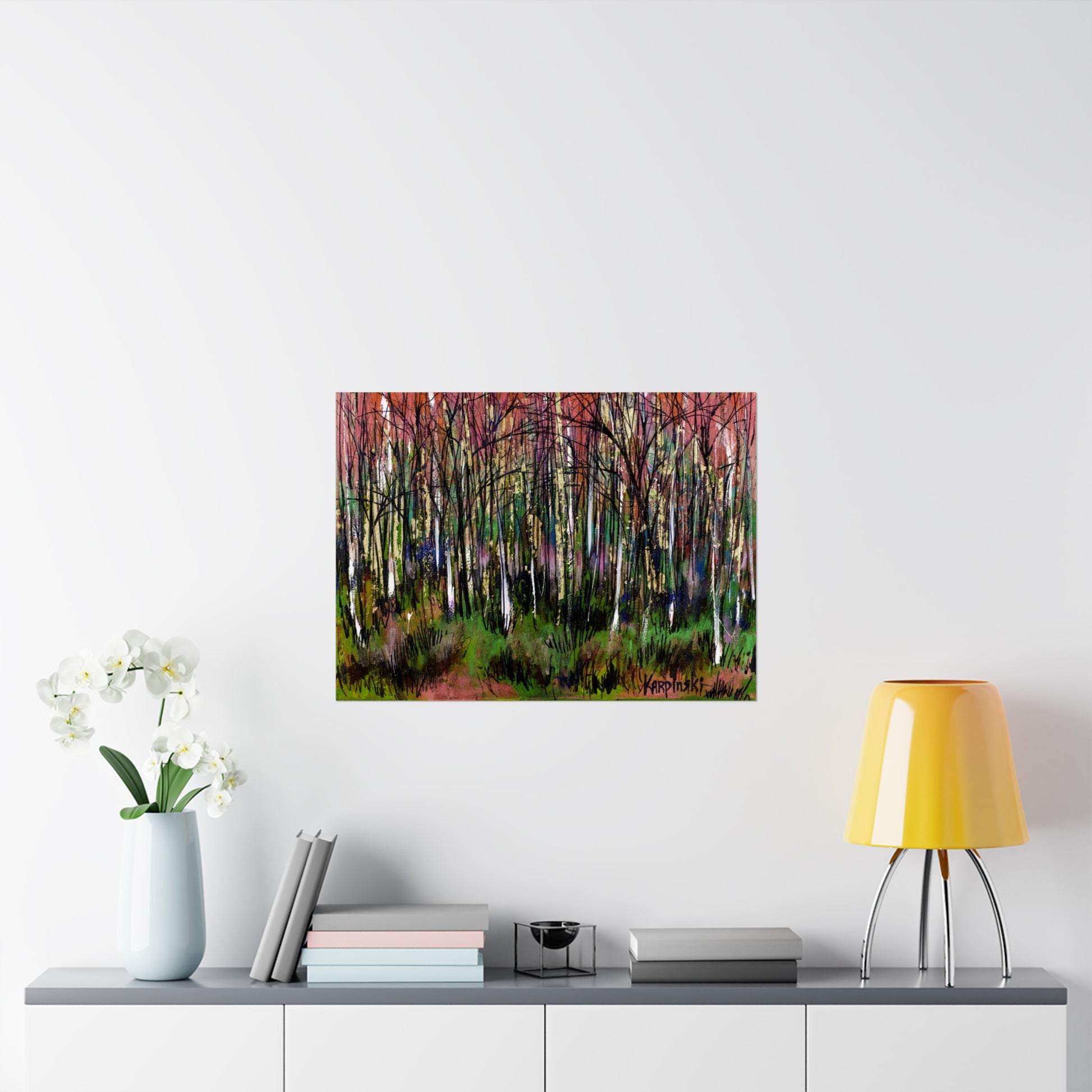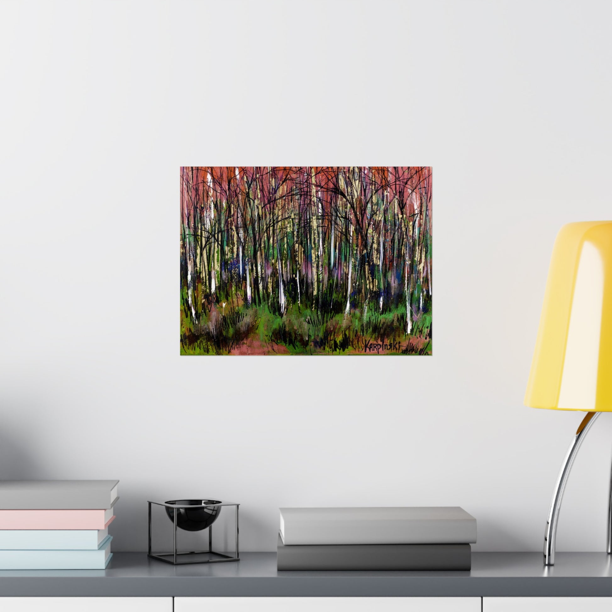 A poster print of an original painting by Leslie Karpinski titled "Trees of Fire". This beautiful landscape painting has skies ablaze with pinks and red.
