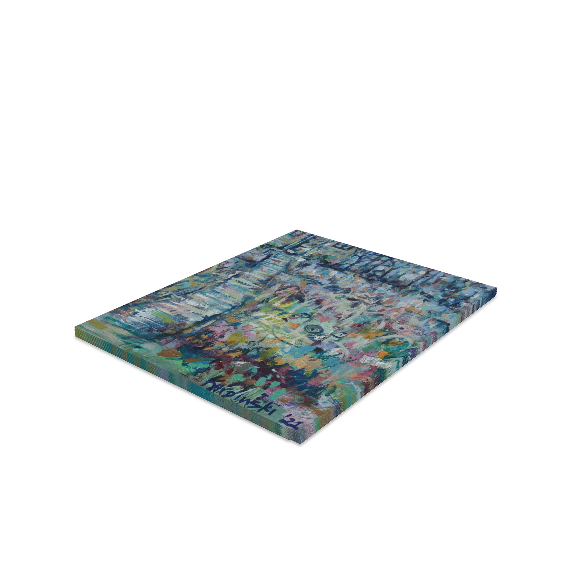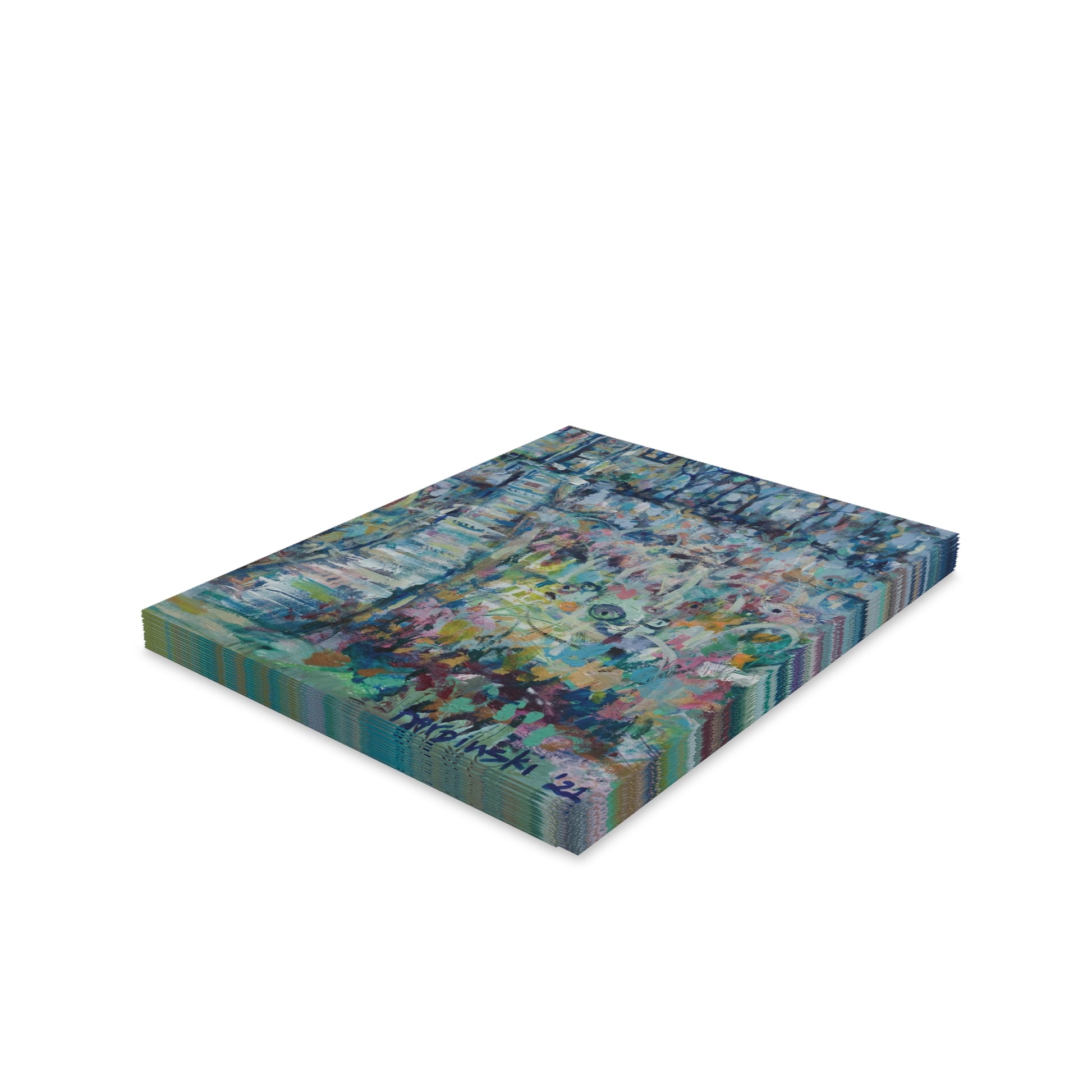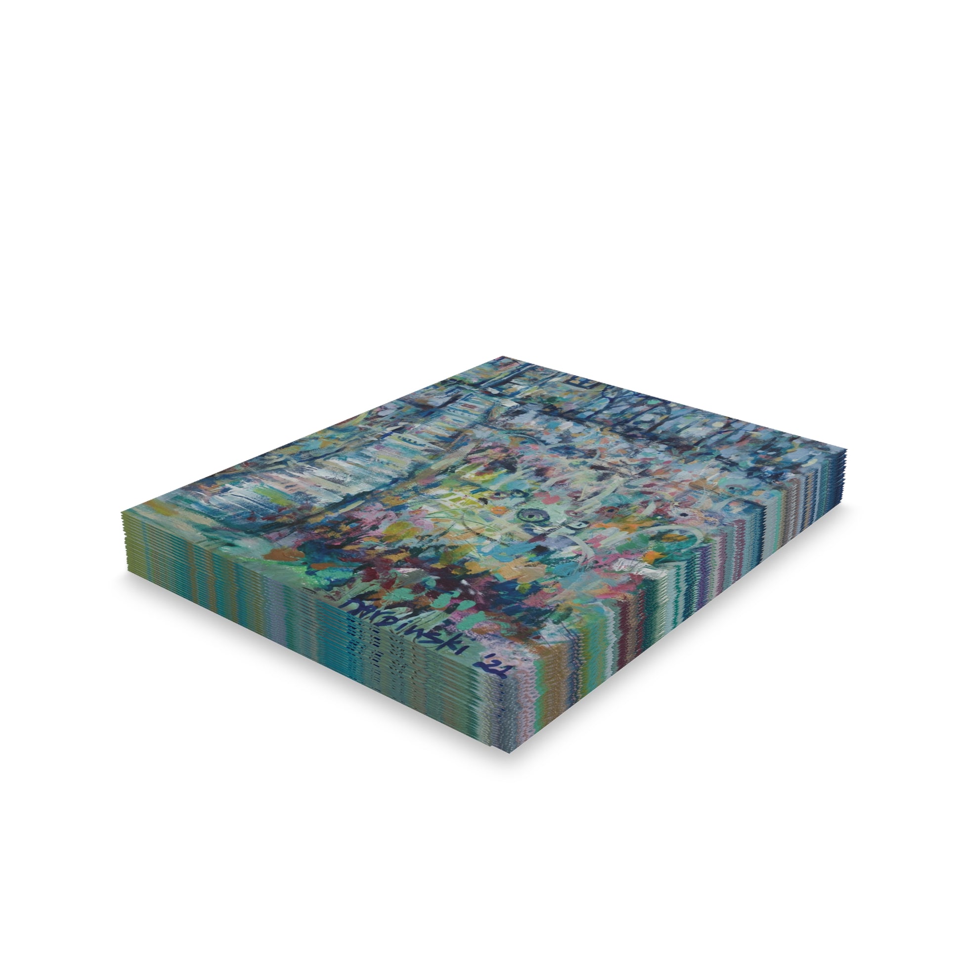 A multi pack of greeting cards with Leslie Karpinski's original painting "Climbing to A Higher Place". We have 8, 16 and 24 packs. The cards measure 4.25" x 5.5". Each greeting card come with a white envelope. The inside of the card is blank.