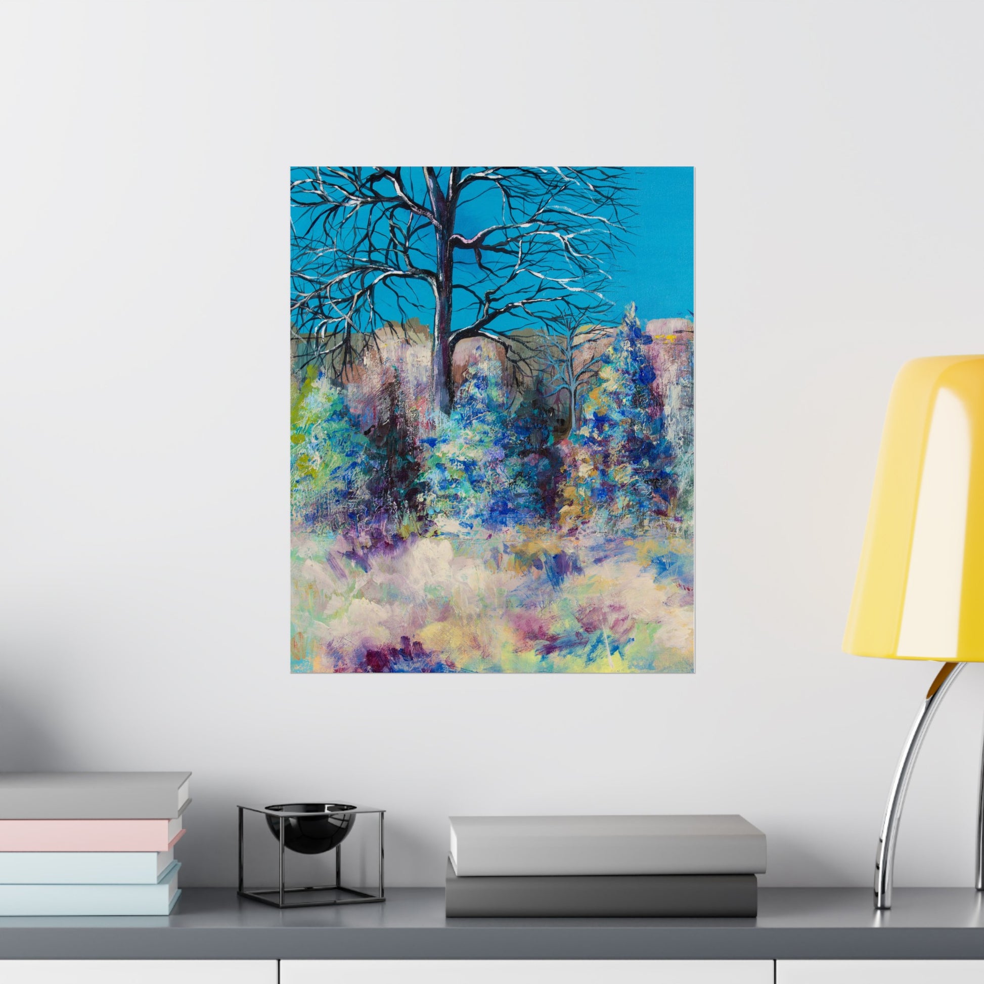 A poster print of an original painting by Leslie Karpinski titled "Reynolda Tree". A colorful landscape painting available in many sizes. It would make a great piece for your living room, dining room, office or wherever you want to hang beautiful art!