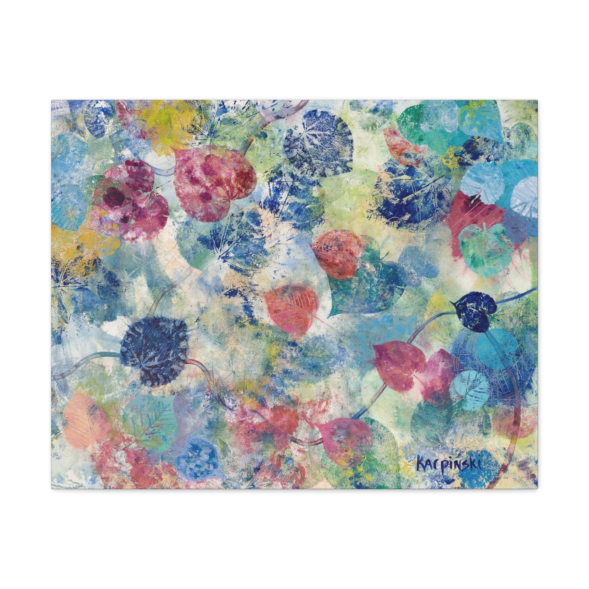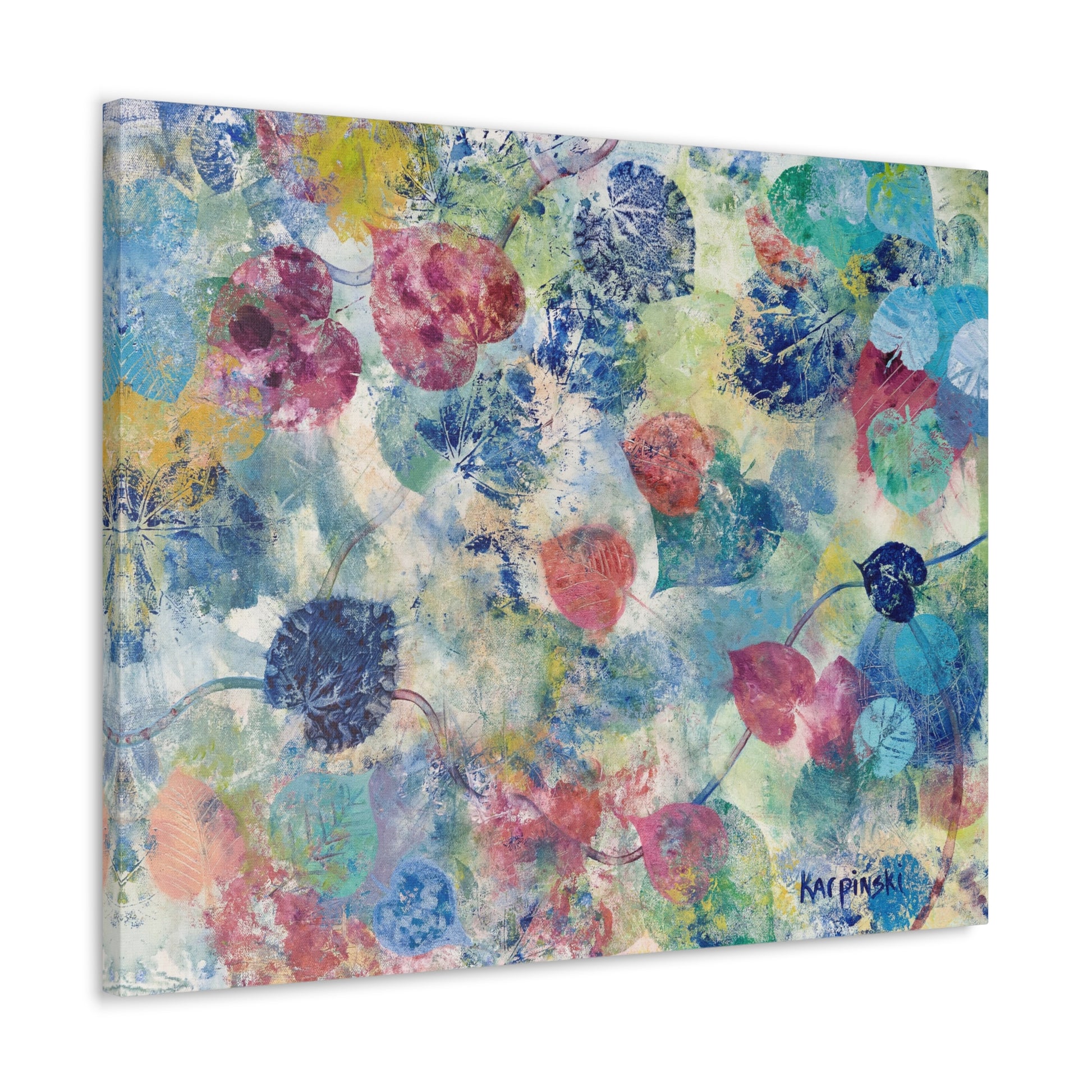 A stunning multi color painting by Leslie Karpinski featuring leaves of many different colors. Explore this magical painting every day with a canvas print ready to hang on the wall!
