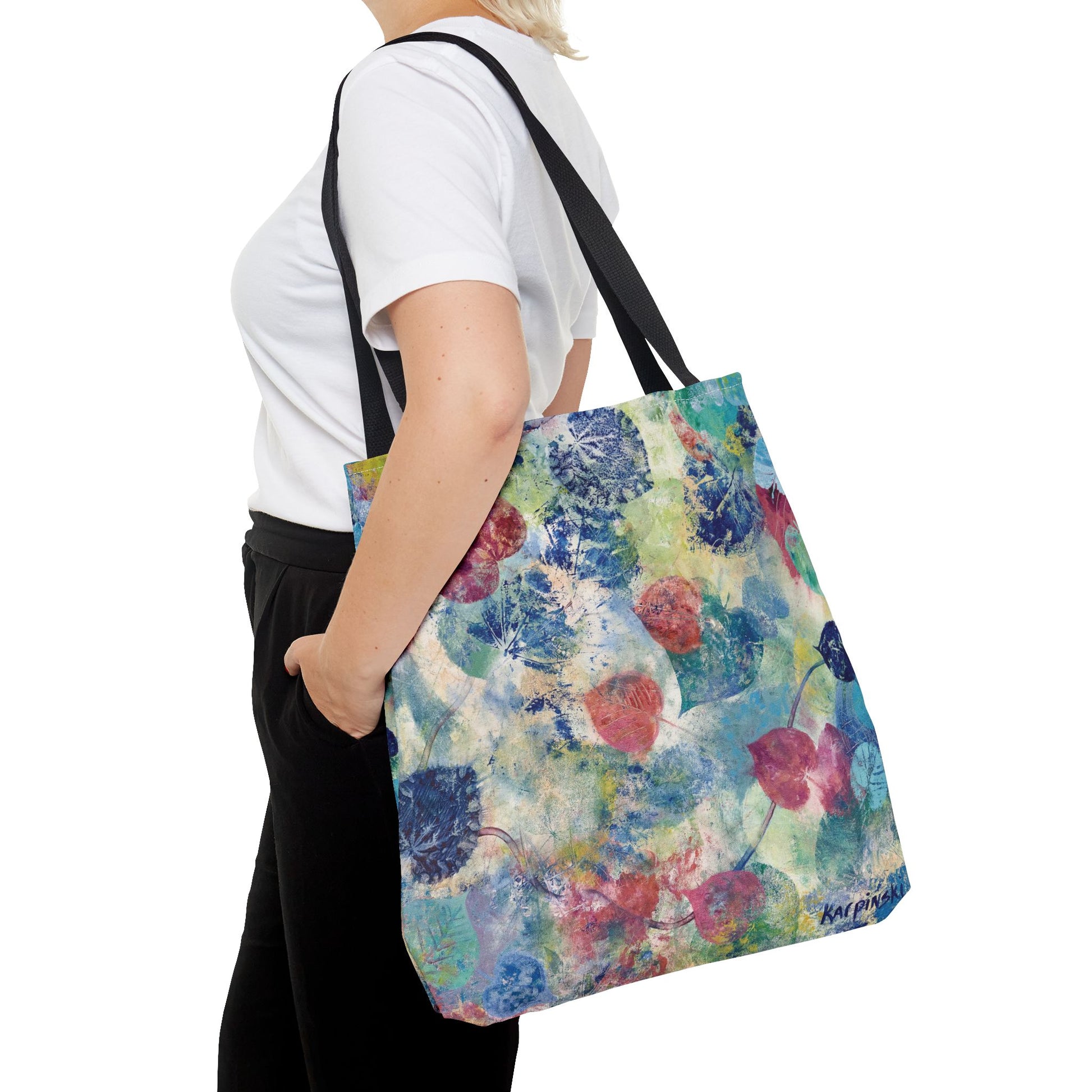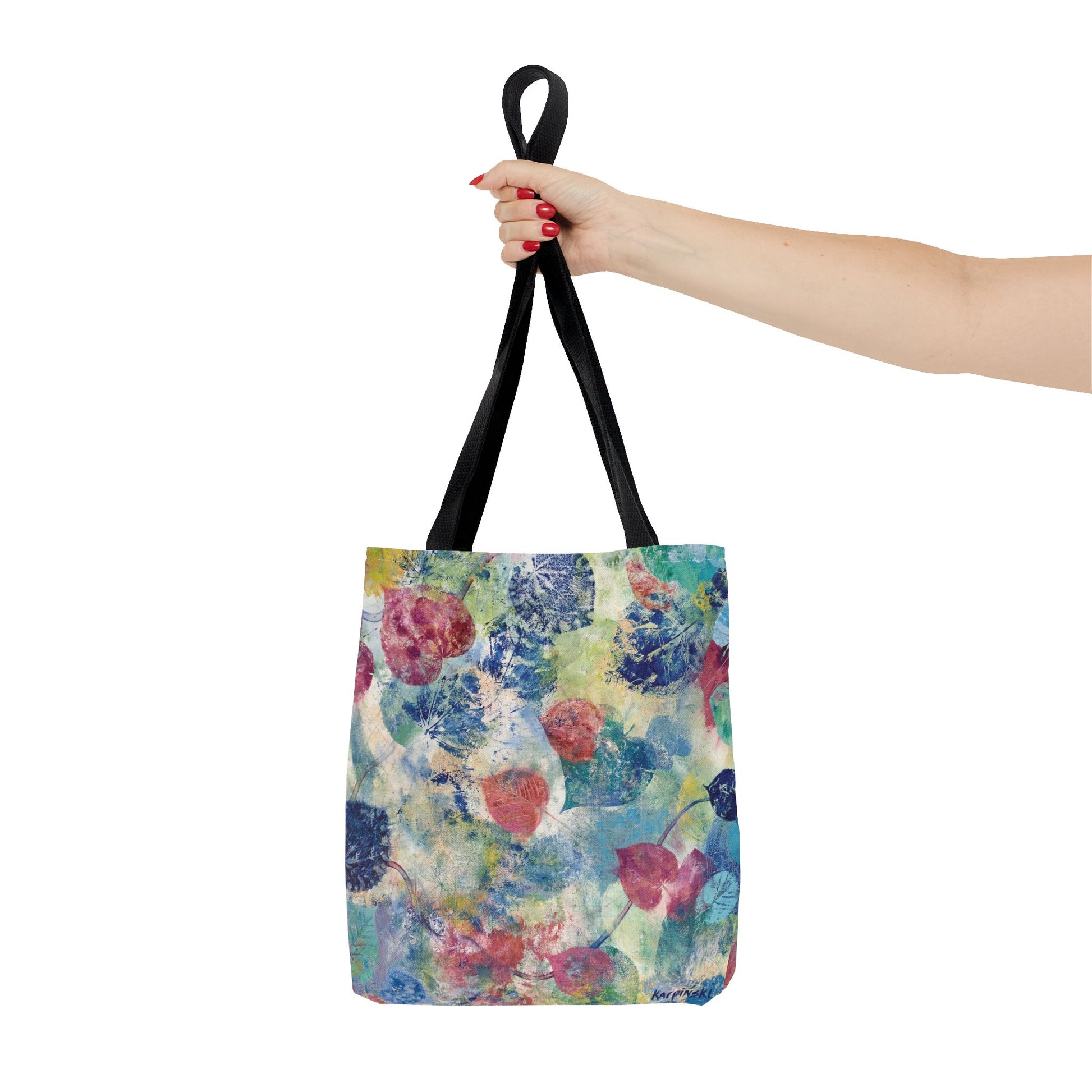 Leslie Karpinski's original artwork "Red Bud" printed on a canvas tote bag. The bag is available in 3 sizes and with 5 different color handles.