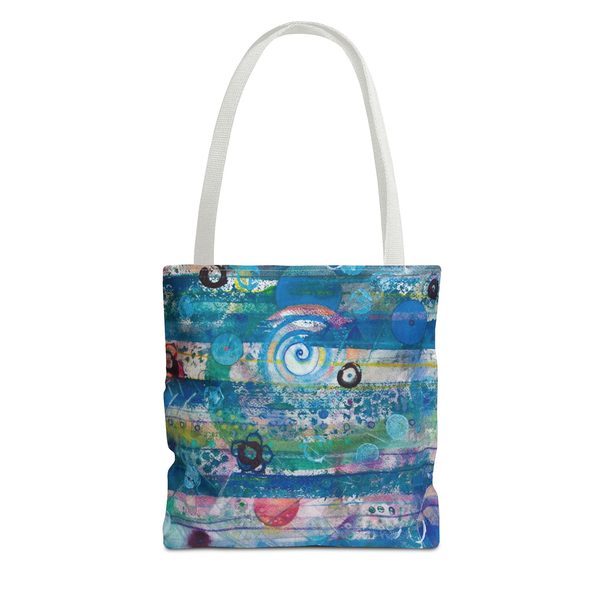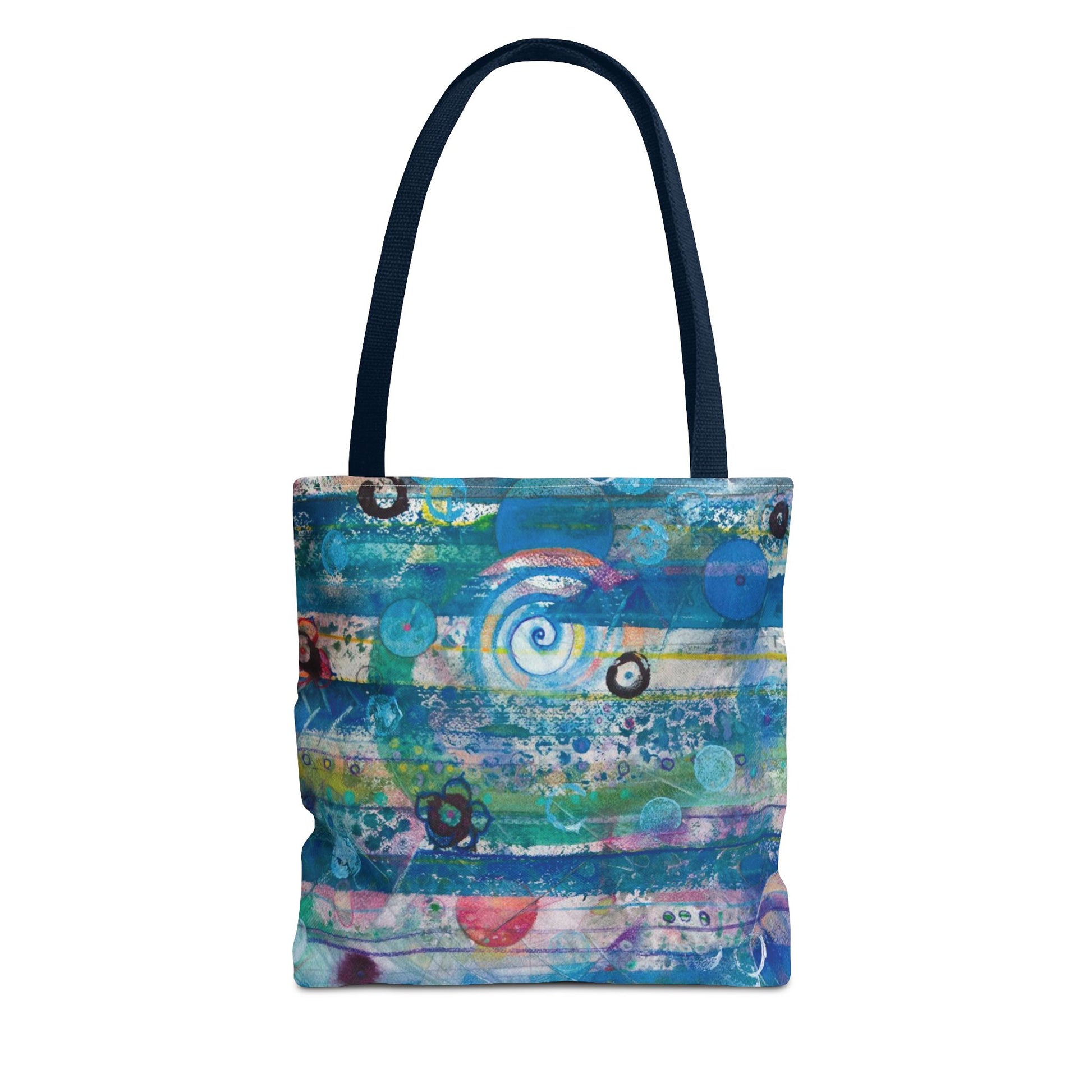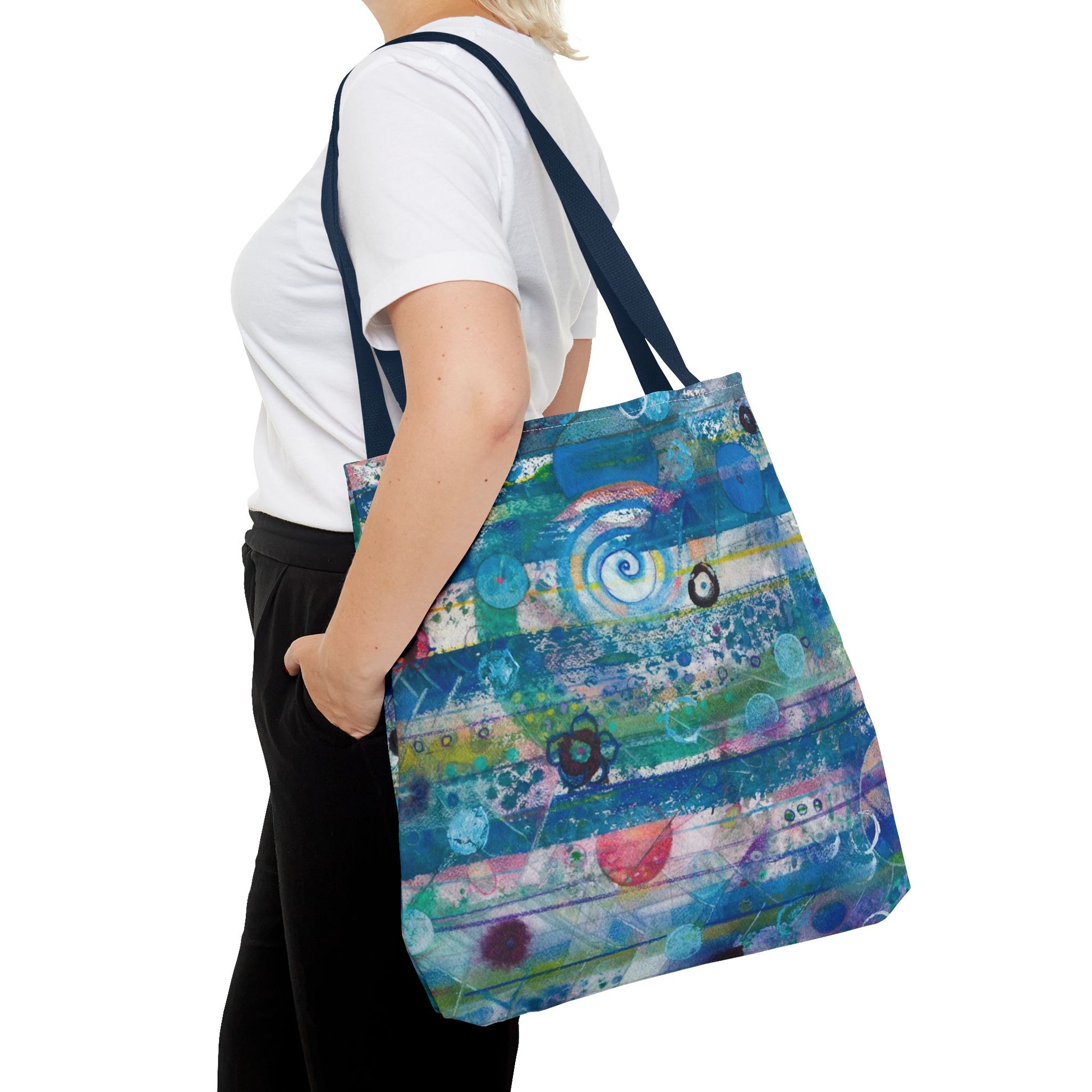 Leslie Karpinski's original artwork "Celestial Sky" printed on a canvas tote bag. The bag is available in 3 sizes and with different color handles.