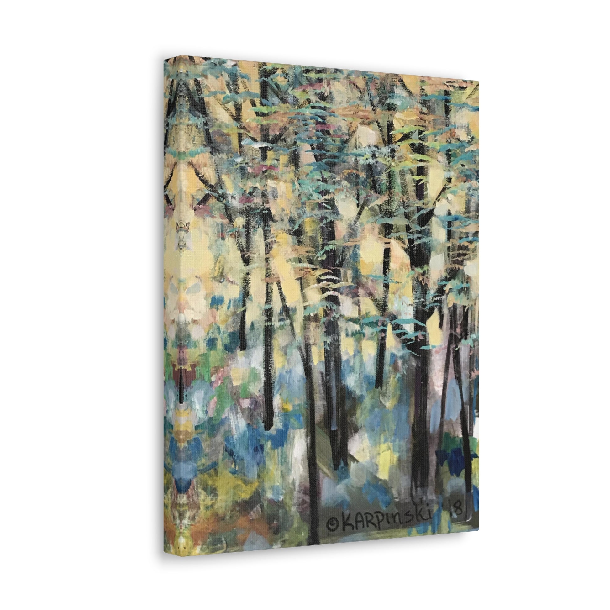 A gallery wrap canvas print of an original painting by Leslie Karpinski titled "Golden Trees". This contemporary wooden scene with yellow and blue hues. A beautiful piece of art that will fit into any space that needs a pop of color.