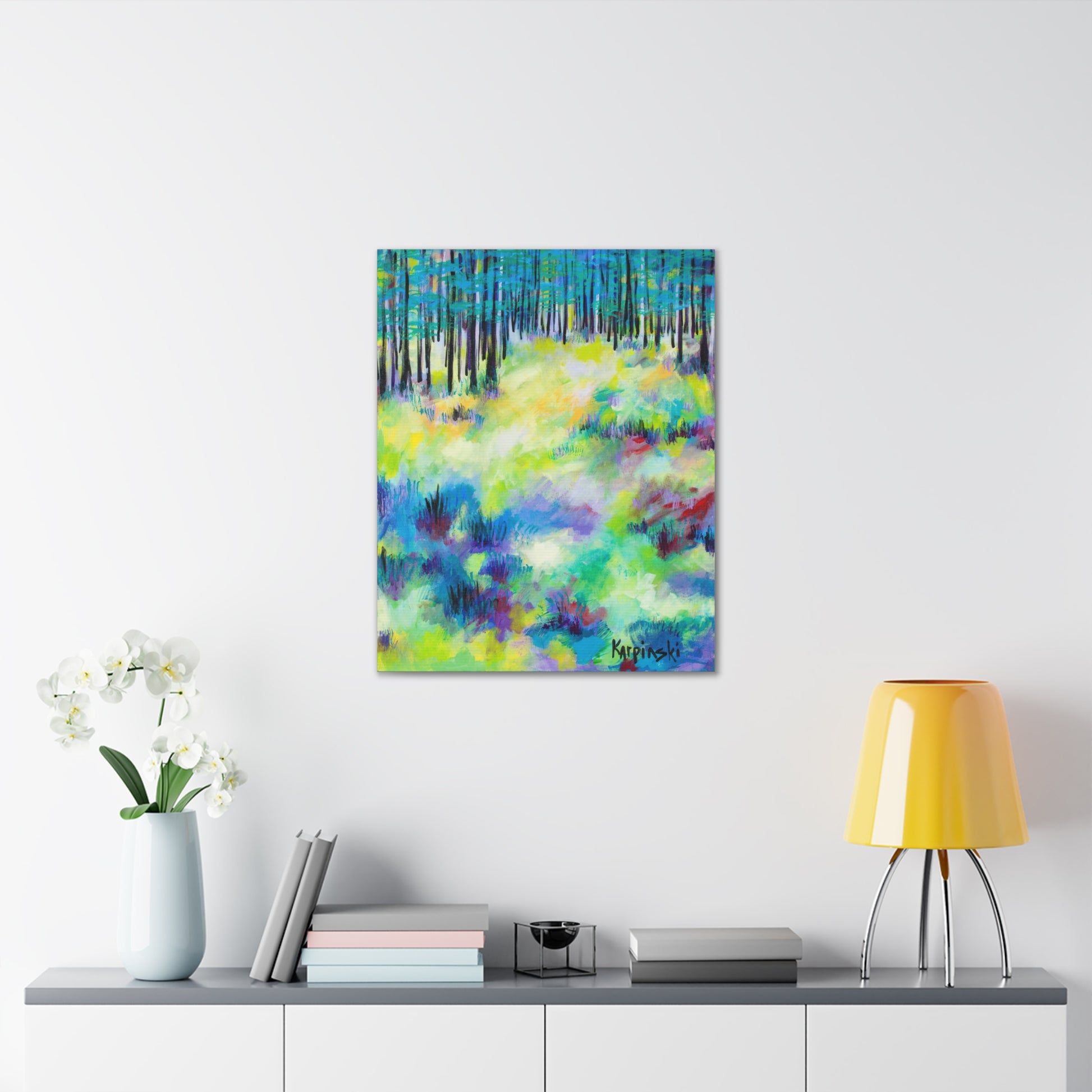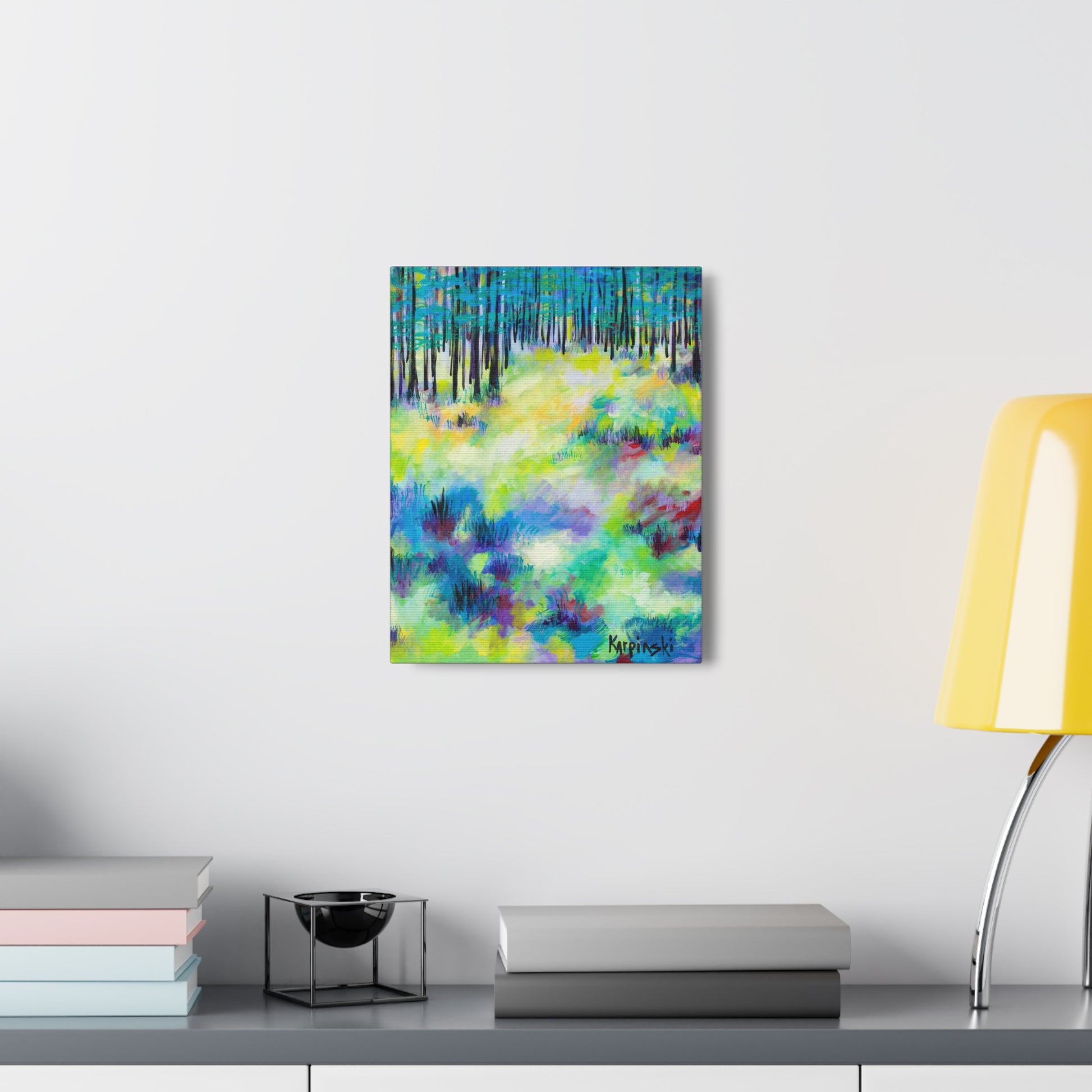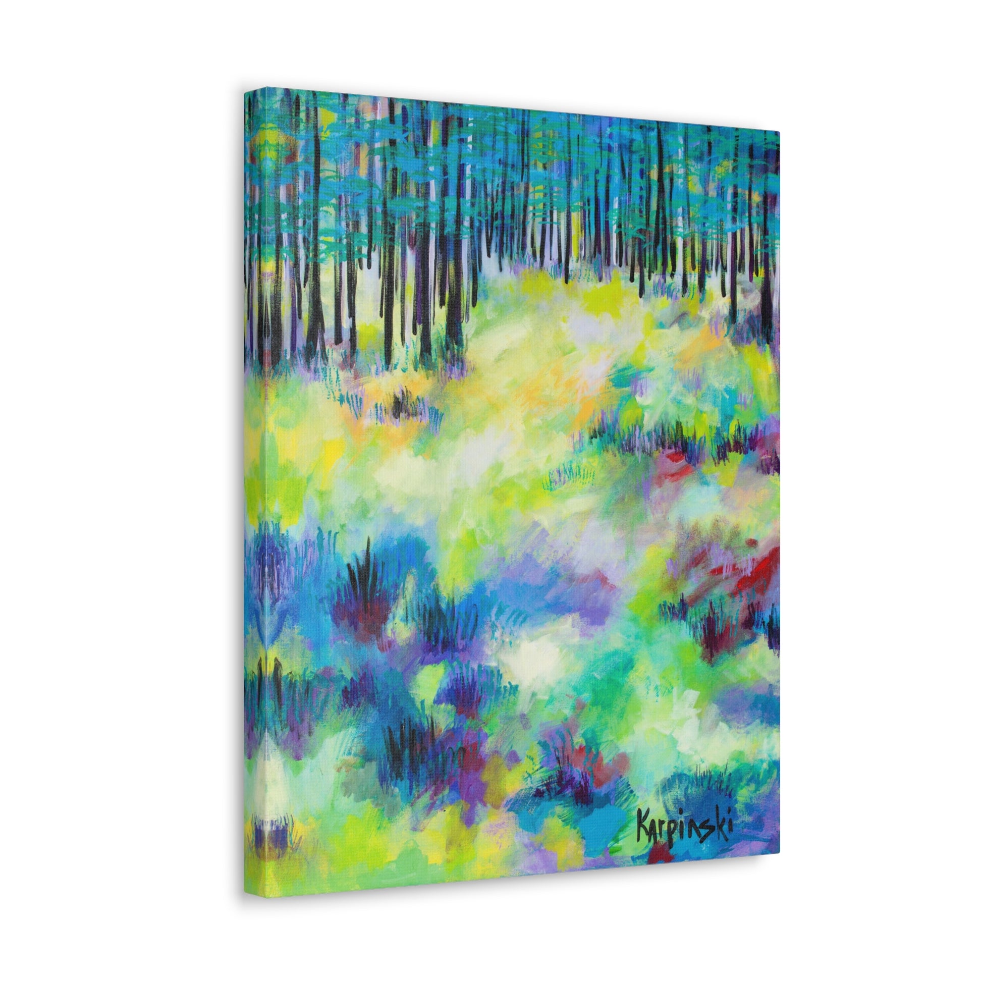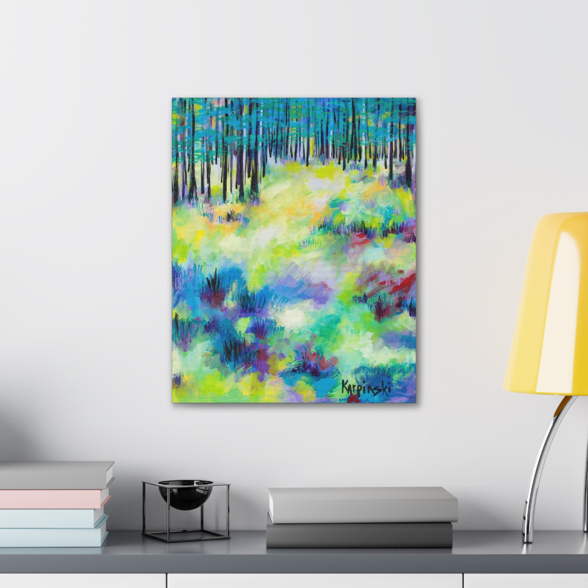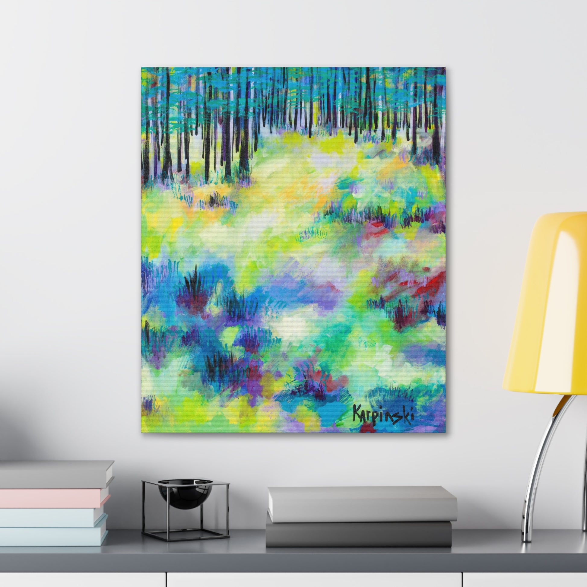 A gallery wrap canvas print of an original painting by Leslie Karpinski titled "Field of Trees 2". A colorful contemporary painting featuring the deep woods in the background with a field of grasses and flowers. Beautiful blues and yellows make this a bright and cheerful landscape.