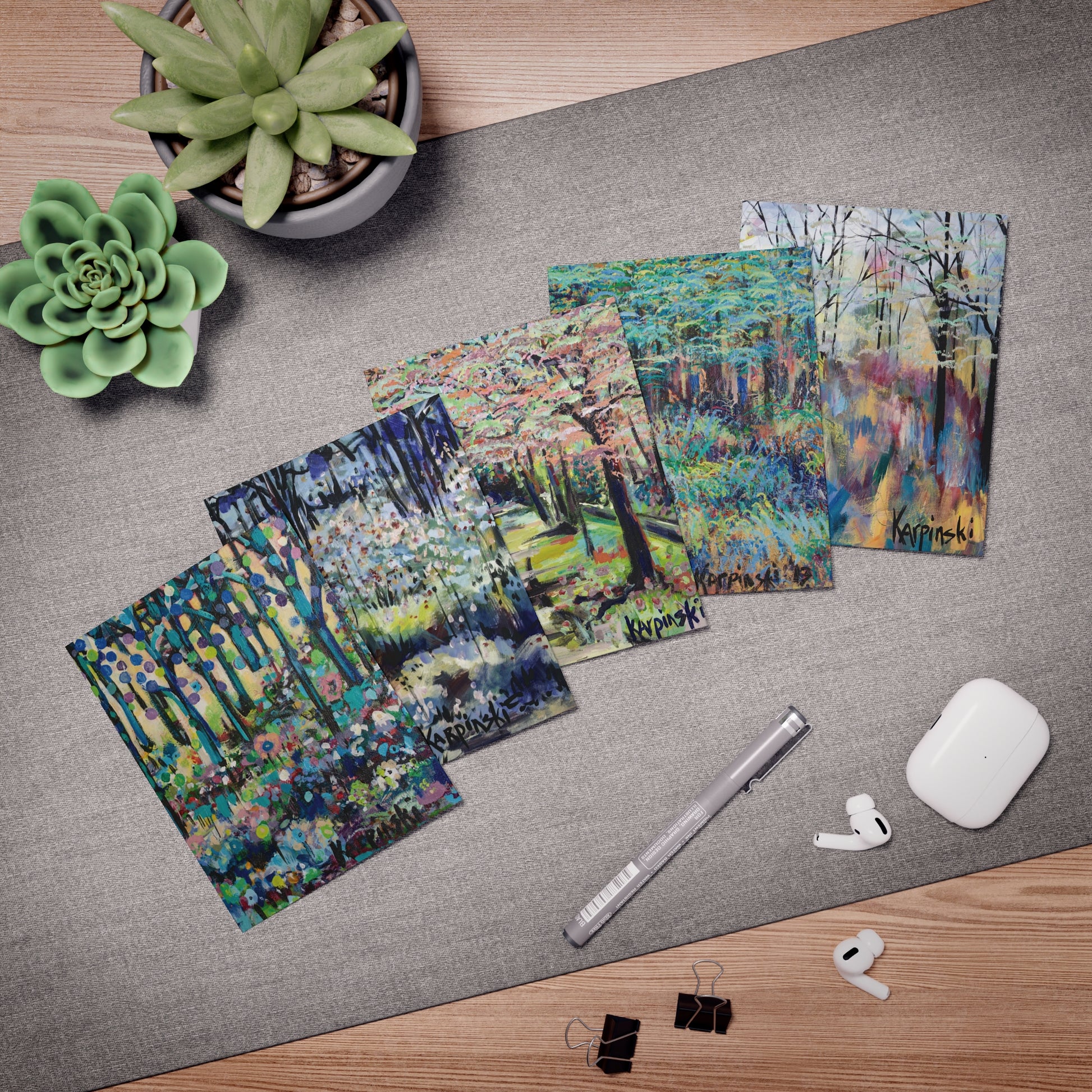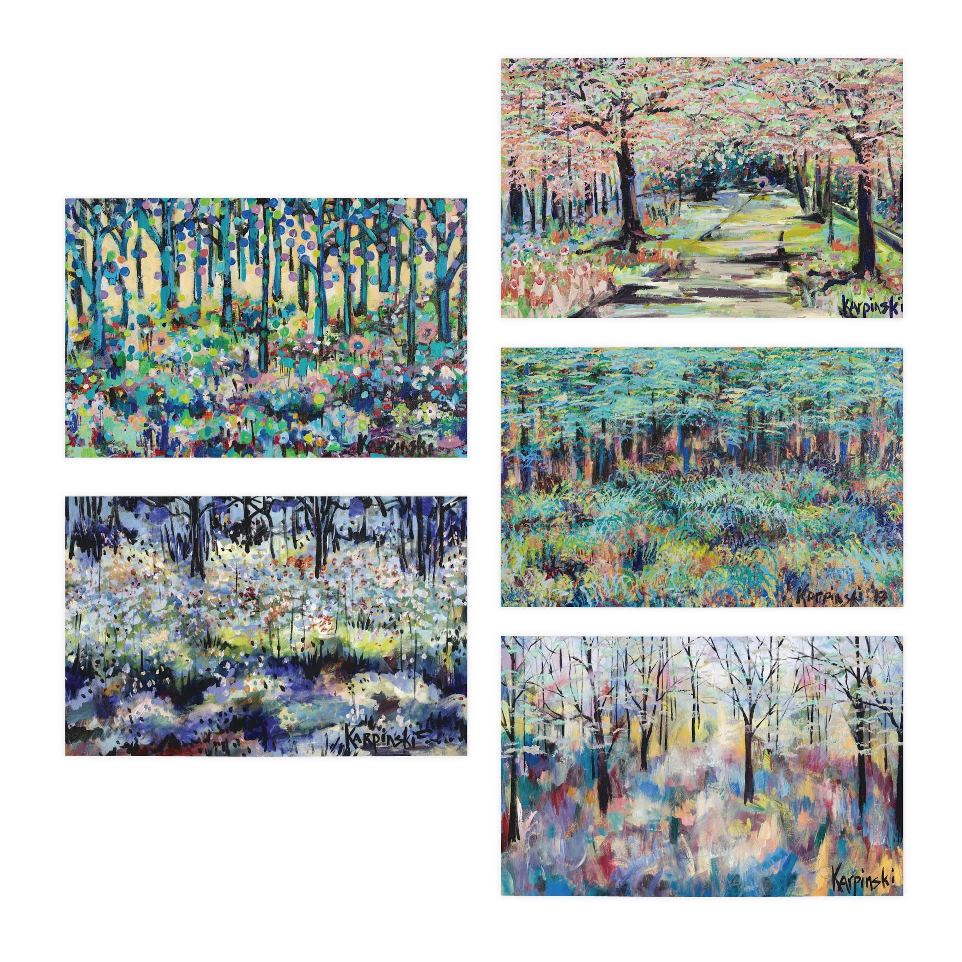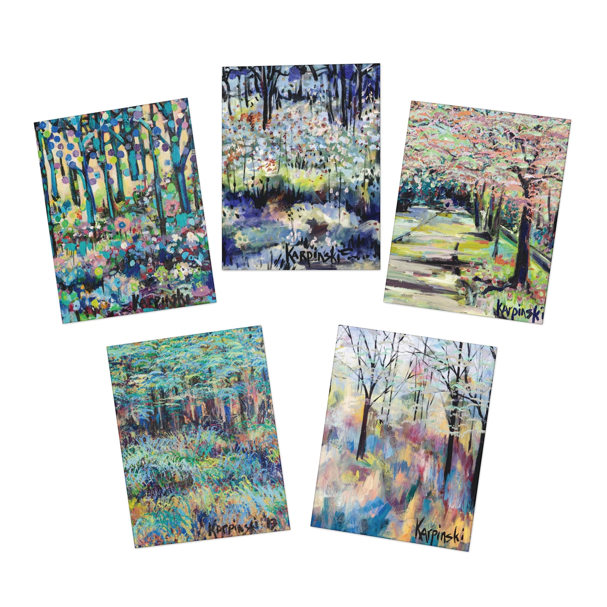 A multi pack of greeting cards with 5 different paintings by Leslie Karpinski. The cards measure 4.25" x 5.5". Each greeting card come with a white envelope and is blank inside.