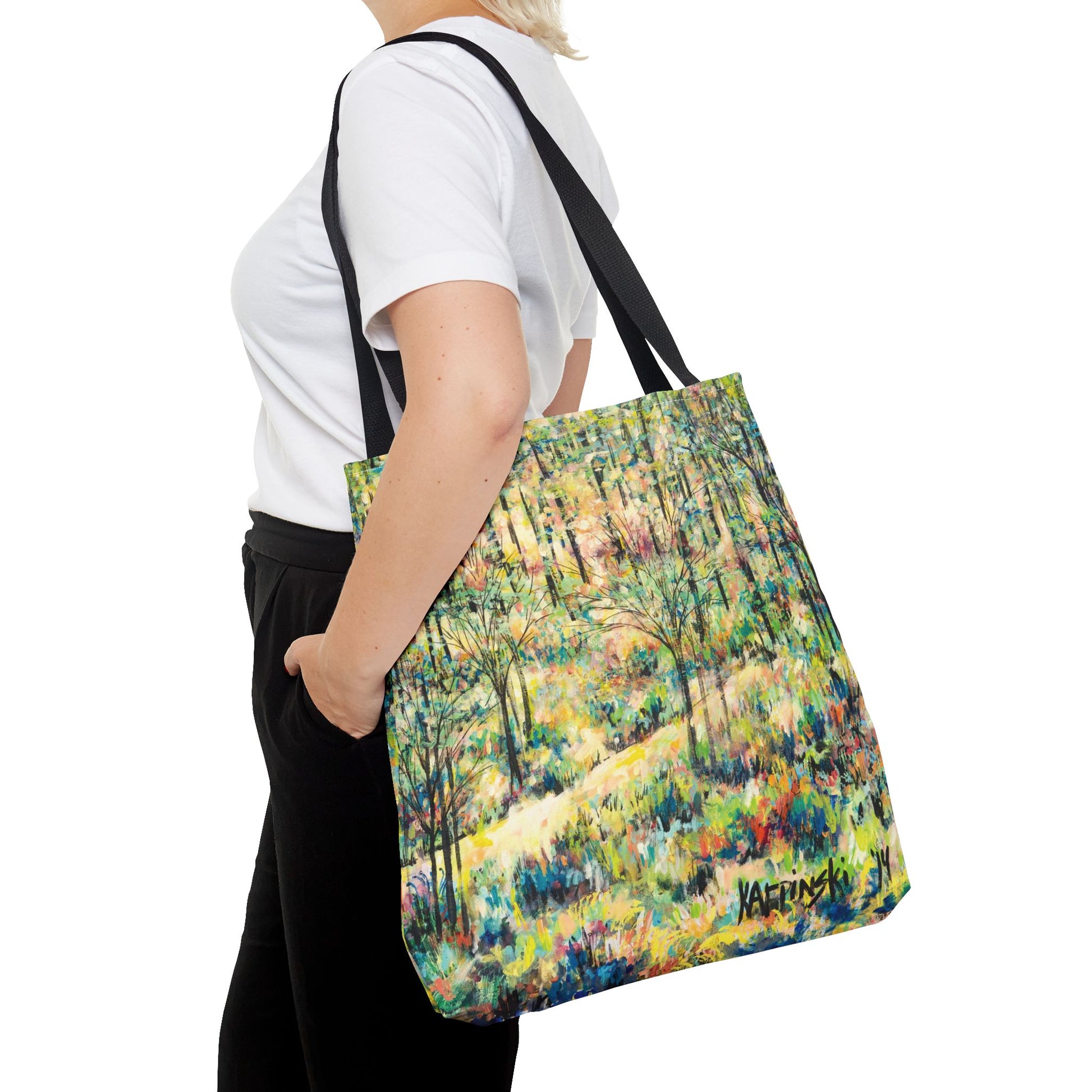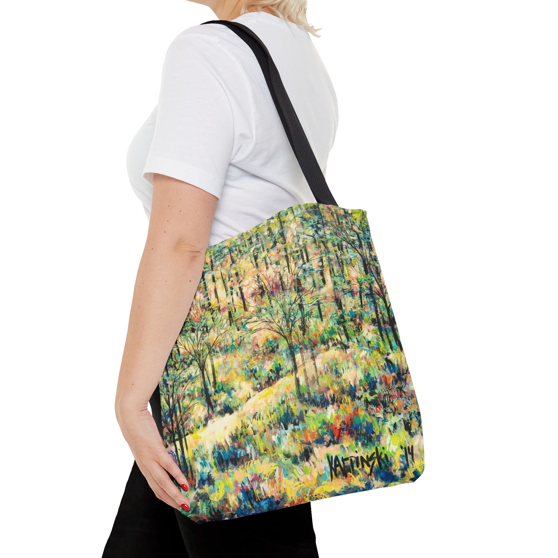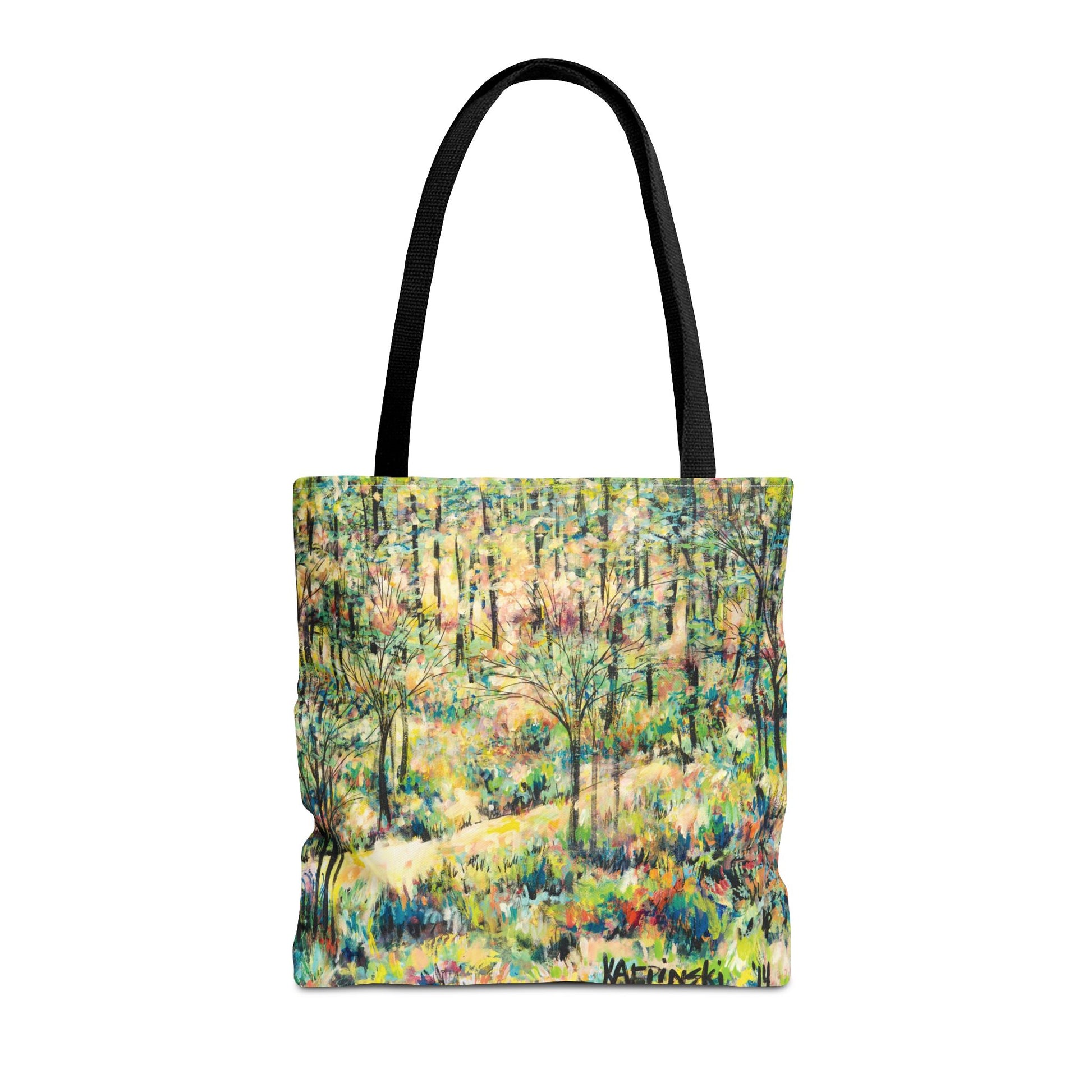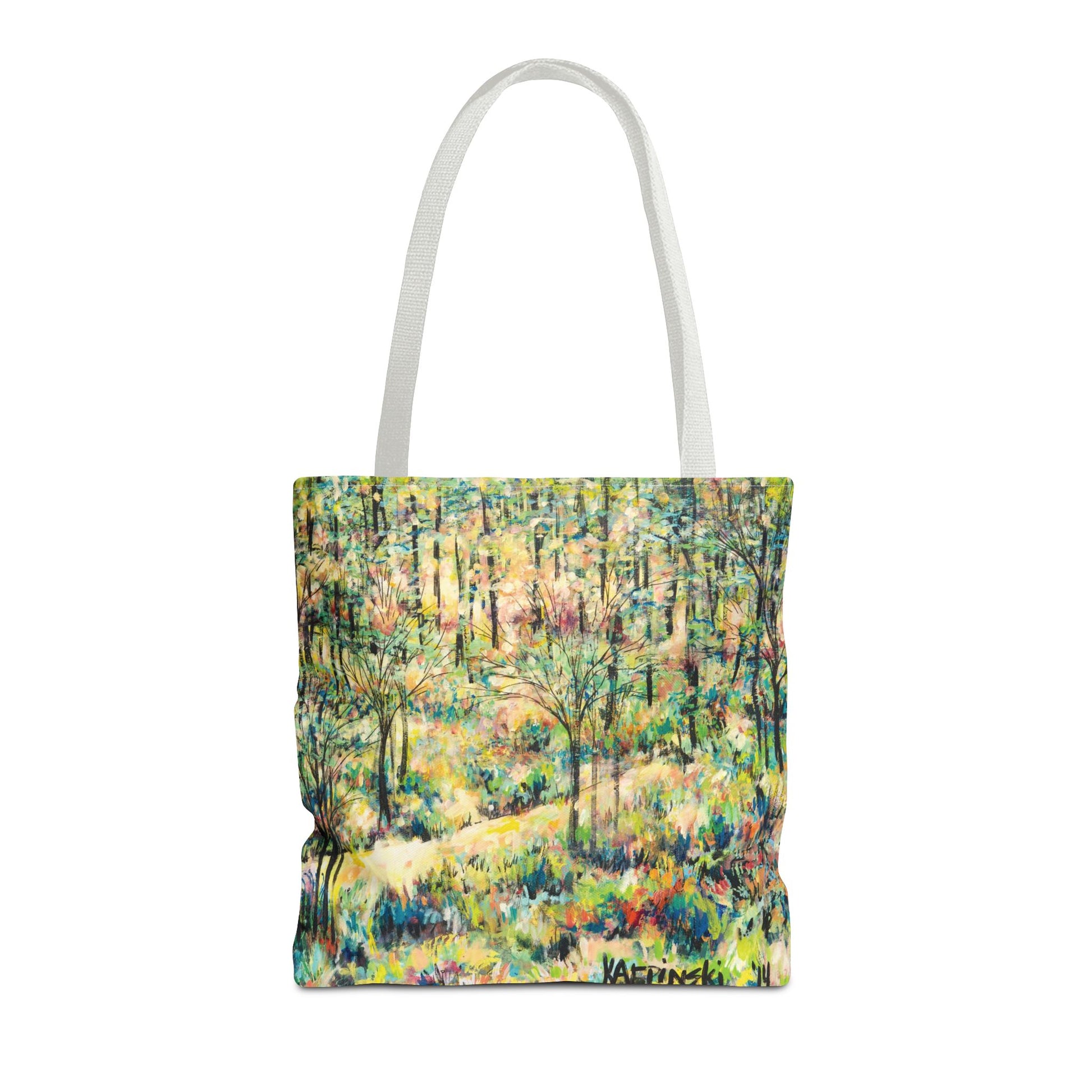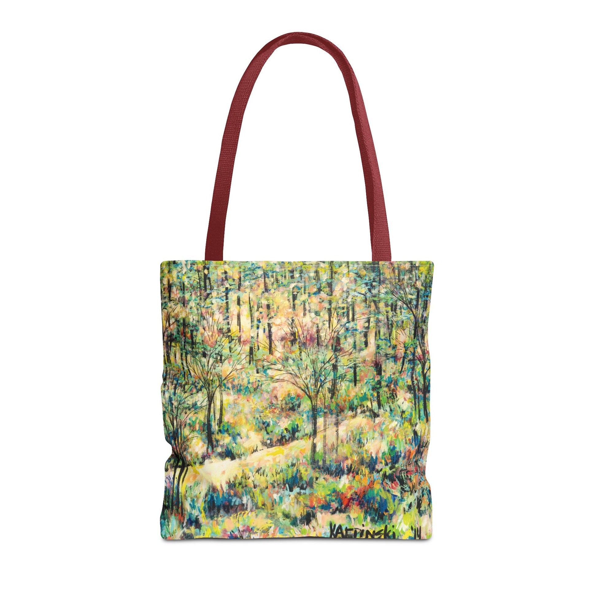 Leslie Karpinski's original artwork "Reynolda Gardens 1" printed on a canvas tote bag. The bag is available in 3 sizes and with different color handles.