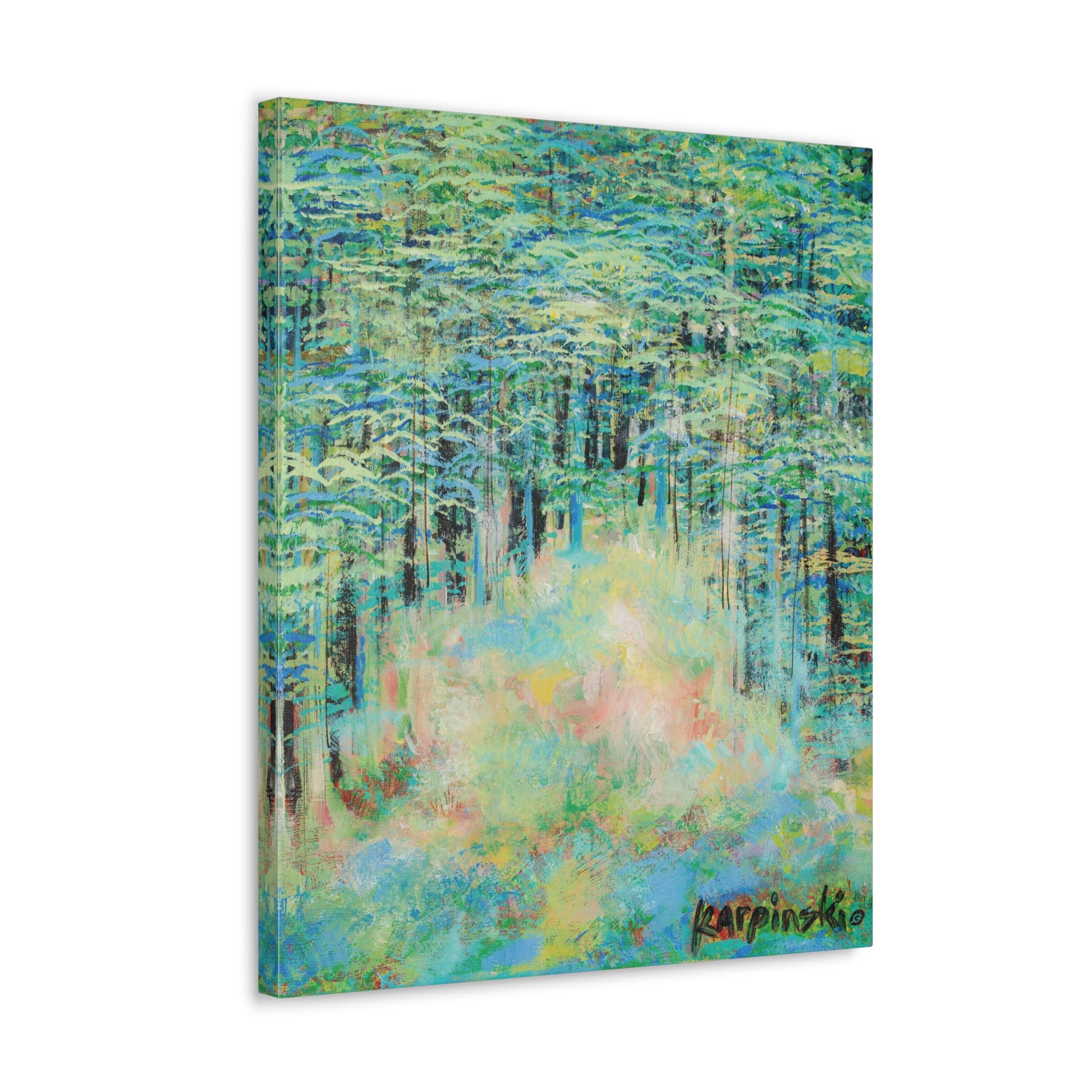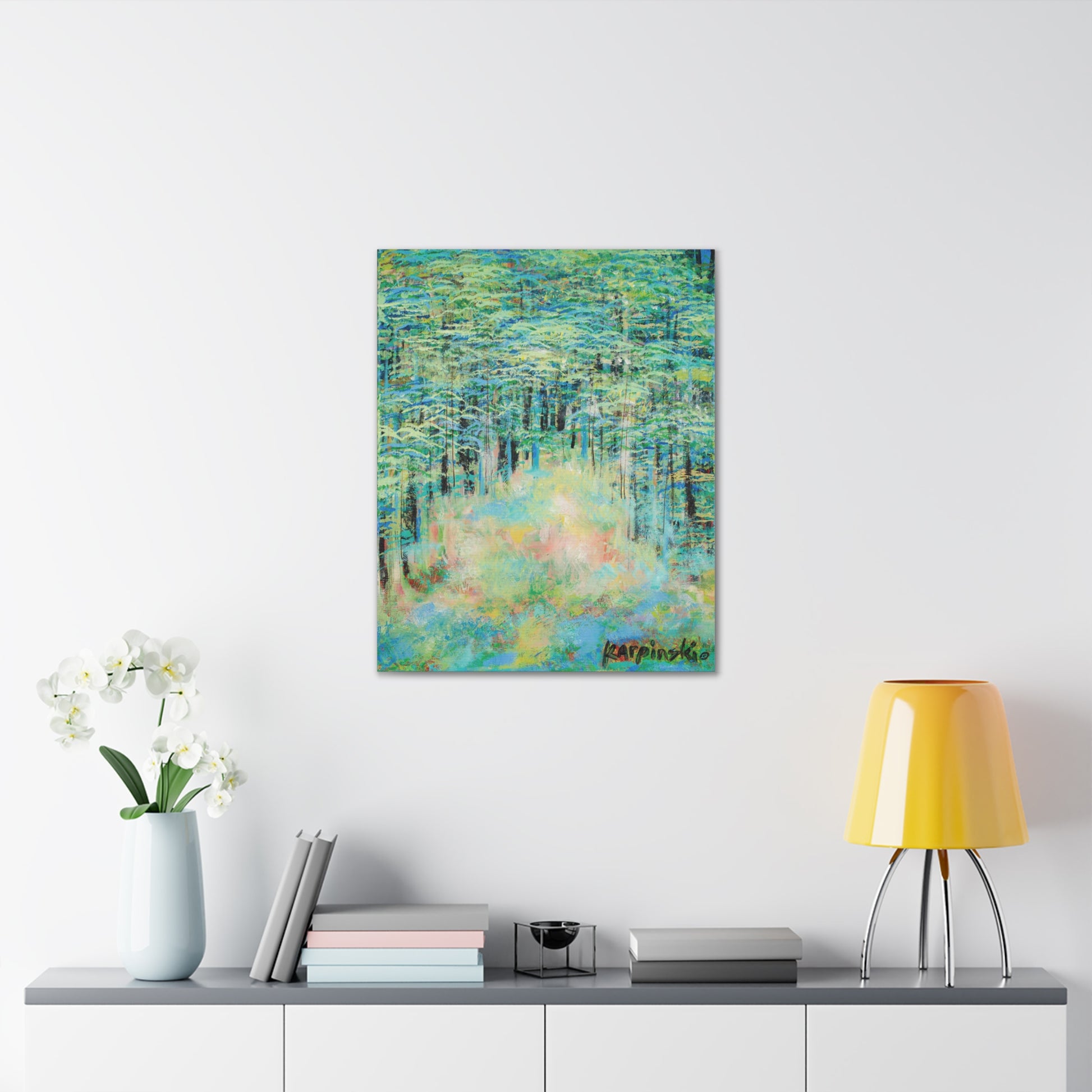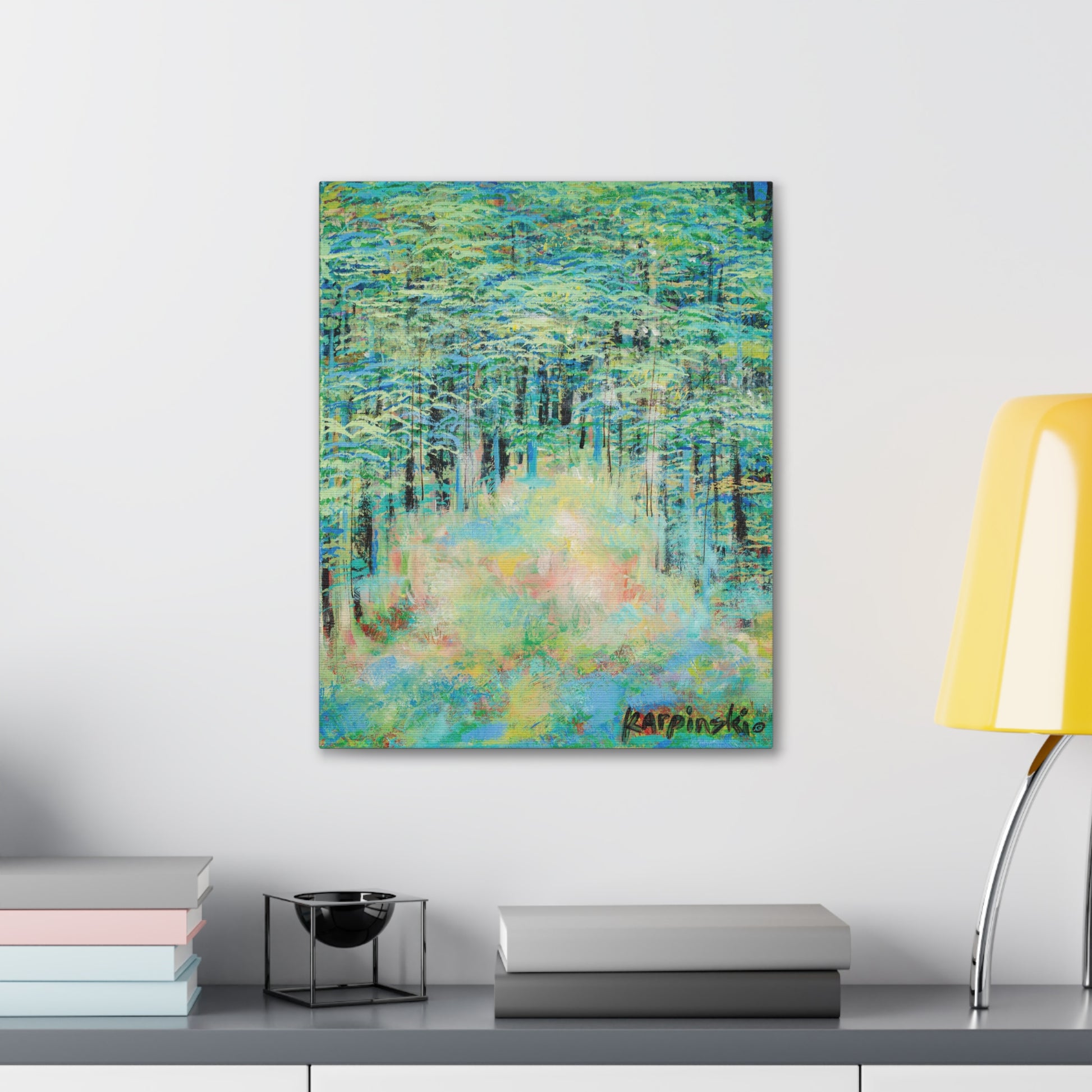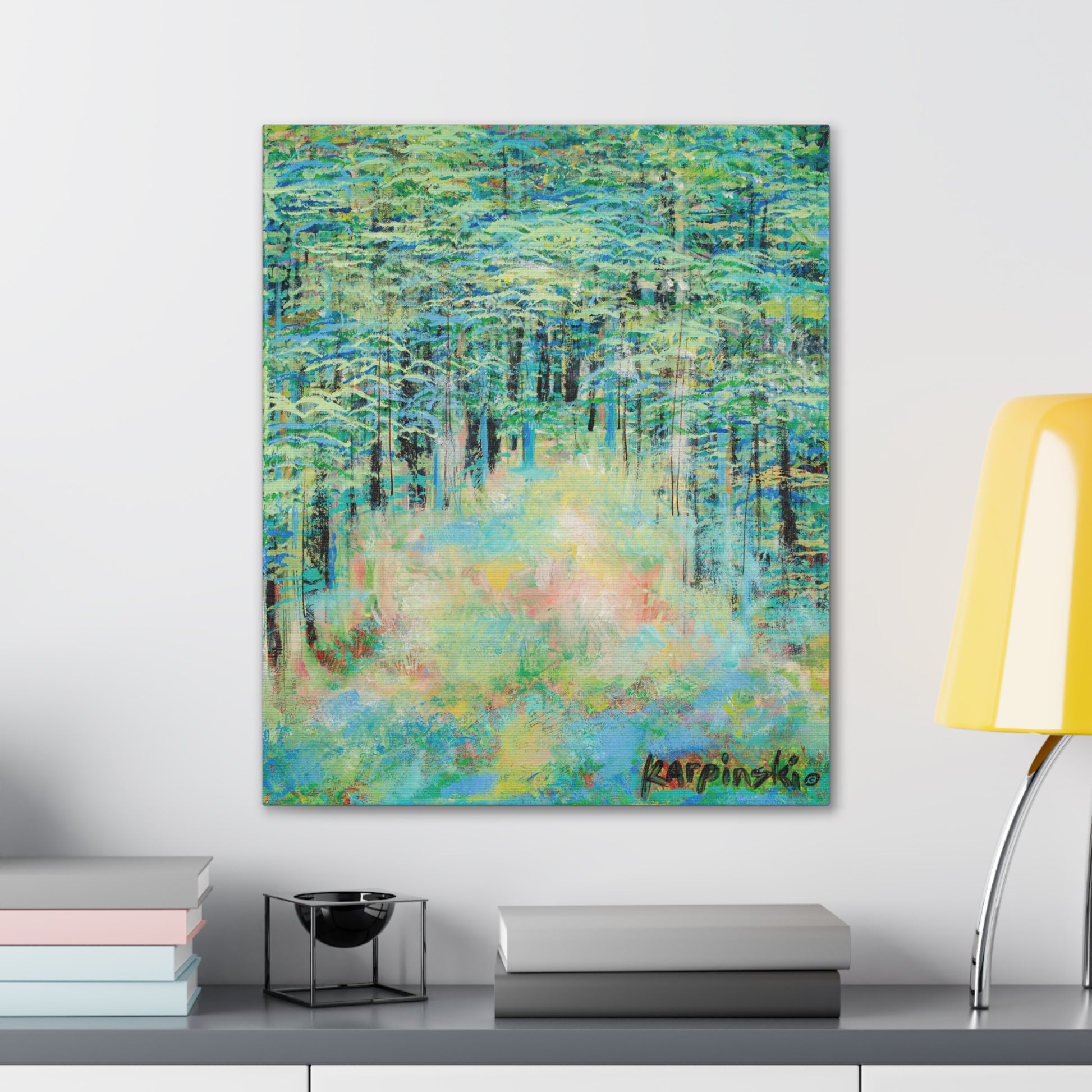 A gallery wrap canvas print of an original painting by Leslie Karpinski titled "Springtime Forest". A cool and refreshing landscape art print available in many sizes. It would make a great piece for your living room, dining room, office or wherever you want to hang a beautiful canvas.