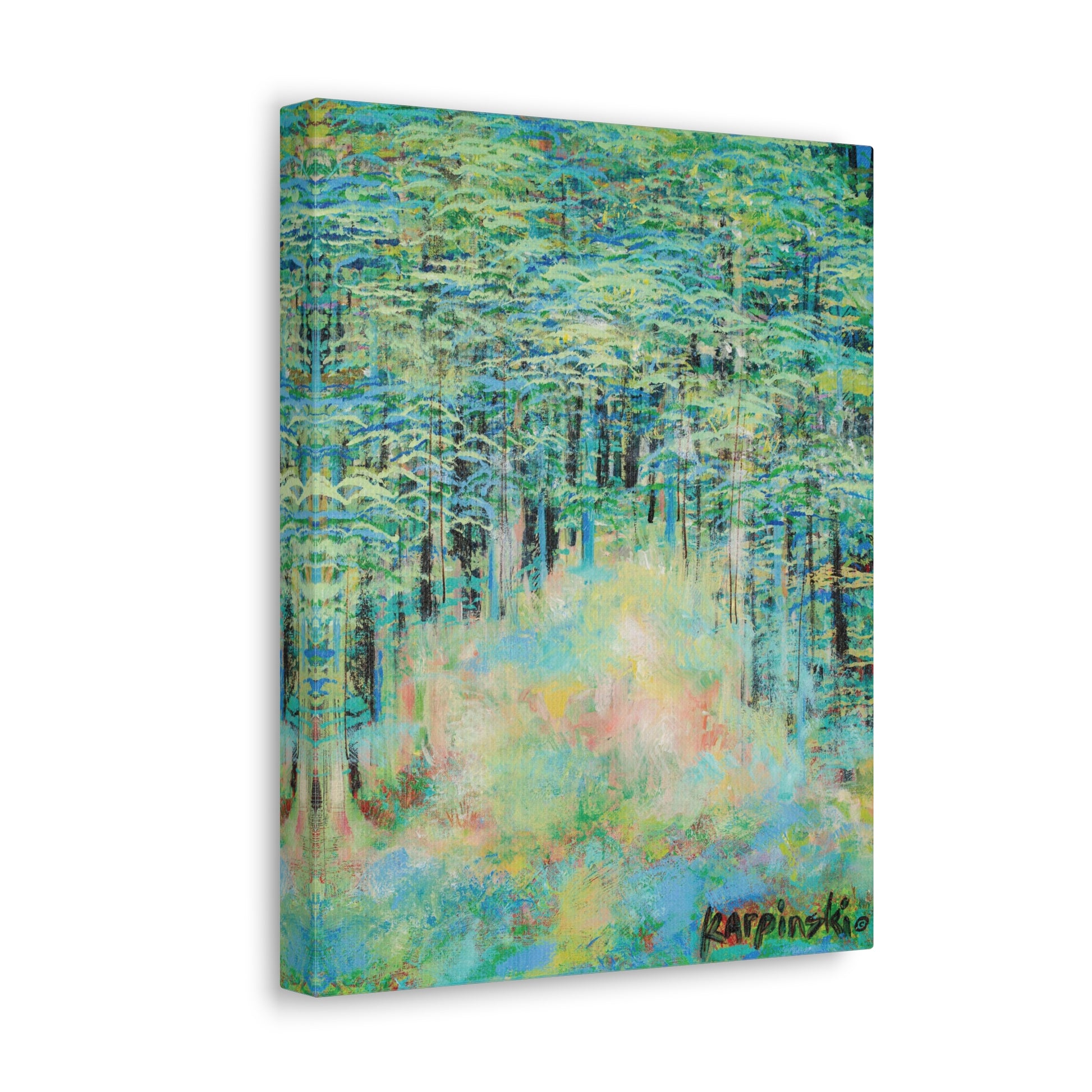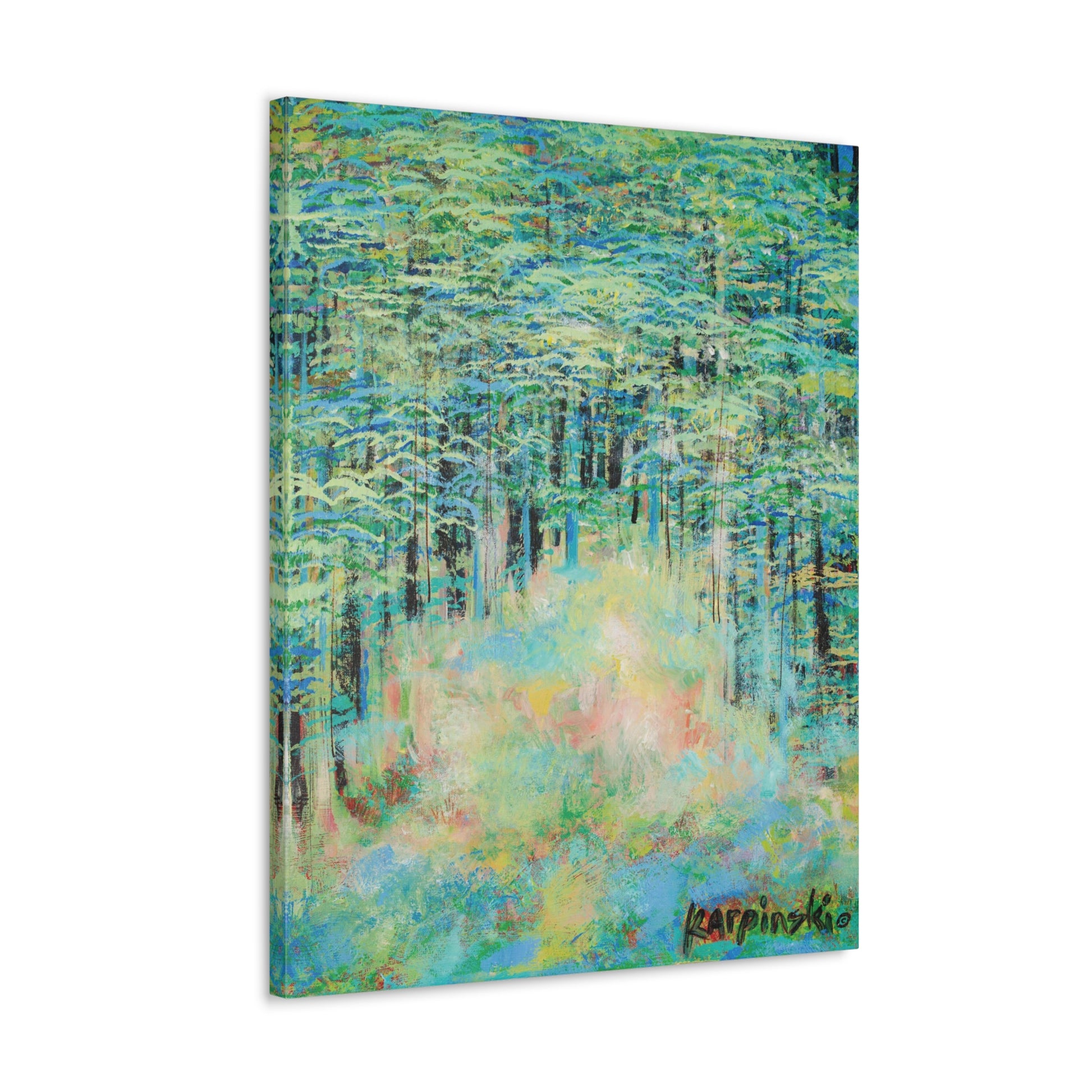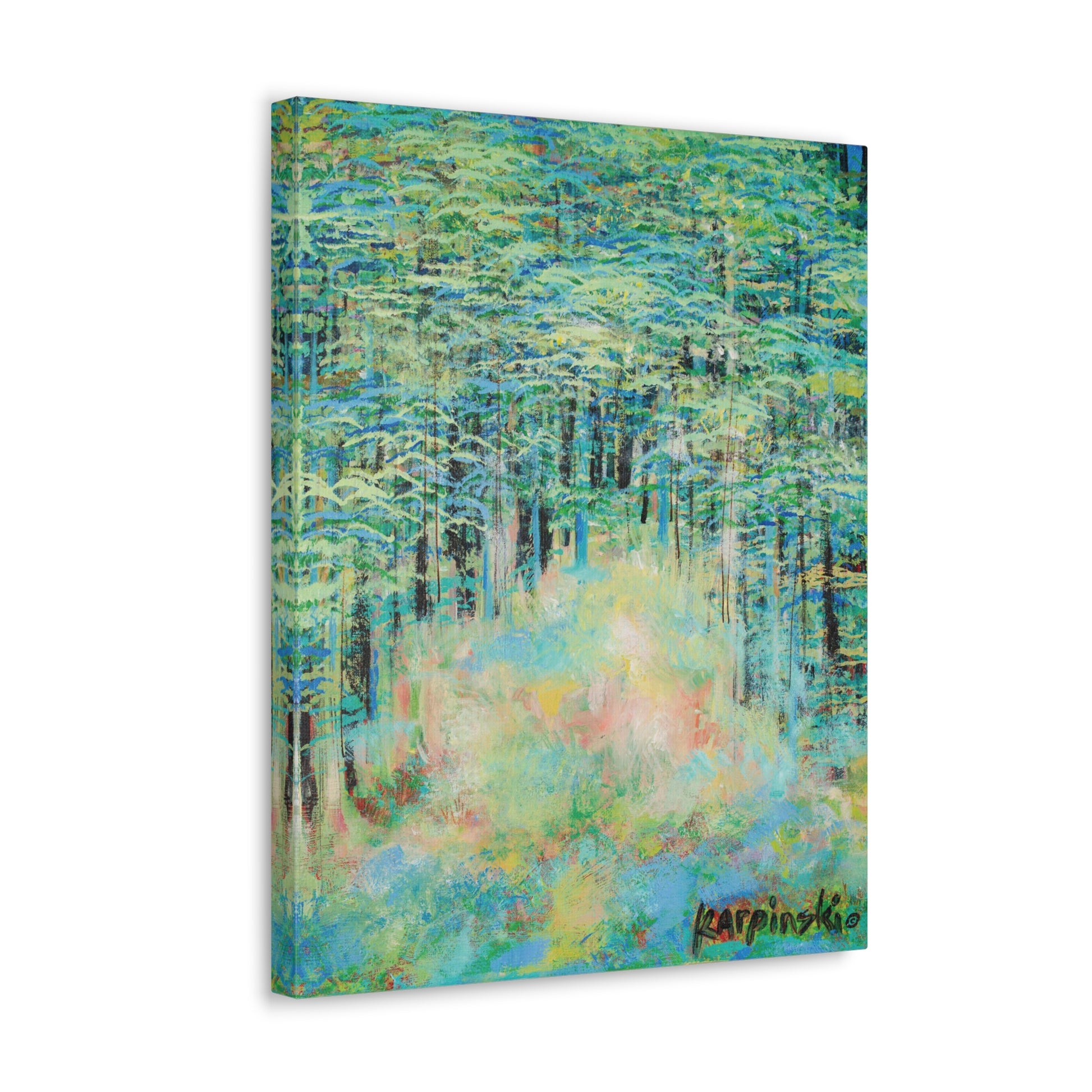 A gallery wrap canvas print of an original painting by Leslie Karpinski titled "Springtime Forest". A cool and refreshing landscape art print available in many sizes. It would make a great piece for your living room, dining room, office or wherever you want to hang a beautiful canvas.
