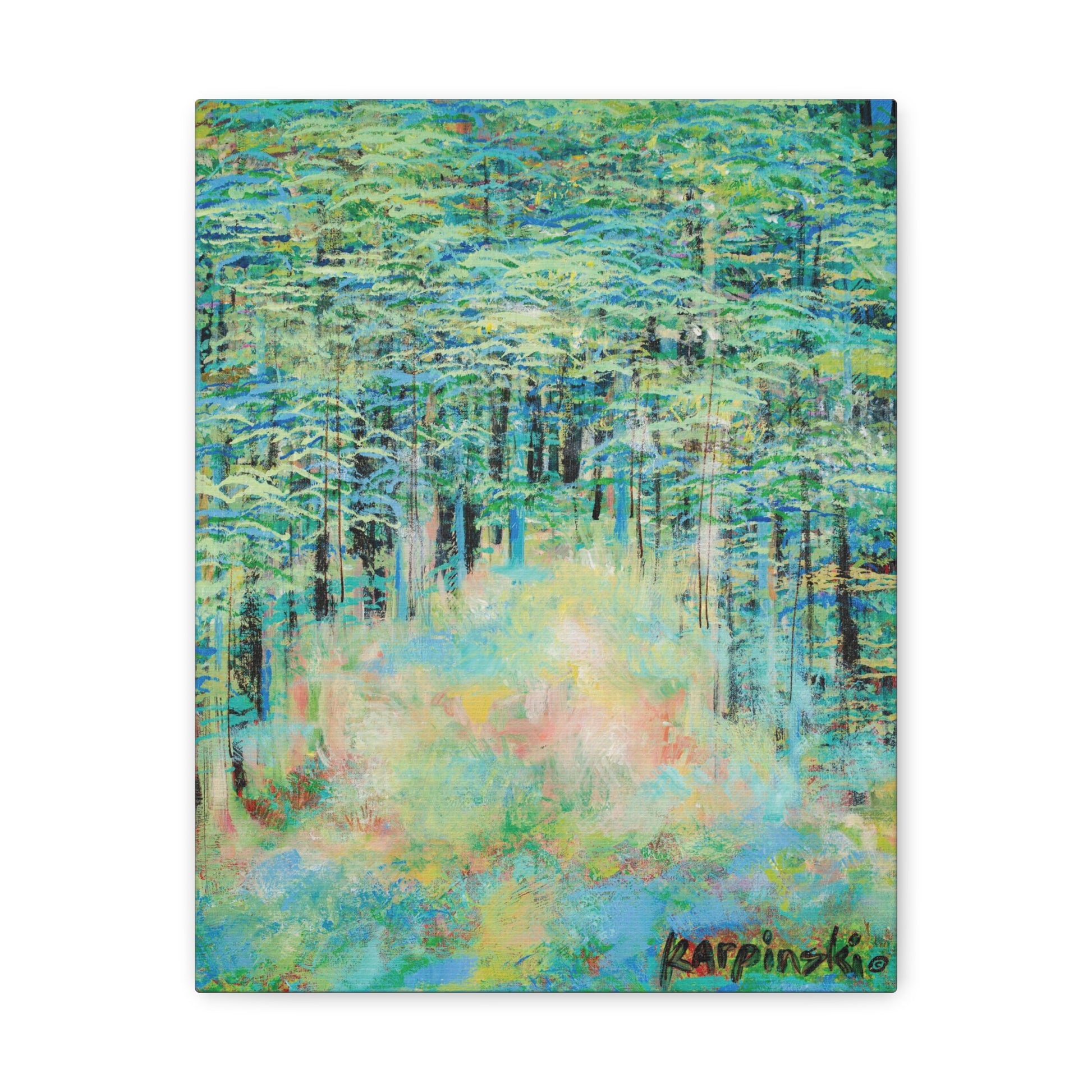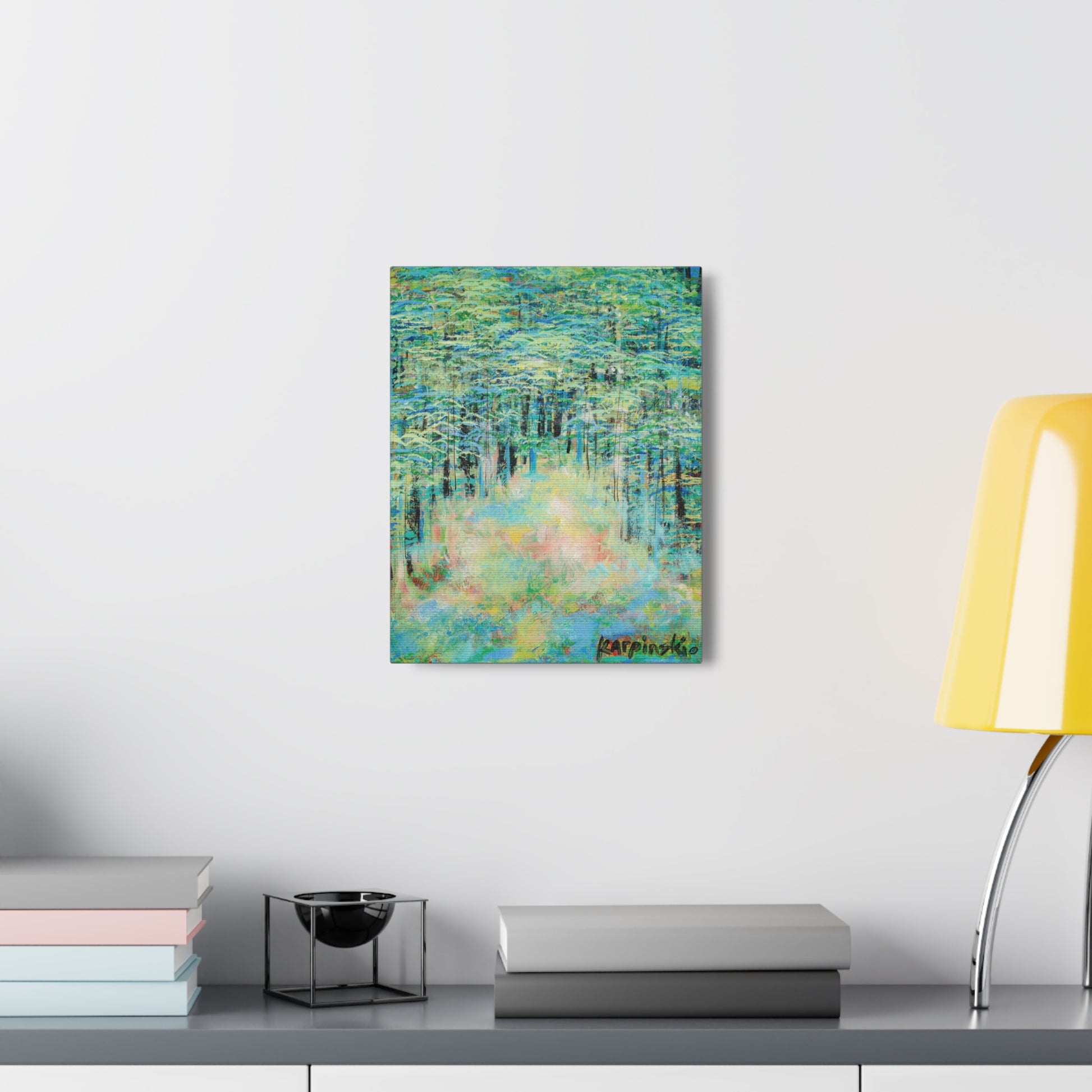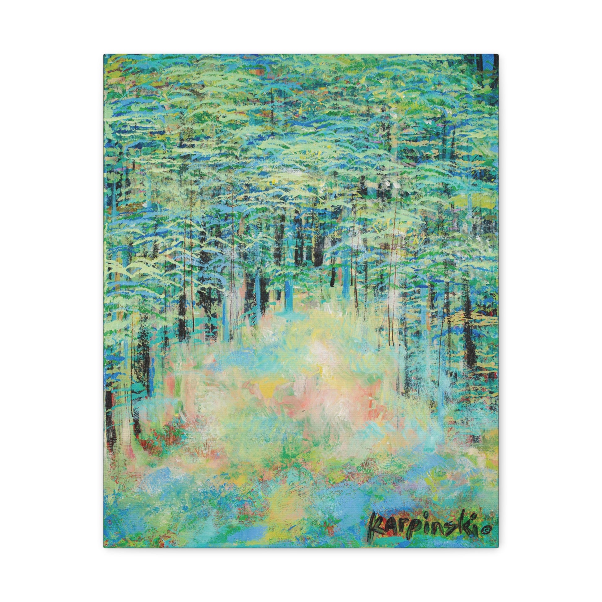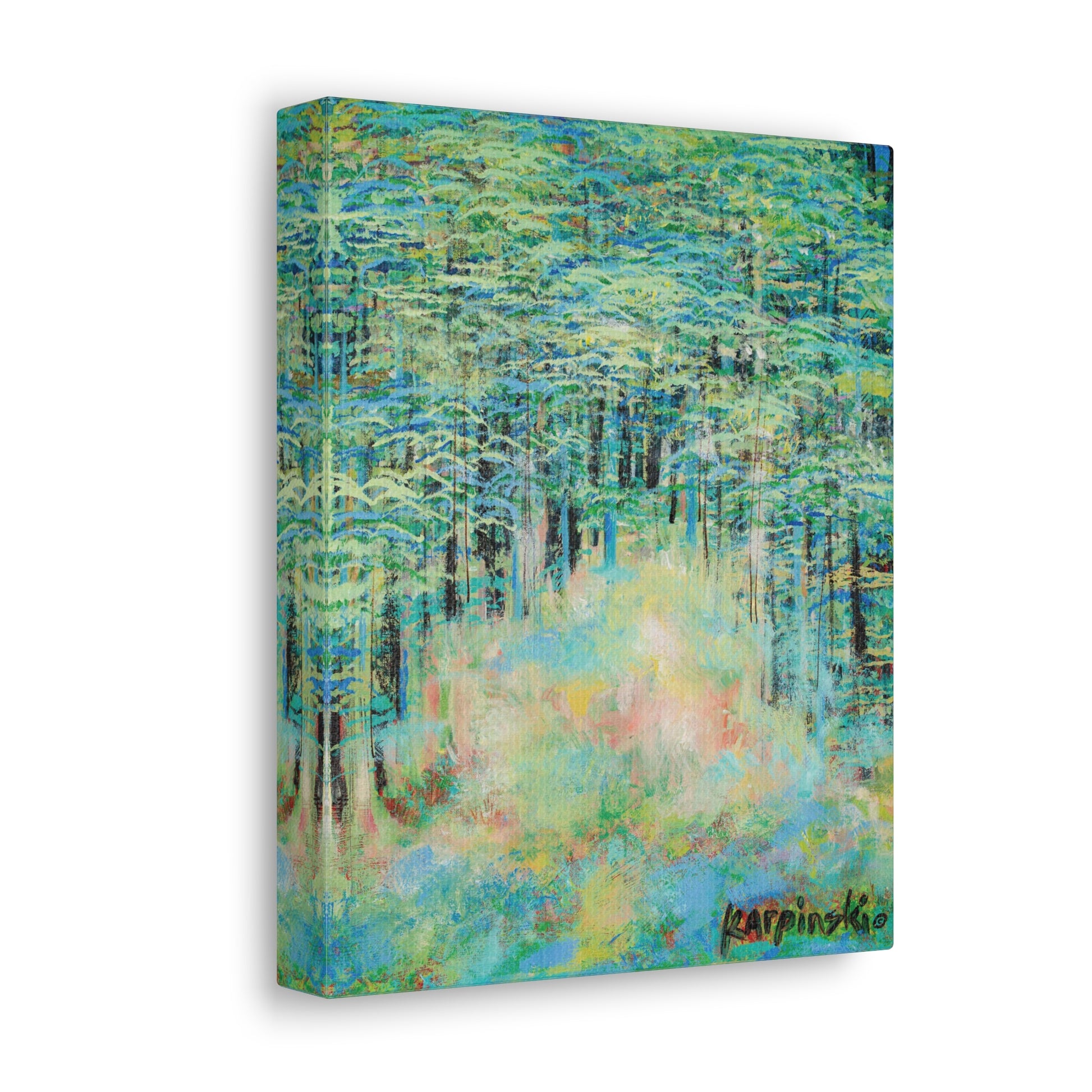 A gallery wrap canvas print of an original painting by Leslie Karpinski titled "Springtime Forest". A cool and refreshing landscape art print available in many sizes. It would make a great piece for your living room, dining room, office or wherever you want to hang a beautiful canvas.