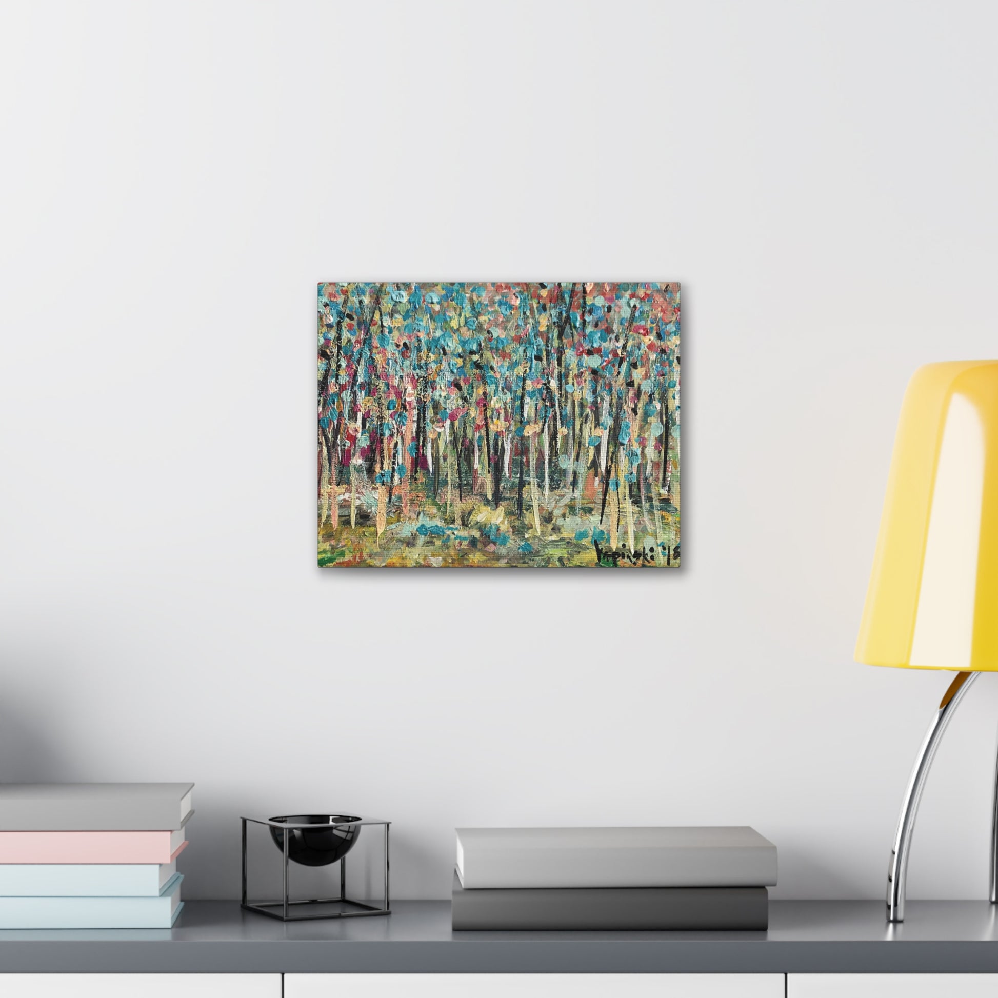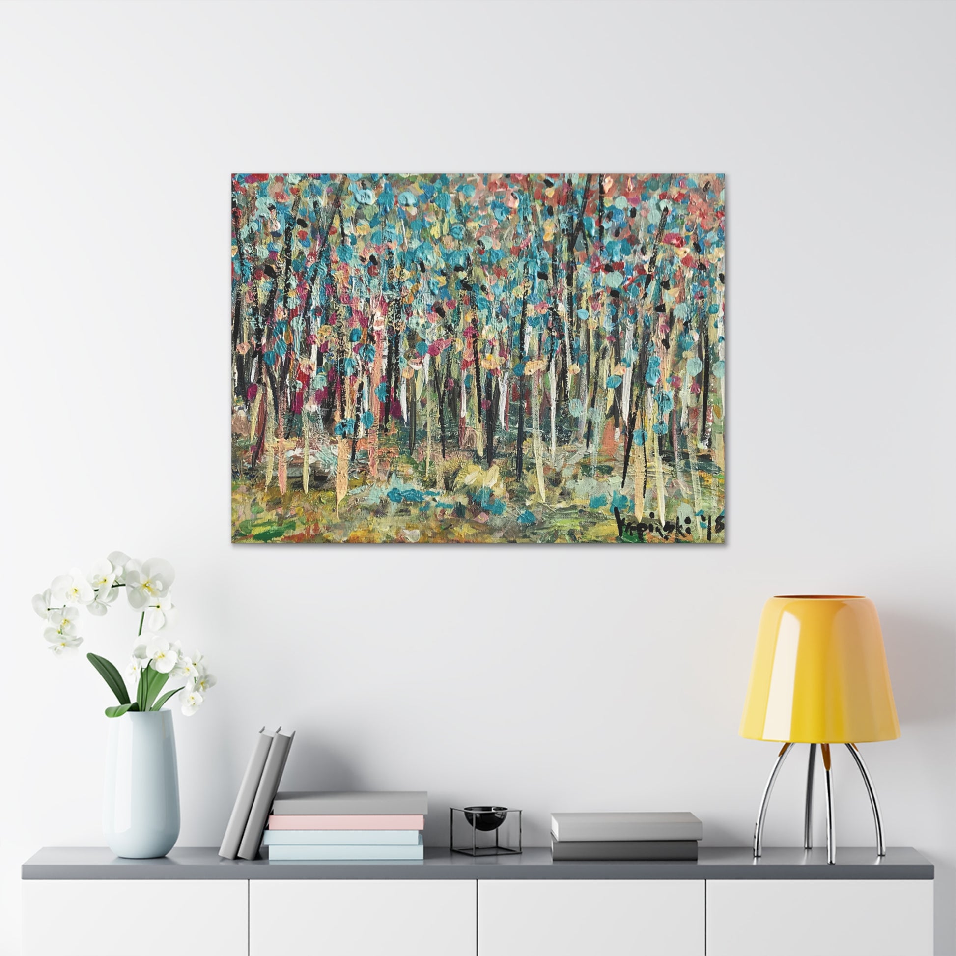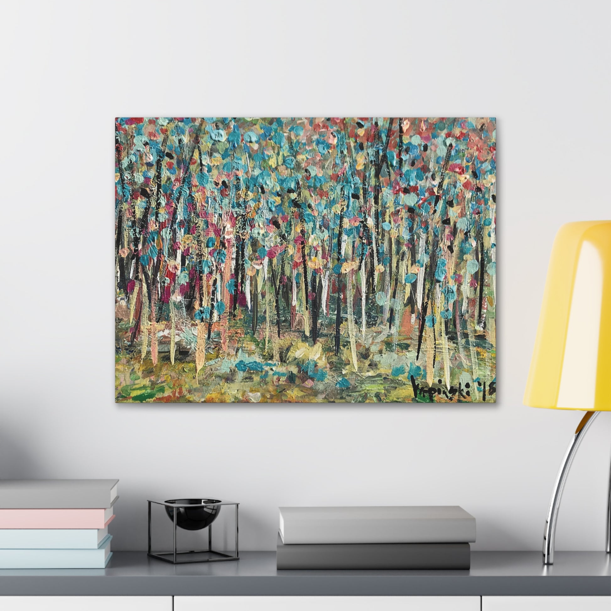 A gallery wrap canvas print of an original painting by Leslie Karpinski titled "Colorful Landscape". A bright contemporary painting featuring abstract trees and foliage with lots of texture.