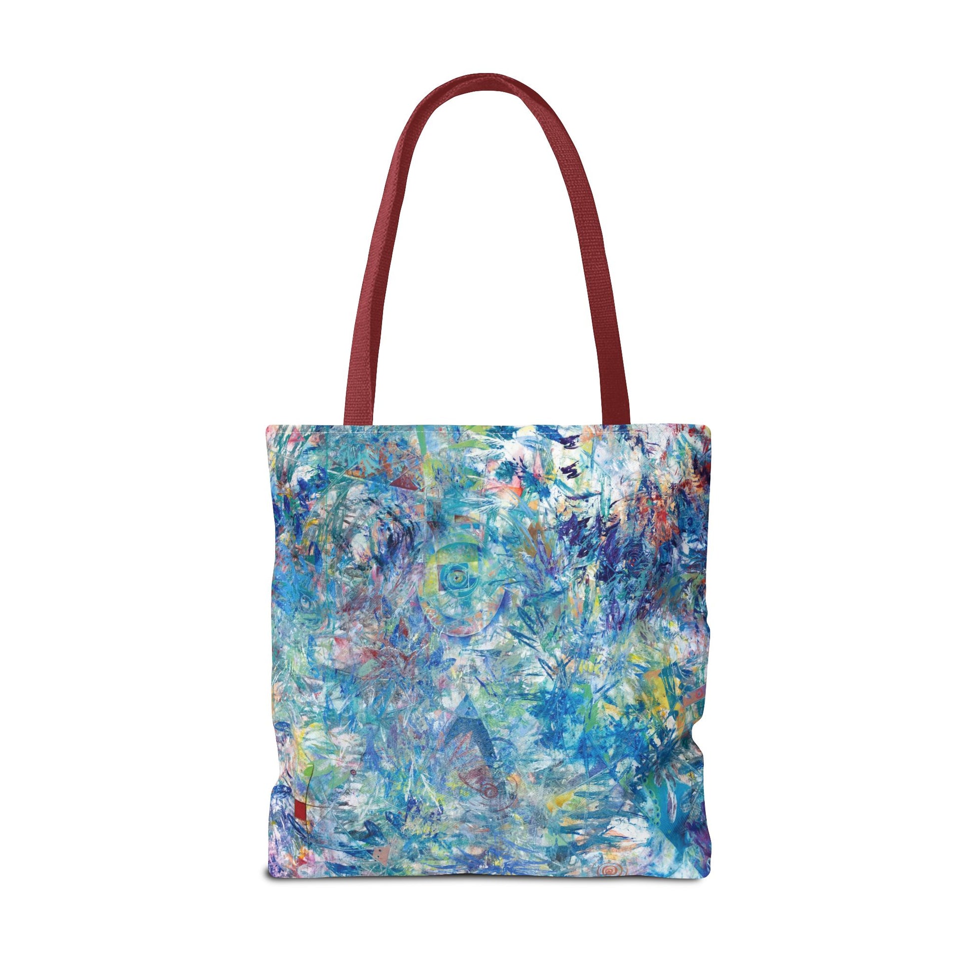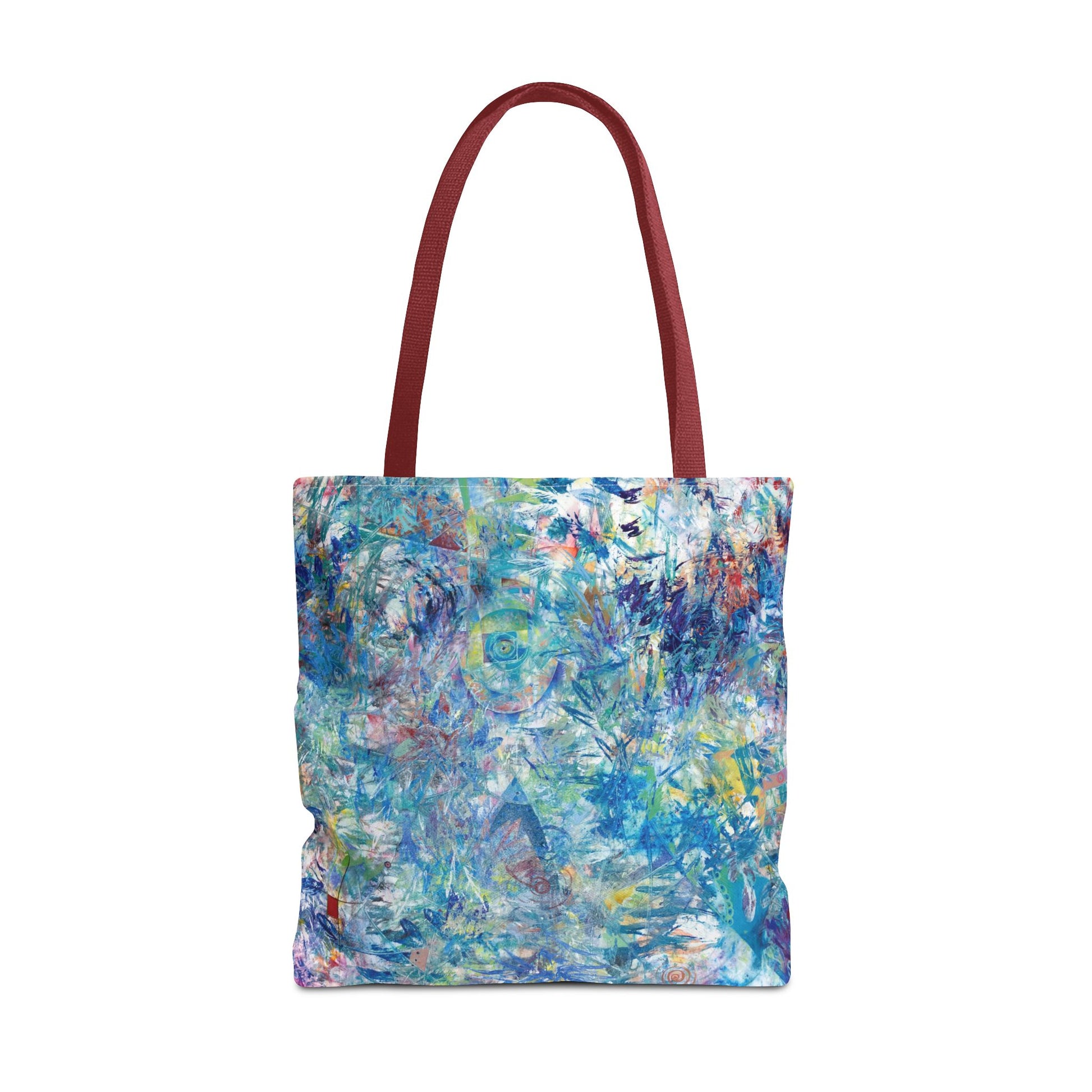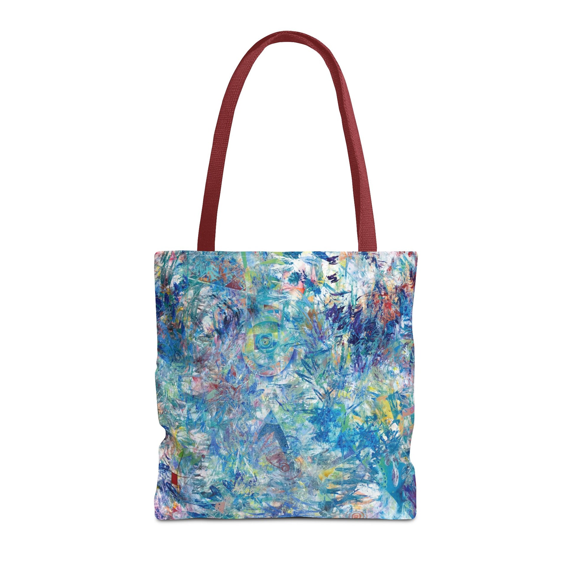 Leslie Karpinski's original artwork "Ascension" printed on a canvas tote bag. The bag is available in 3 sizes and with different color handles.