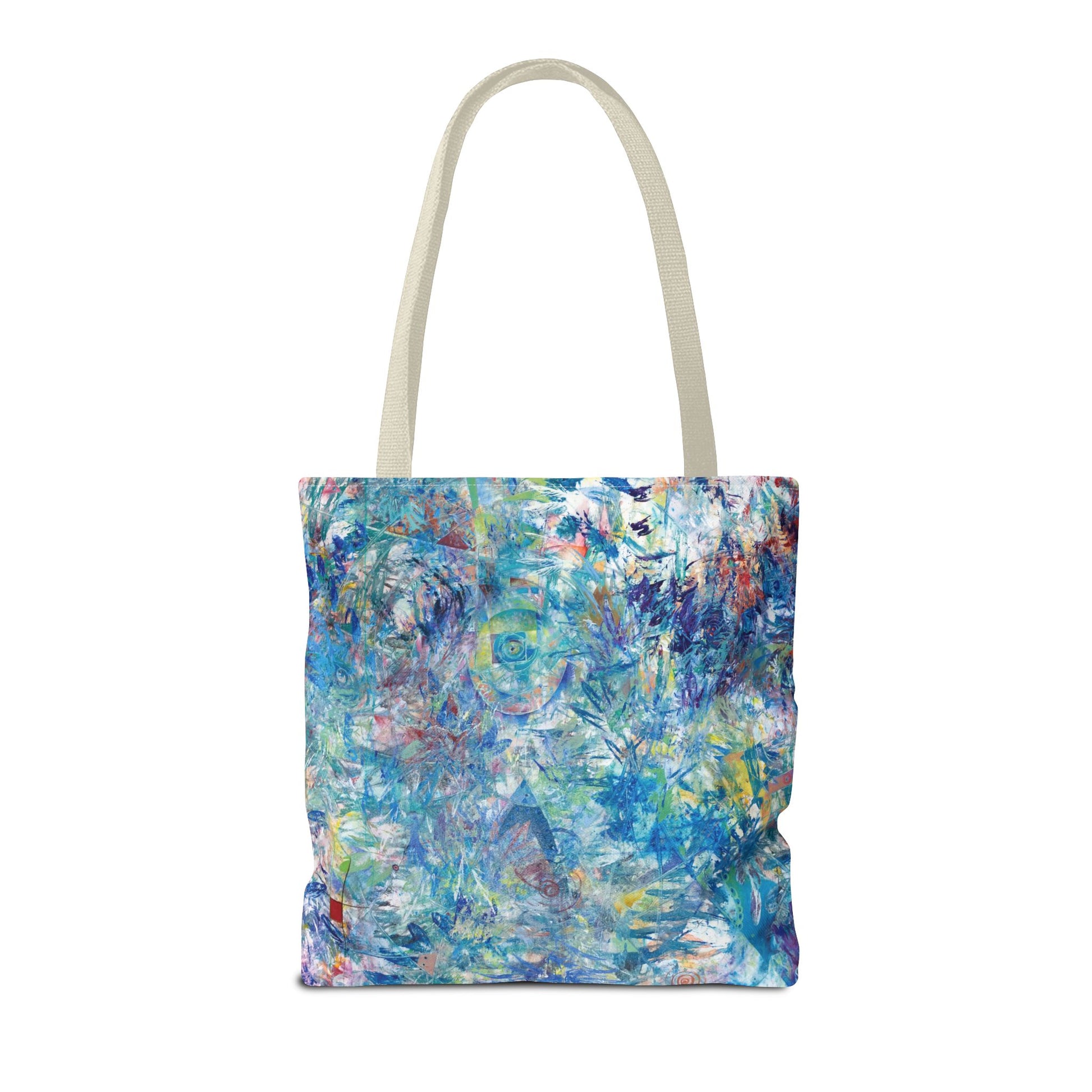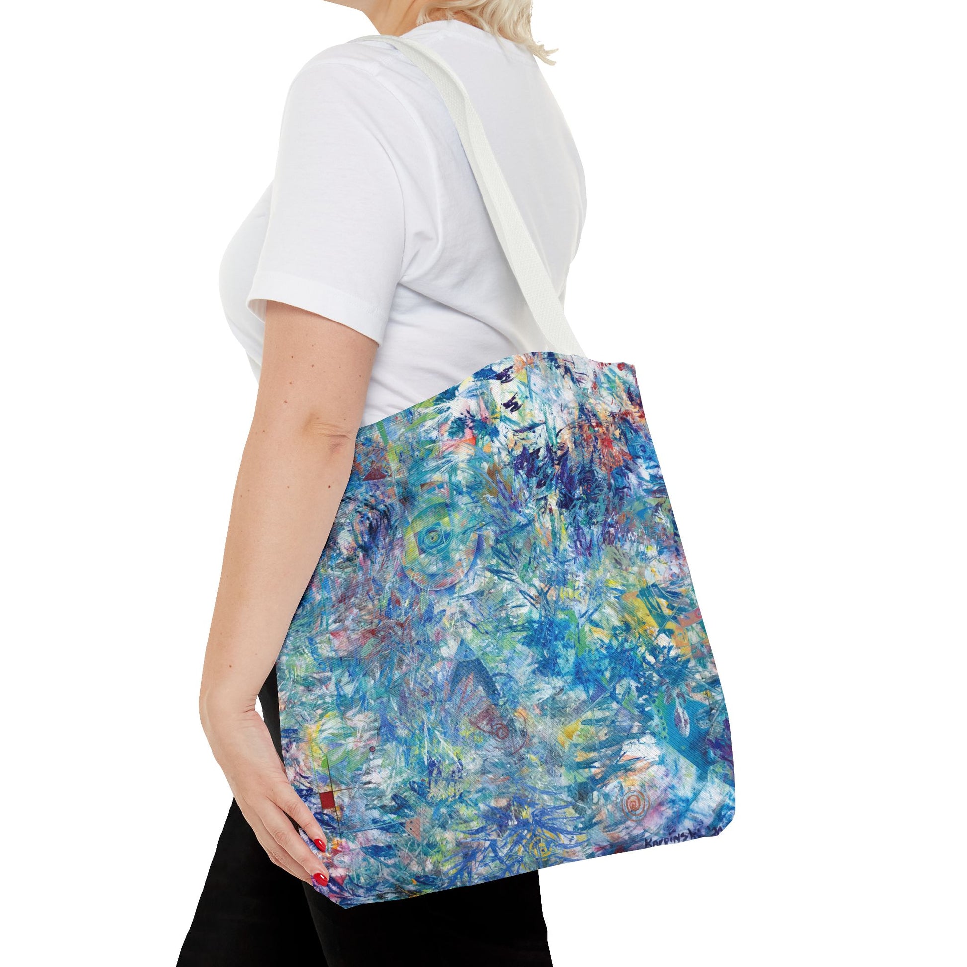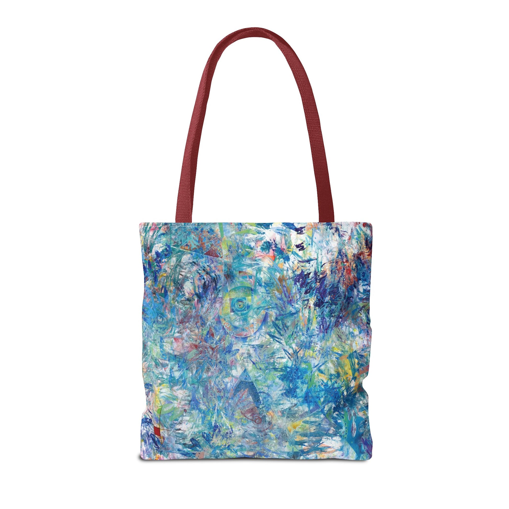Leslie Karpinski's original artwork "Ascension" printed on a canvas tote bag. The bag is available in 3 sizes and with different color handles.