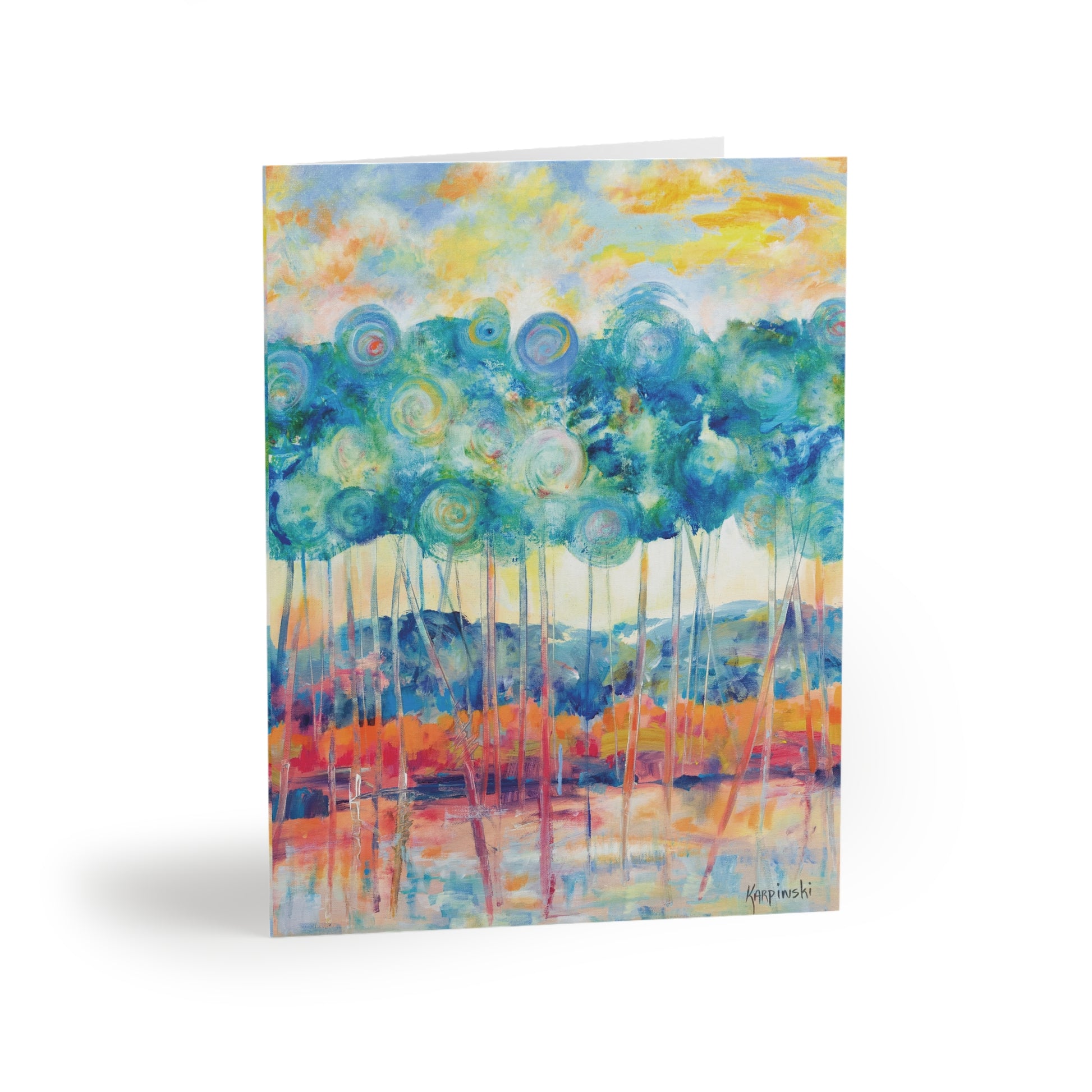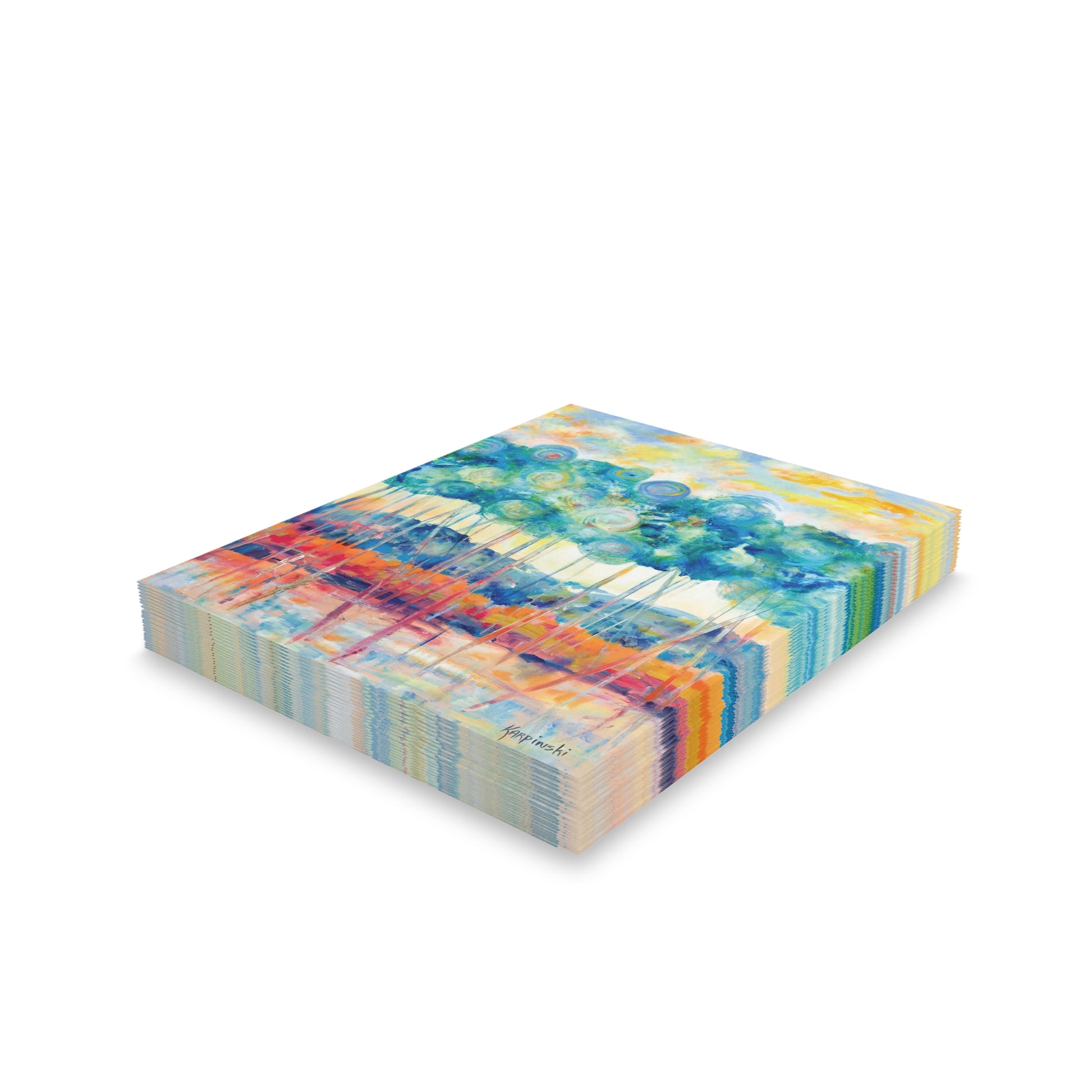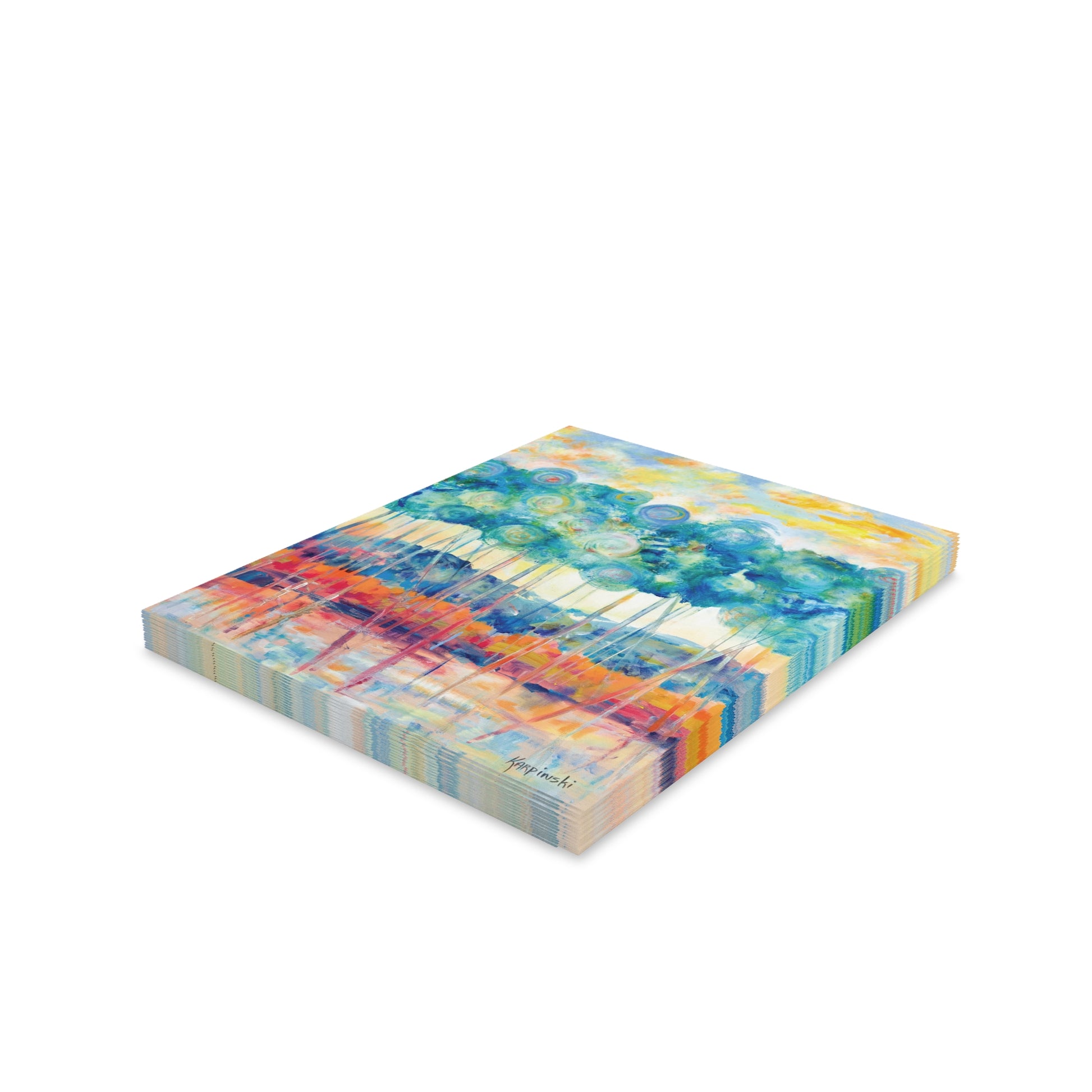 A multi pack of greeting cards with Leslie Karpinski's original painting "Canopy at Sunset". We have 8, 16 and 24 packs. The cards measure 4.25" x 5.5". Each greeting card come with a white envelope. The inside is blank.