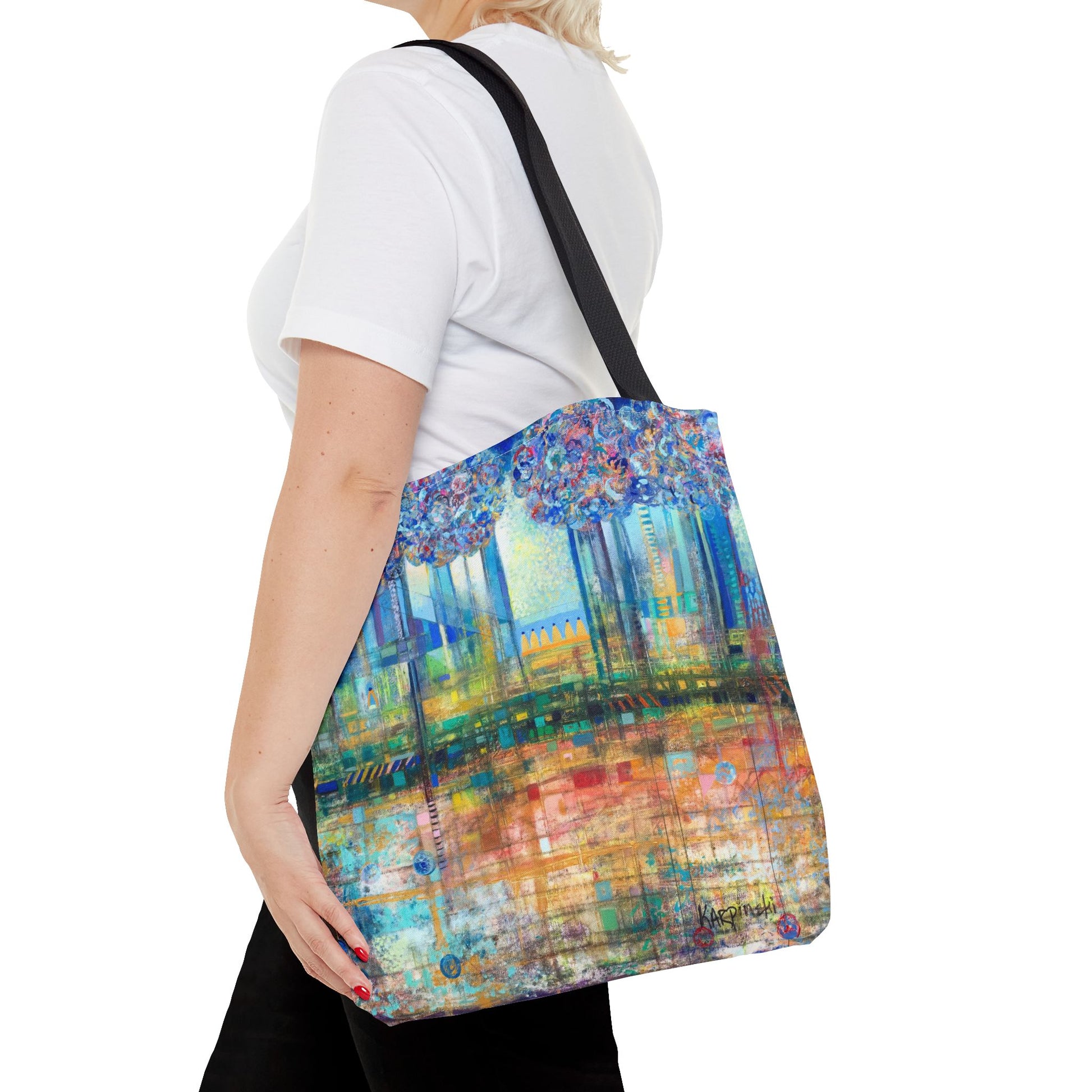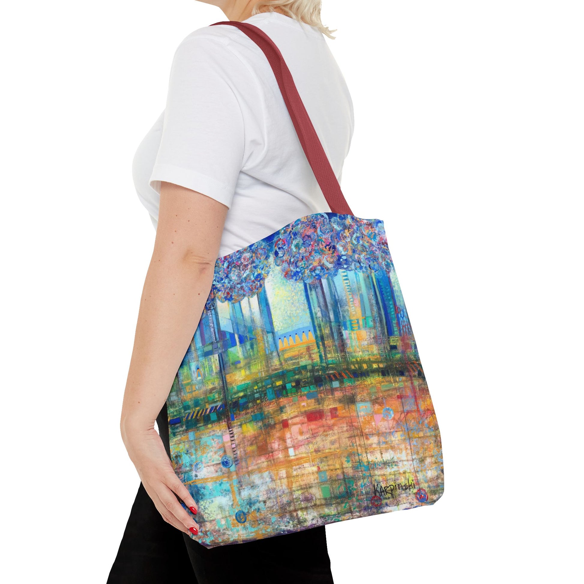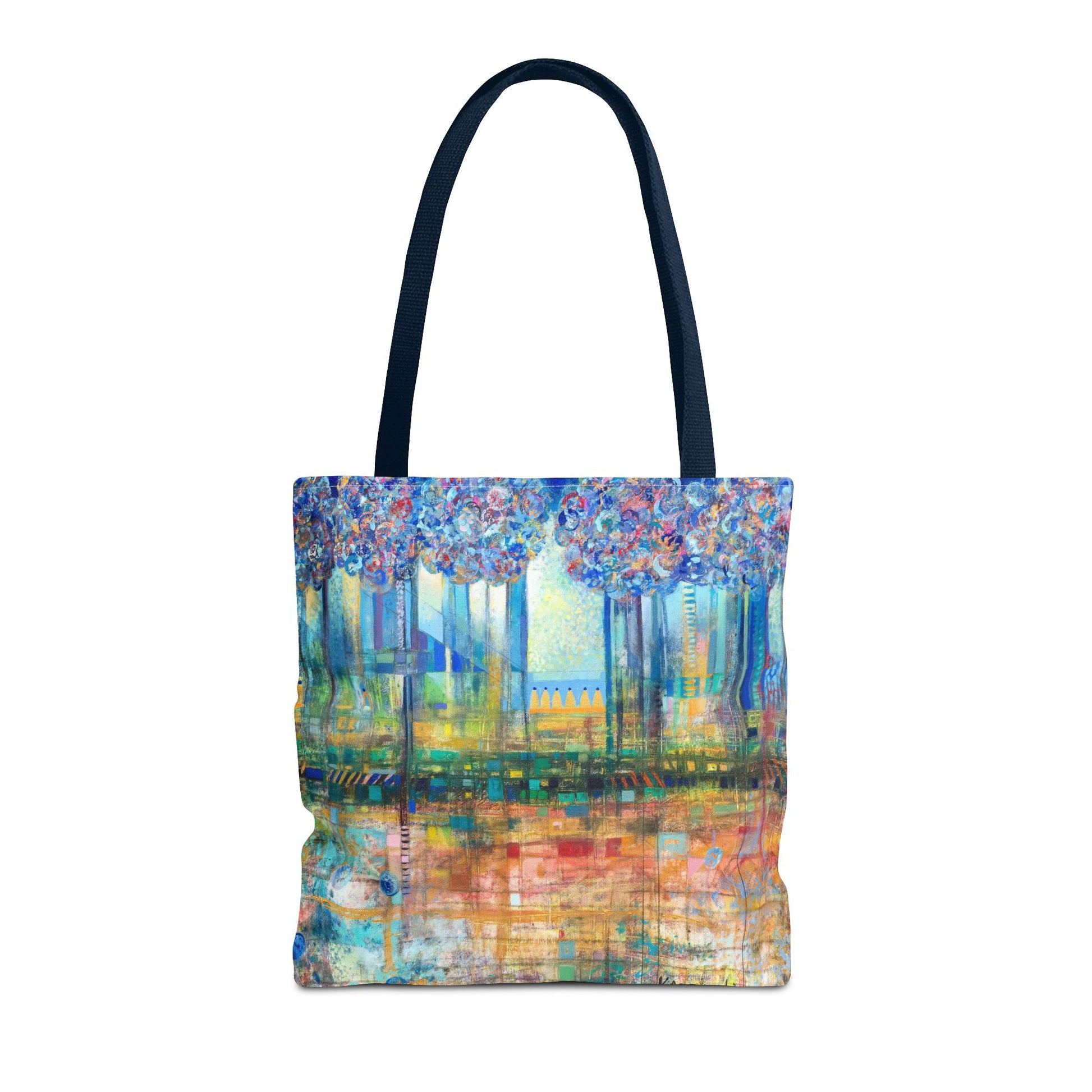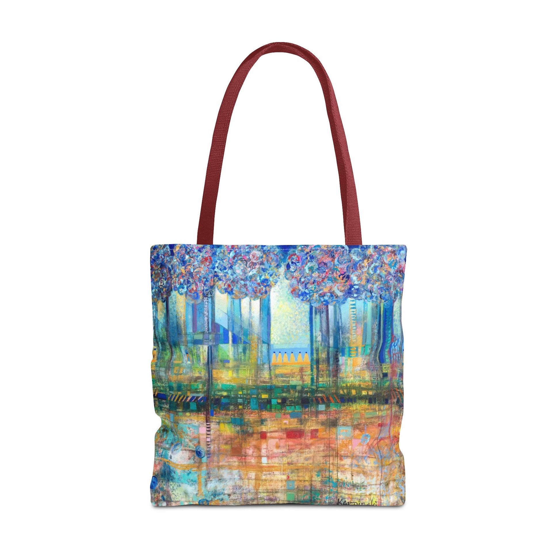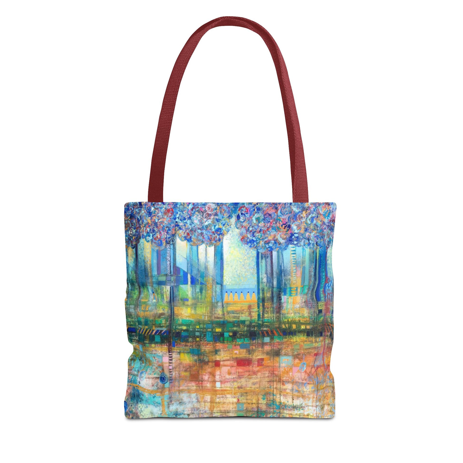 Leslie Karpinski's original artwork "Rise Up to The Gates of Glory" printed on a canvas tote bag. The front and backside of the bag show different parts of the painting. The bag is available in 3 sizes and with different color handles.