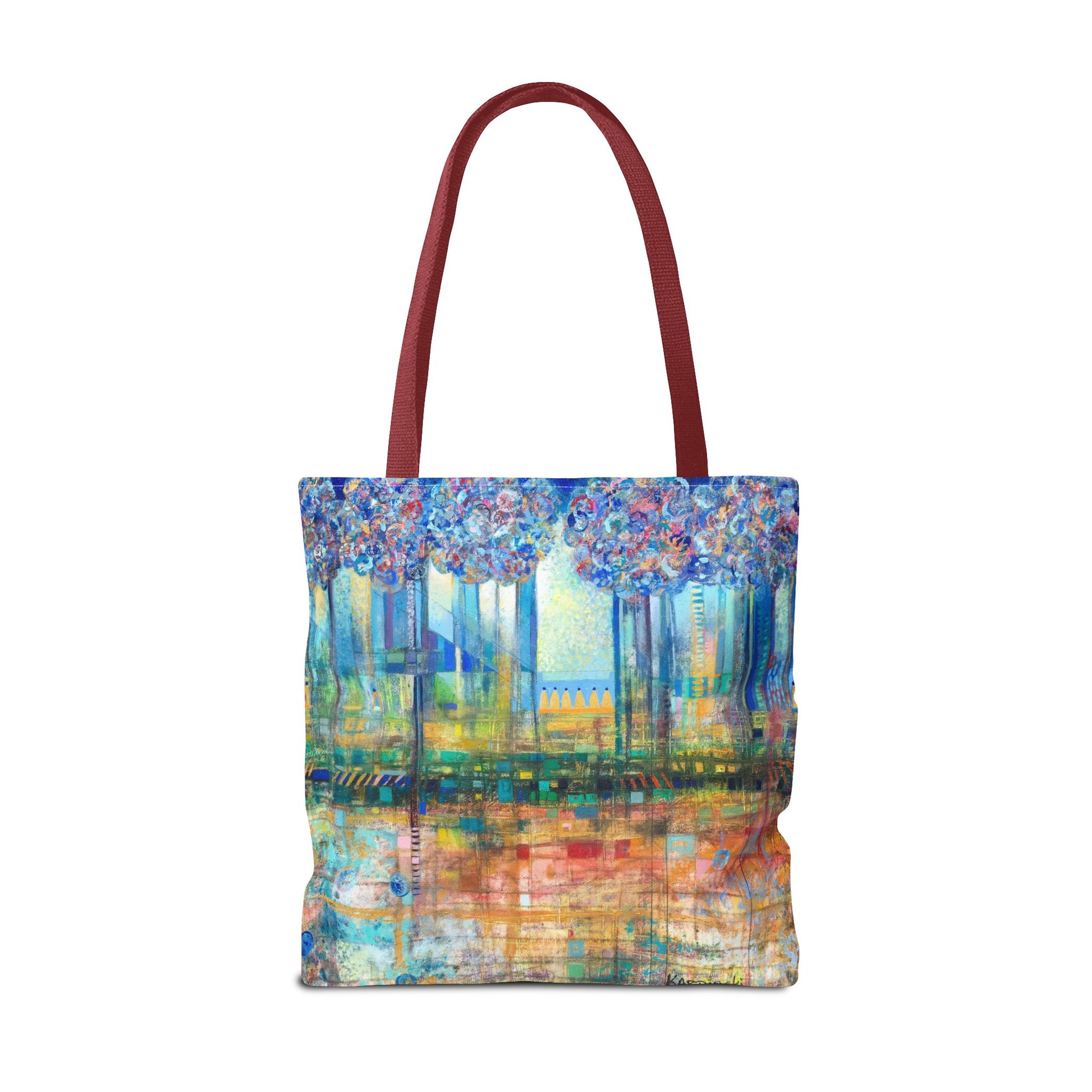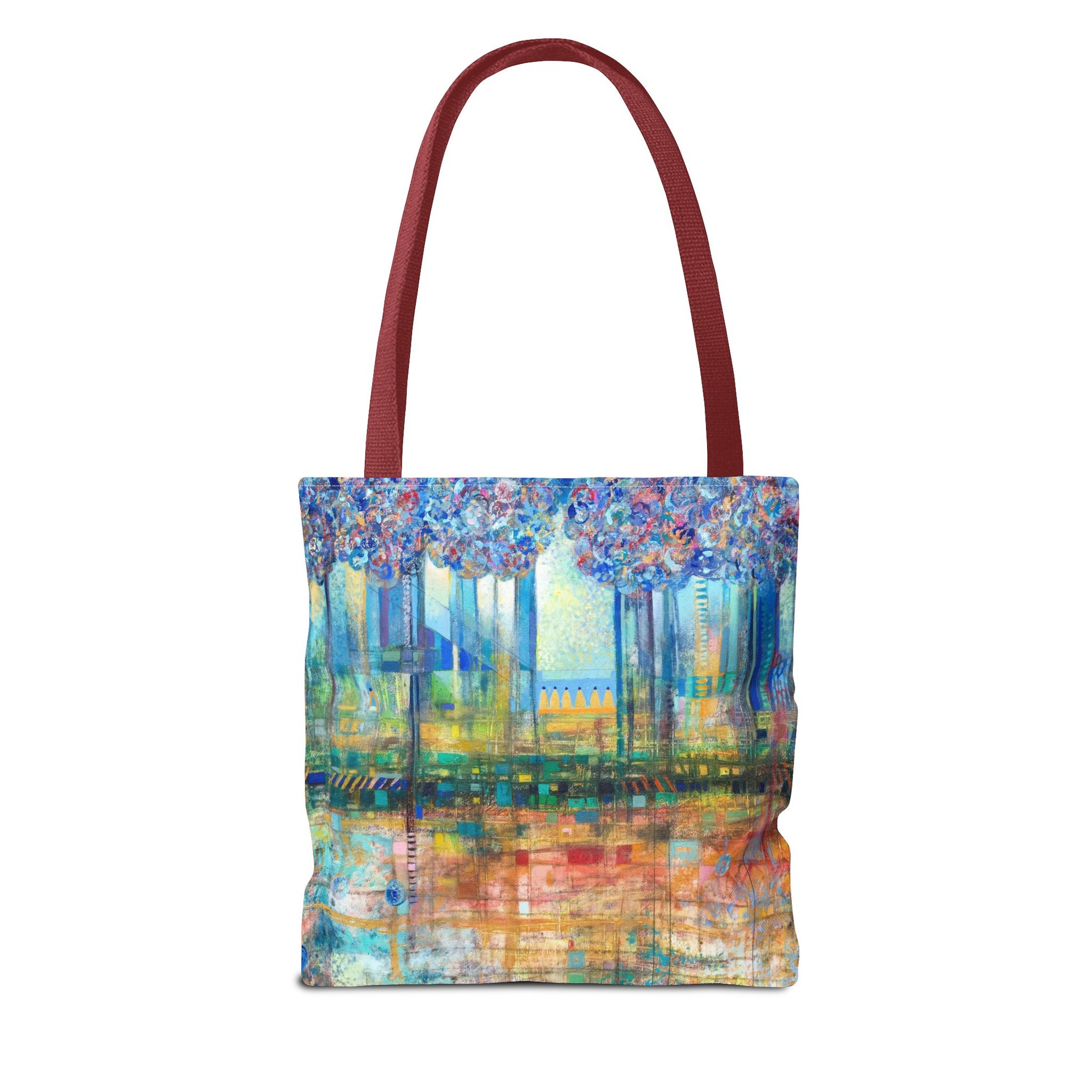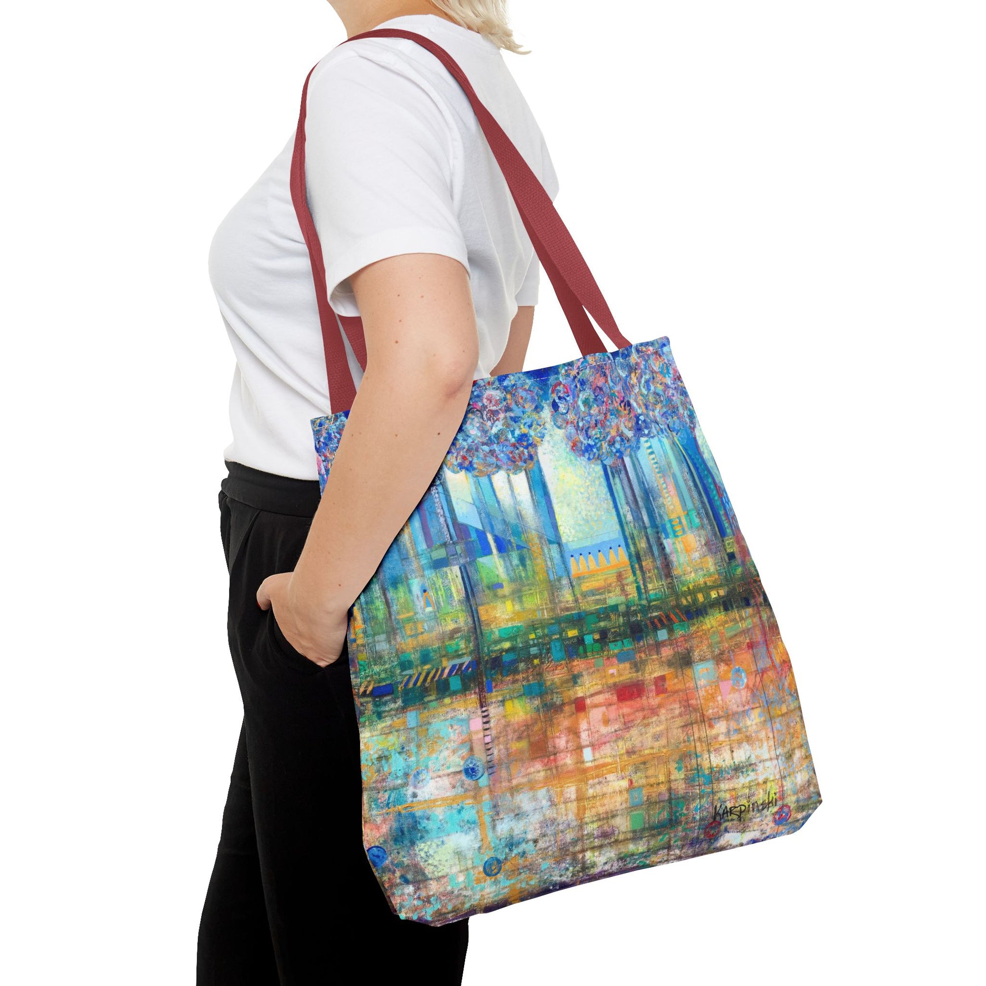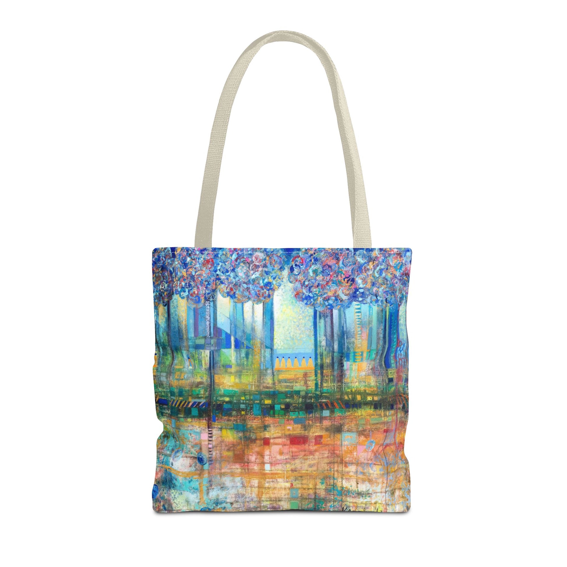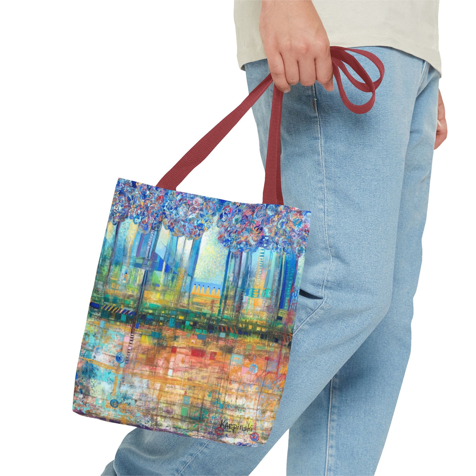 Leslie Karpinski's original artwork "Rise Up to The Gates of Glory" printed on a canvas tote bag. The front and backside of the bag show different parts of the painting. The bag is available in 3 sizes and with different color handles.