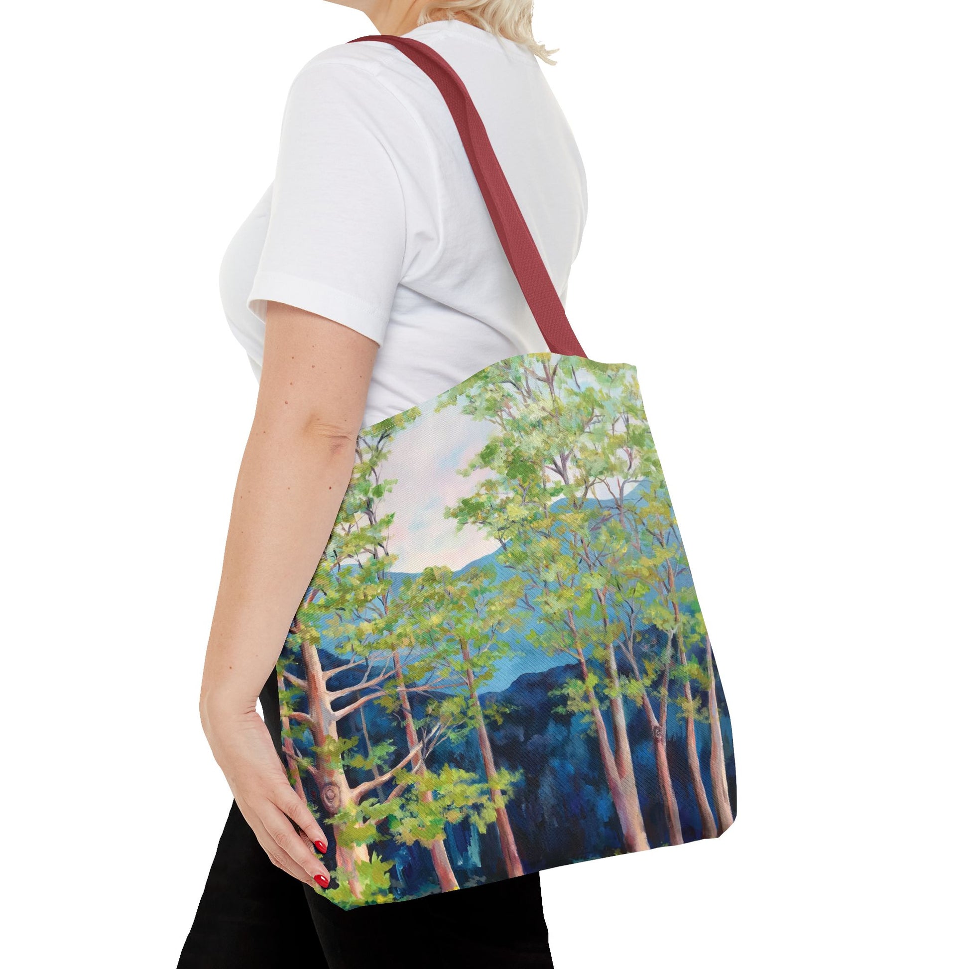 Leslie Karpinski's canvas artwork "Strong Tree" printed on a canvas tote bag. The bag is available in 3 sizes and with 5 different color handles.