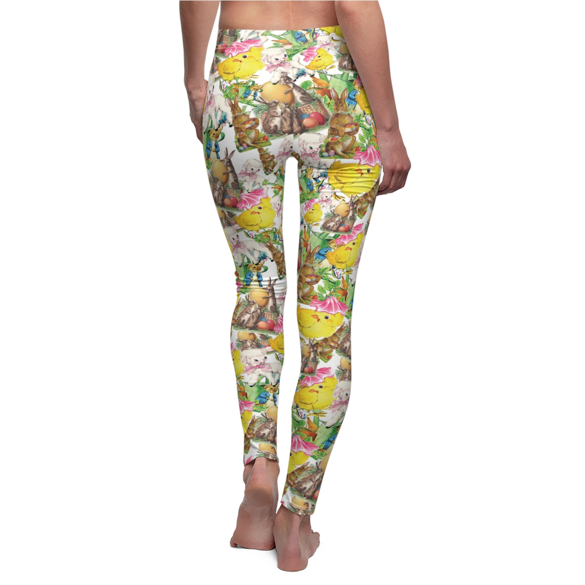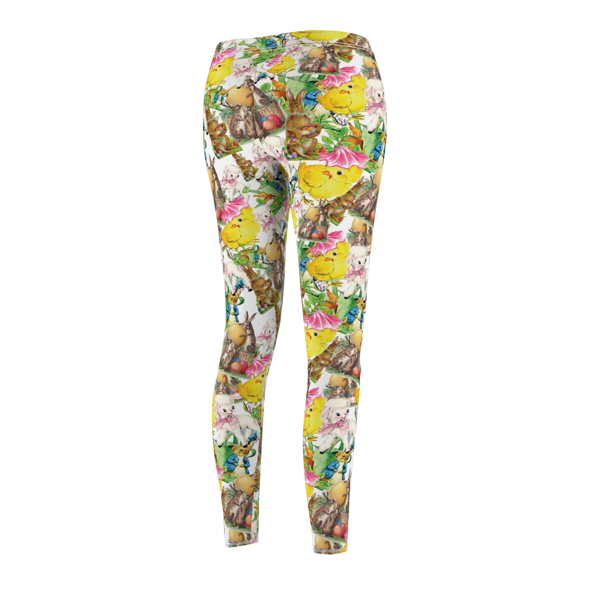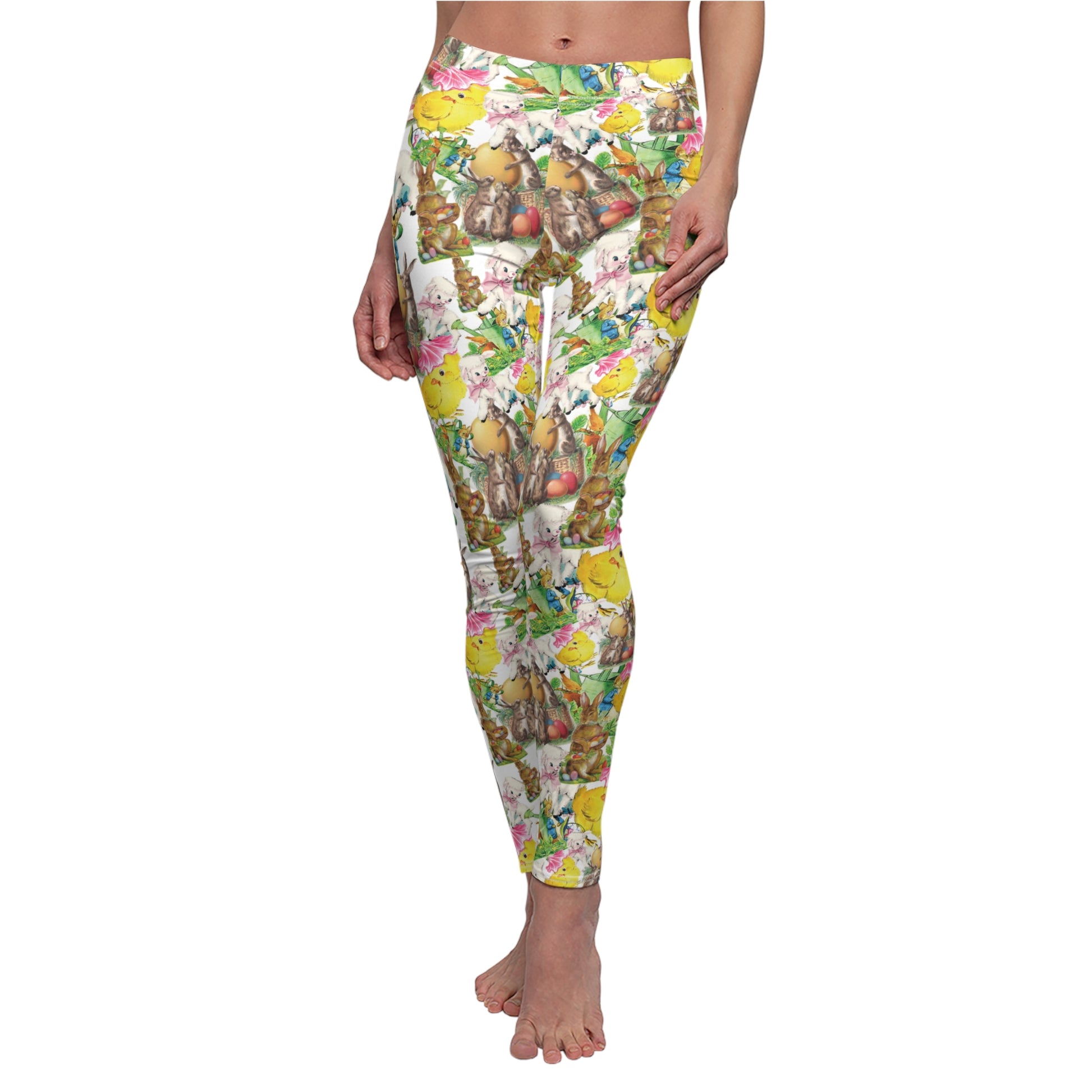 Our cute vintage Easter images printed on soft and comfortable womens leggings. The design is full of bunnies, chicks and lambs from vintage greeting cards. The fabric is 95% polyester and 5% spandex.