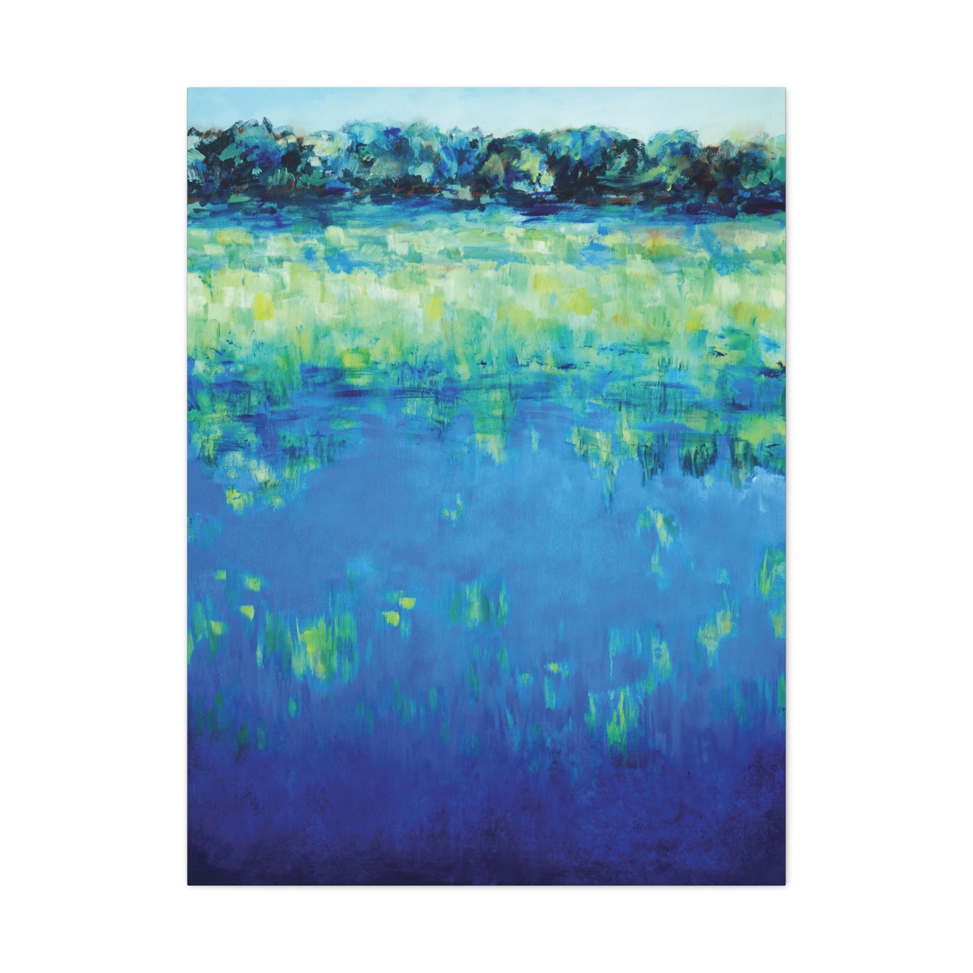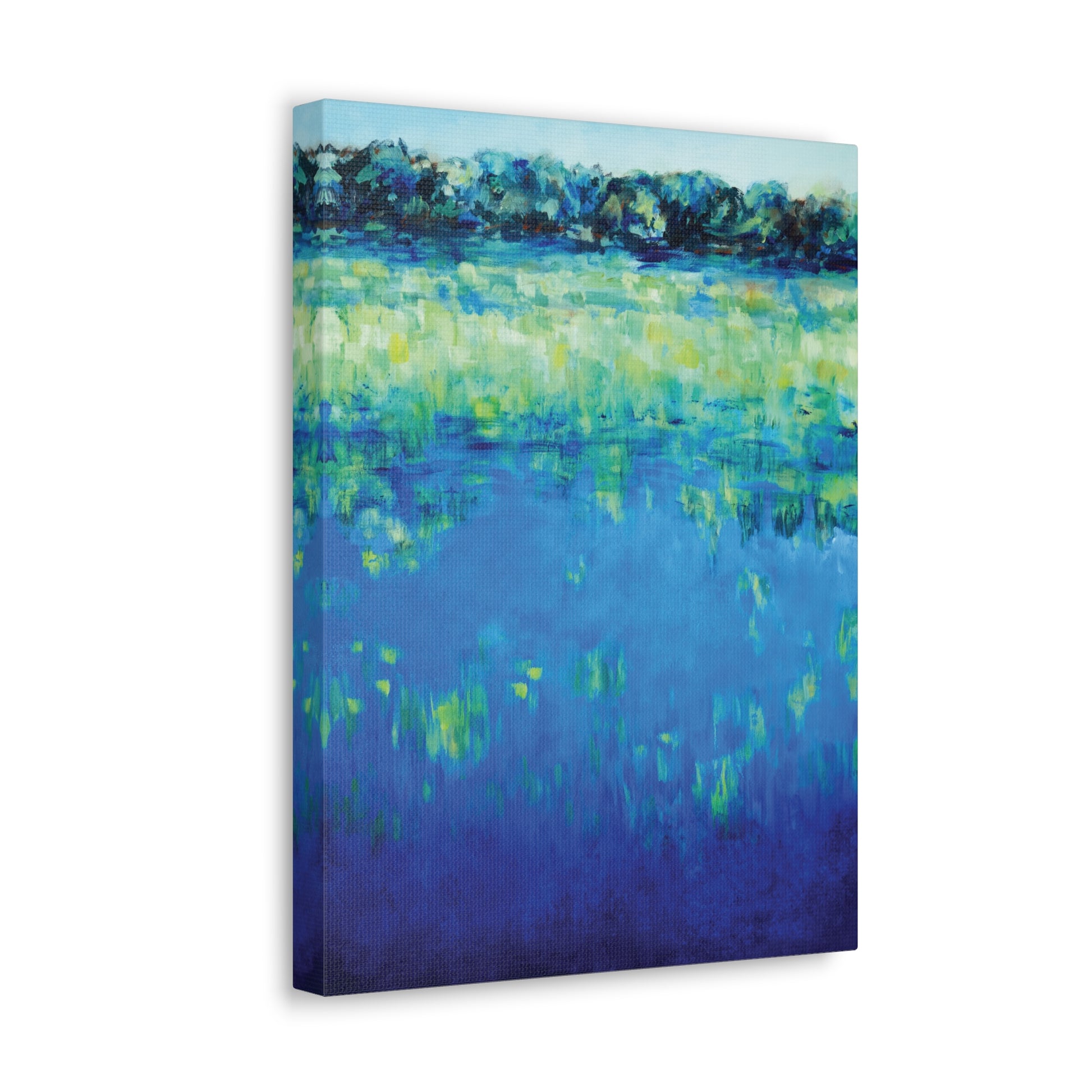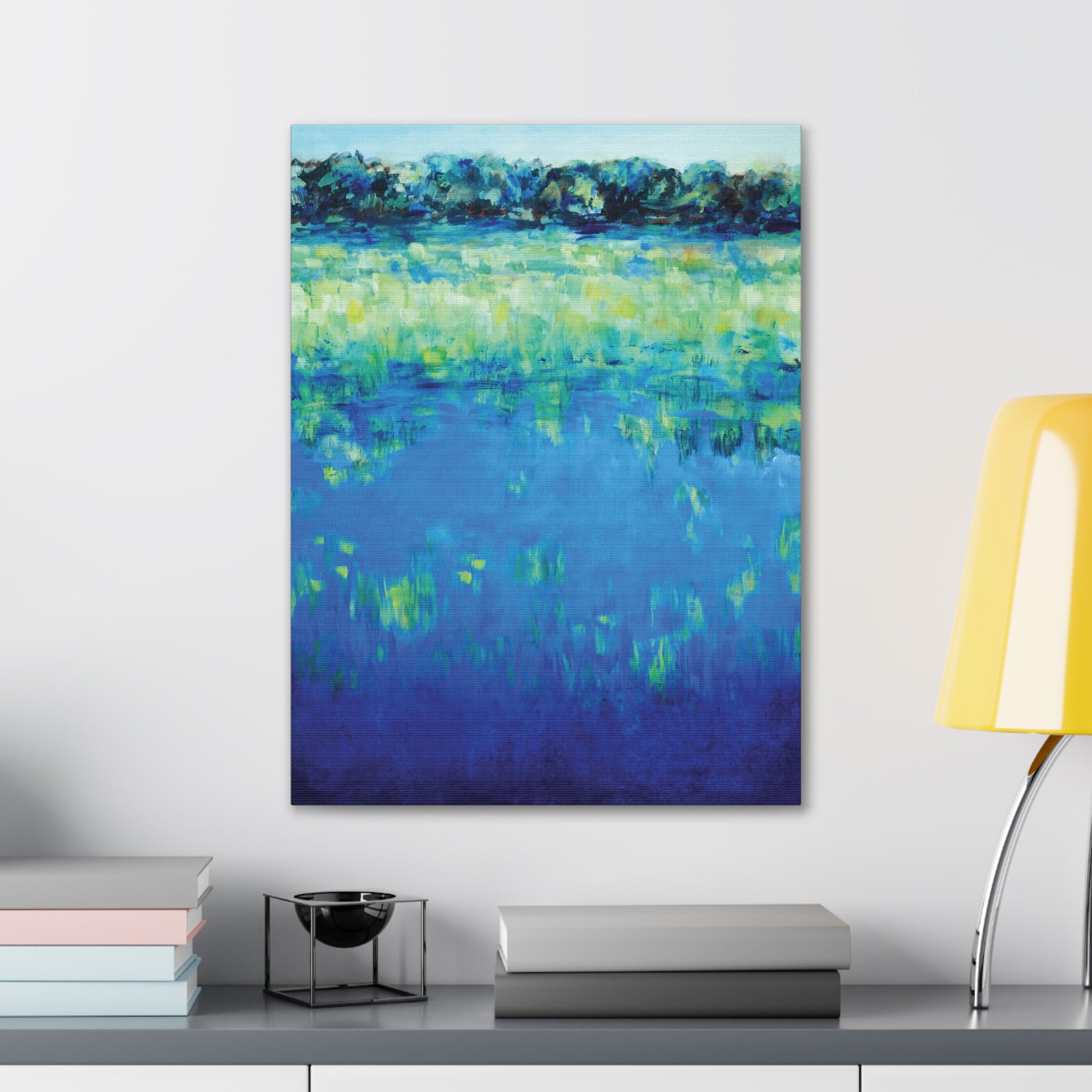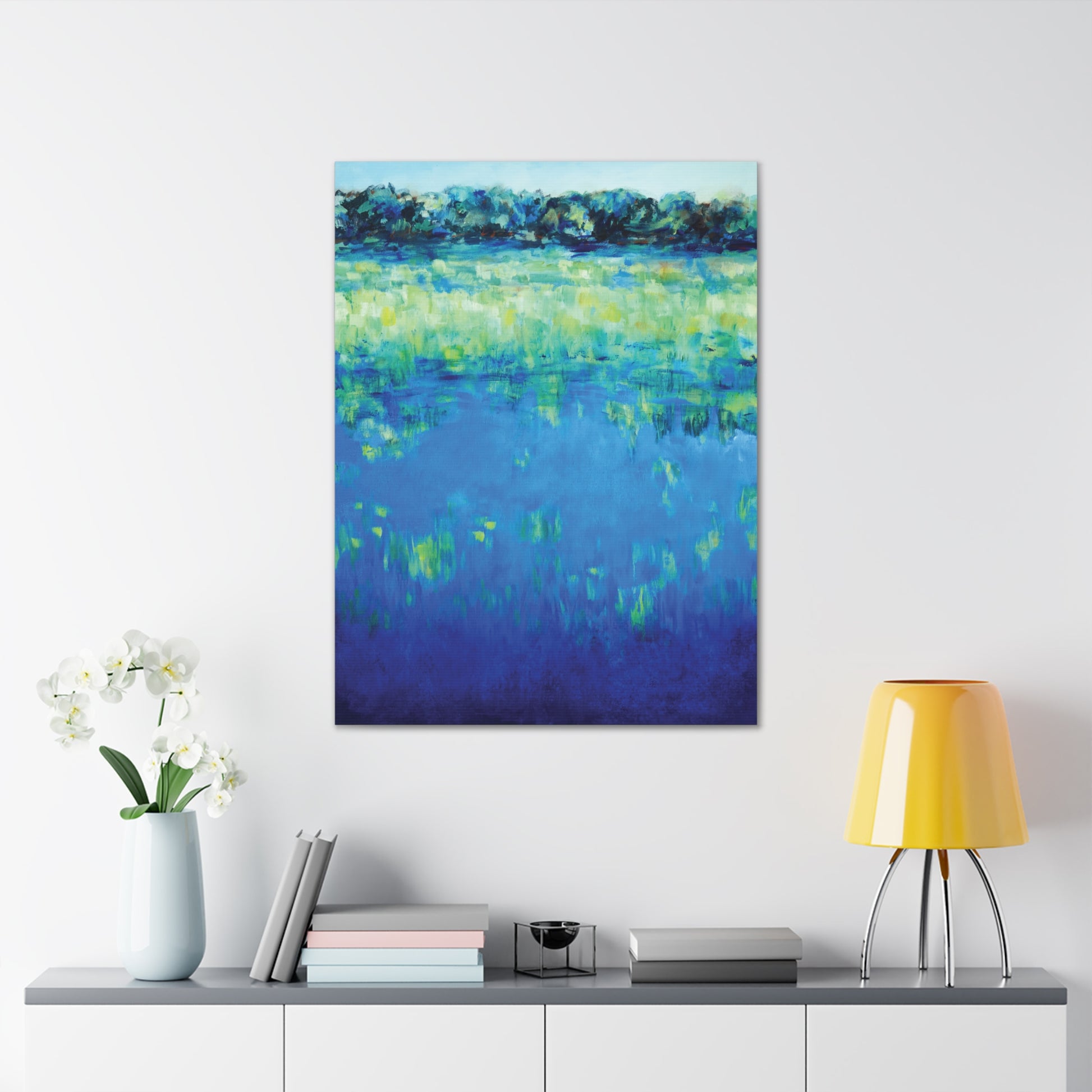 A gallery wrap canvas print of an original painting by Leslie Karpinski titled "Waters Edge 1". A beautiful blue green waterscape with a serene and relaxing feel, pair this with "Waters Edge 2" for a diptych to hang on your walls.